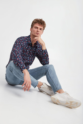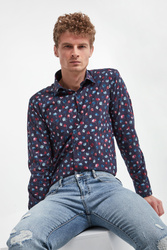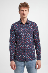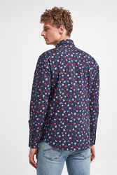 Koszula marki Karl Lagerfeld w granatowym kolorze. Na całości nadruk z motywem liści. Taliowany fason modern fit. Klasyczny kołnierz. Zapinana za pomocą perłowych, sygnowanych guzików. Długie rękawy zakończone mankietami zapinanymi za pomocą guzików. Wykonana z nieco elastycznej bawełny.