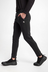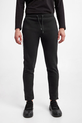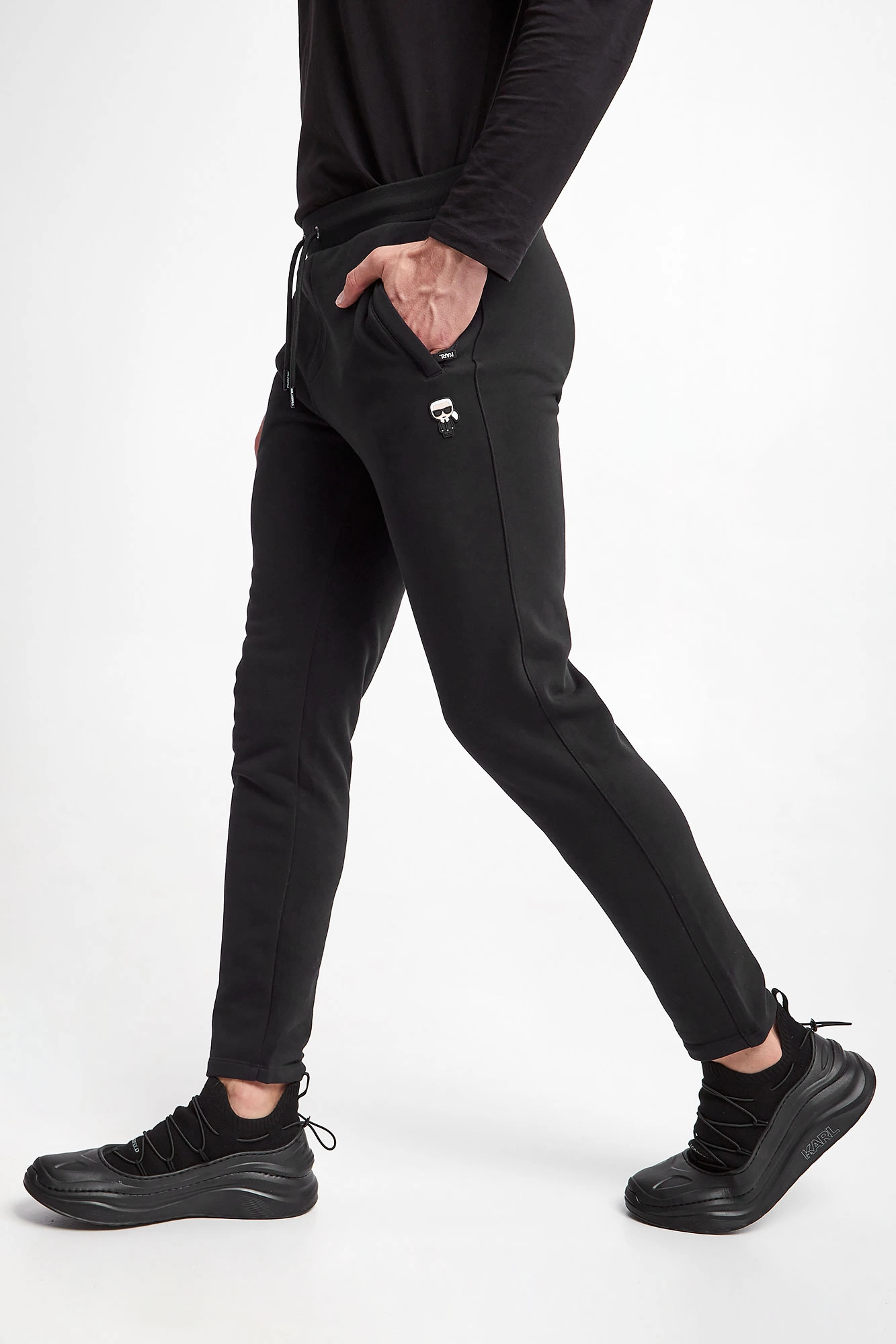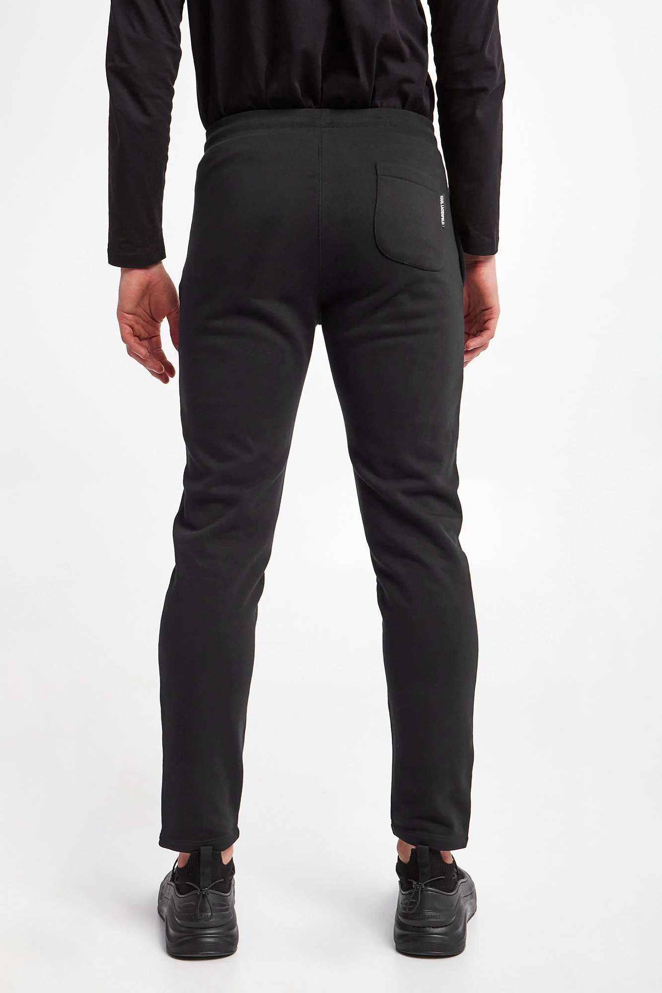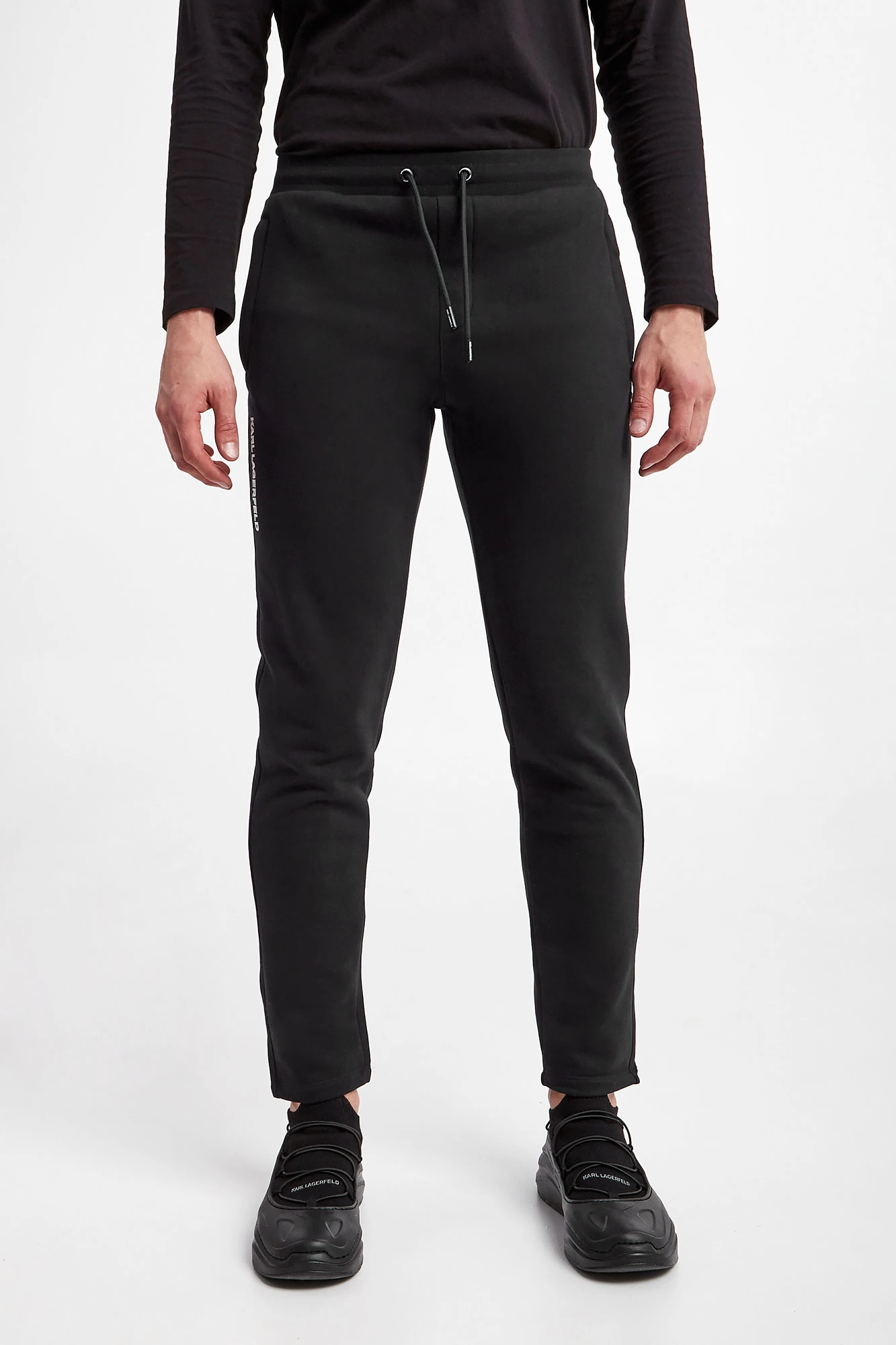 Spodnie dresowe marki Karl Lagerfeld w czarnym kolorze. Wykonane z nieco elastycznej bawełny. W talii ściągacz regulowany za pomocą troczków z sygnowanym agletem. Model z dwoma zapinanymi kieszeniami po boku i jedną z tyłu. Z przodu gumowana aplikacja z nazwą i logo marki. Fason typu regular.