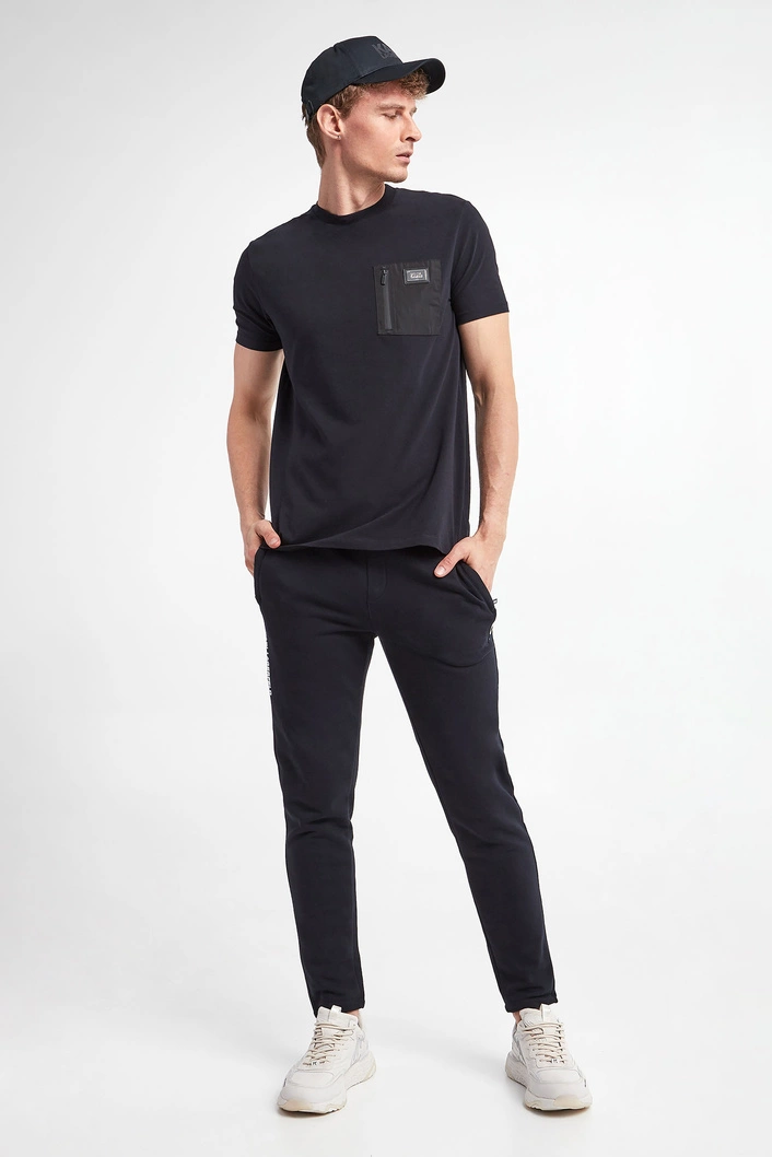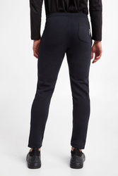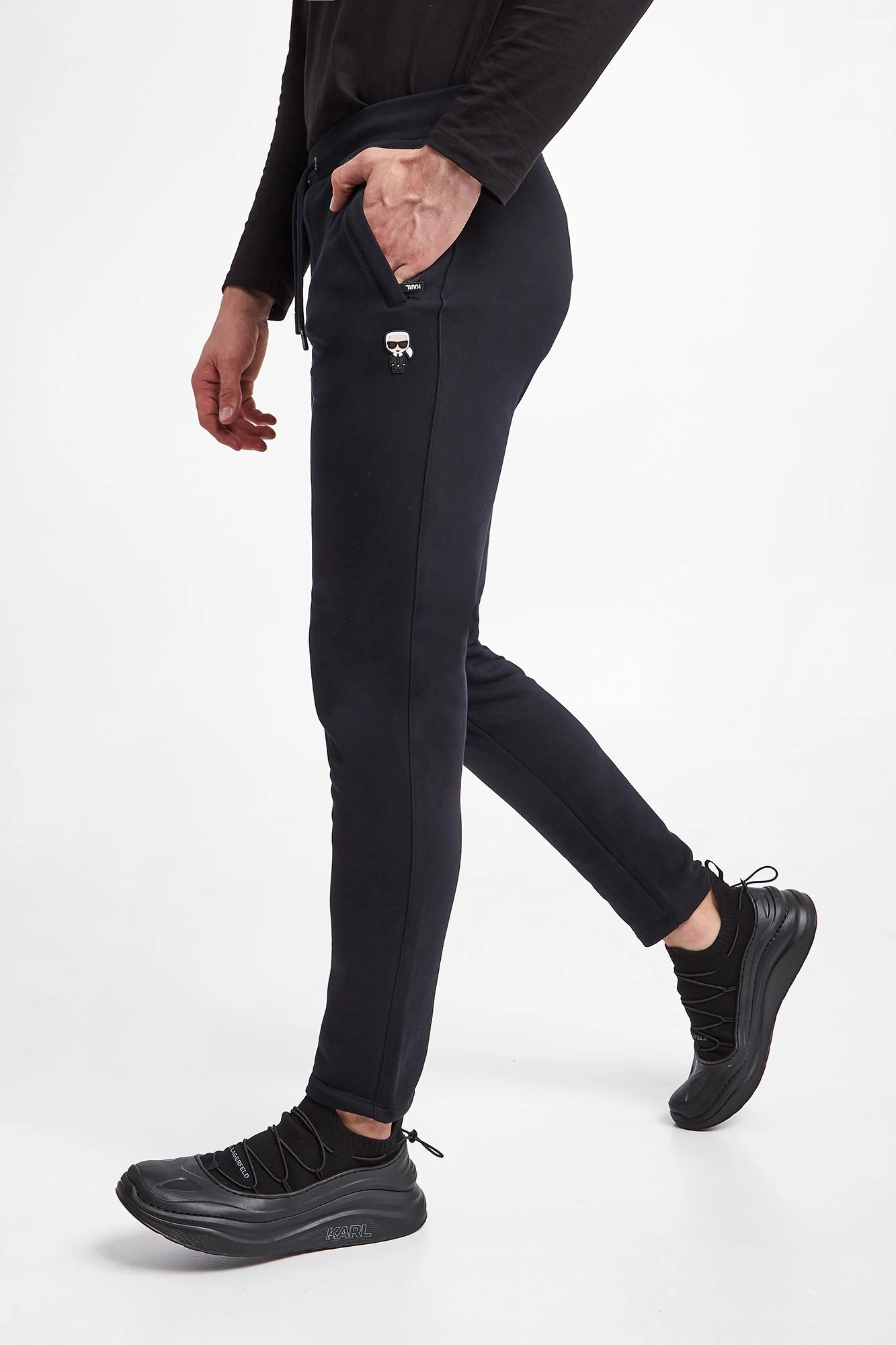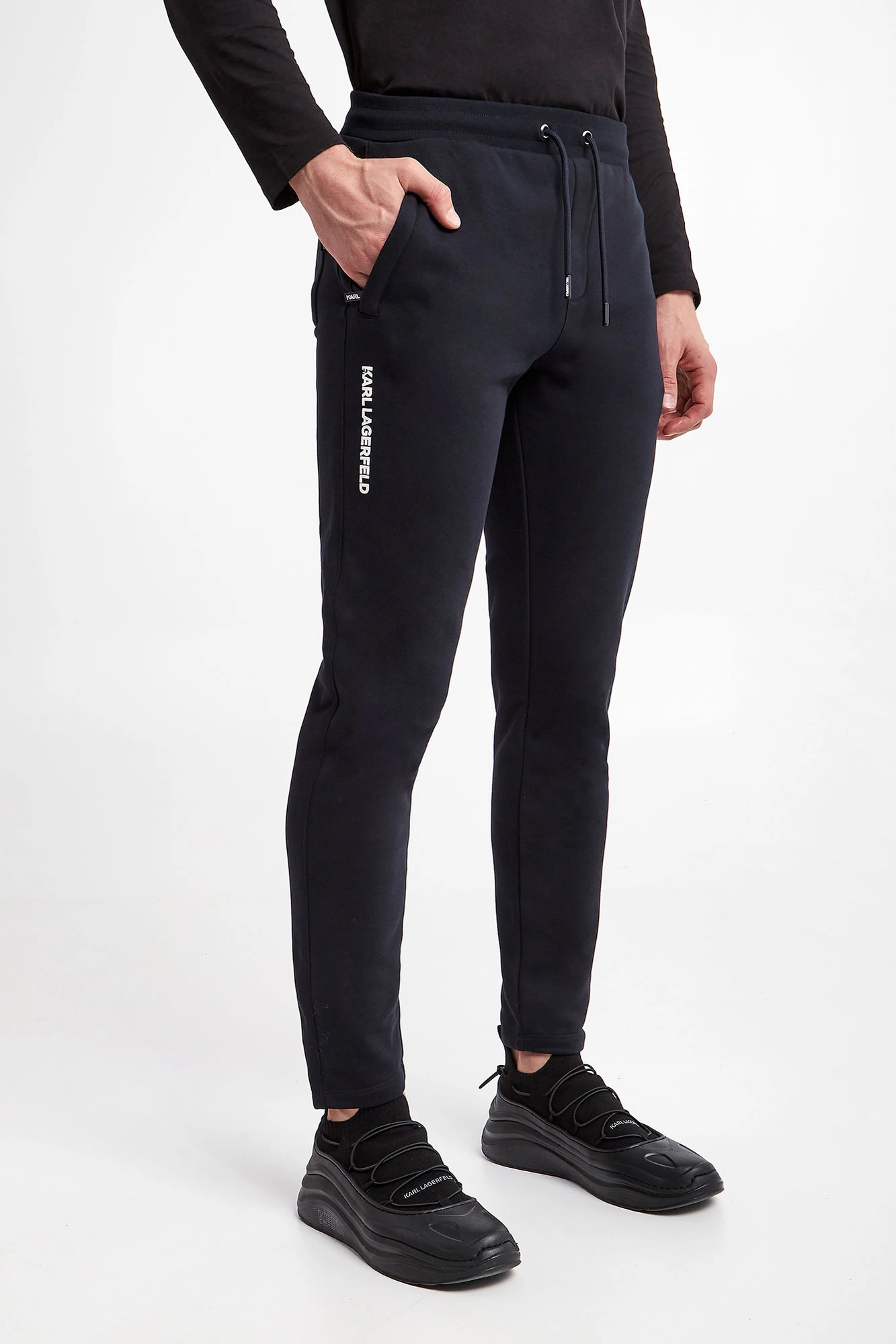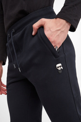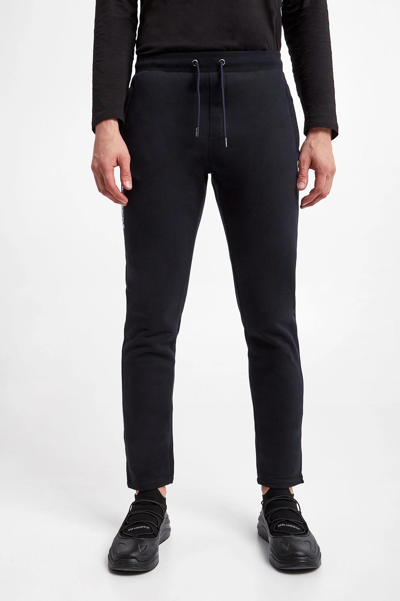 Spodnie dresowe marki Karl Lagerfeld w granatowym kolorze. Wykonane z nieco elastycznej bawełny. W talii ściągacz regulowany za pomocą troczków z sygnowanym agletem. Model z dwoma zapinanymi kieszeniami po boku i jedną z tyłu. Z przodu gumowana aplikacja z nazwą i logo marki. Fason typu slim.