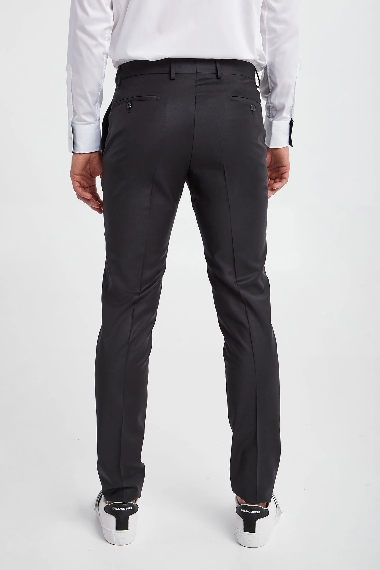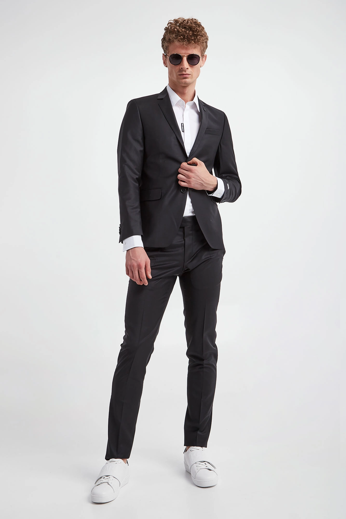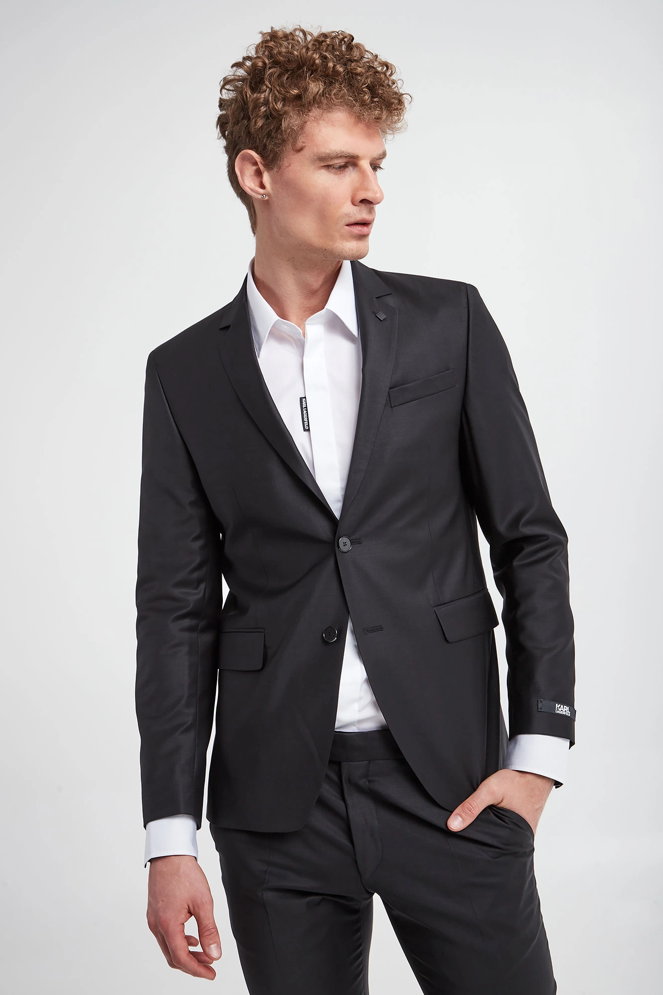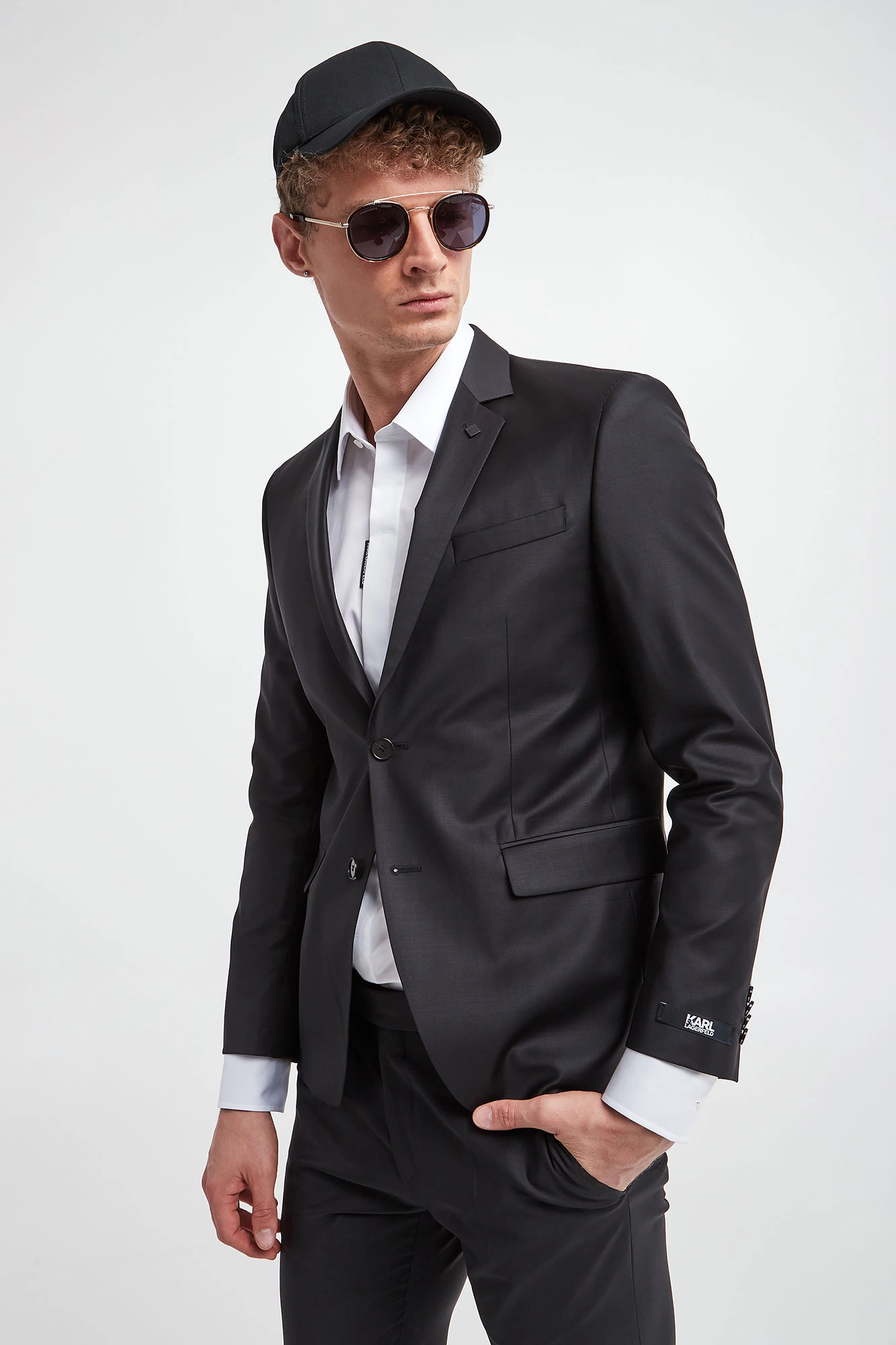 Garnitur marki Karl Lagerfeld w czarnym kolorze. Marynarka zapinana za pomocą guzików. Klasyczny kołnierz z klapami. Dwie boczne kieszenie z patkami. Rękawy zakończone zapinanymi mankietami. Z tyłu rozcięcia. Wykonana z wełny dziewiczej z domieszką elastycznych włókien. Wyściółka sygnowana z czystej wiskozy. Wewnątrz dodatkowe cztery kieszenie. Fason slim. Spodnie zapinane na zamek i zakładki. W pasie szlufki. Nogawki w kant. Model z czteroma kieszeniami.