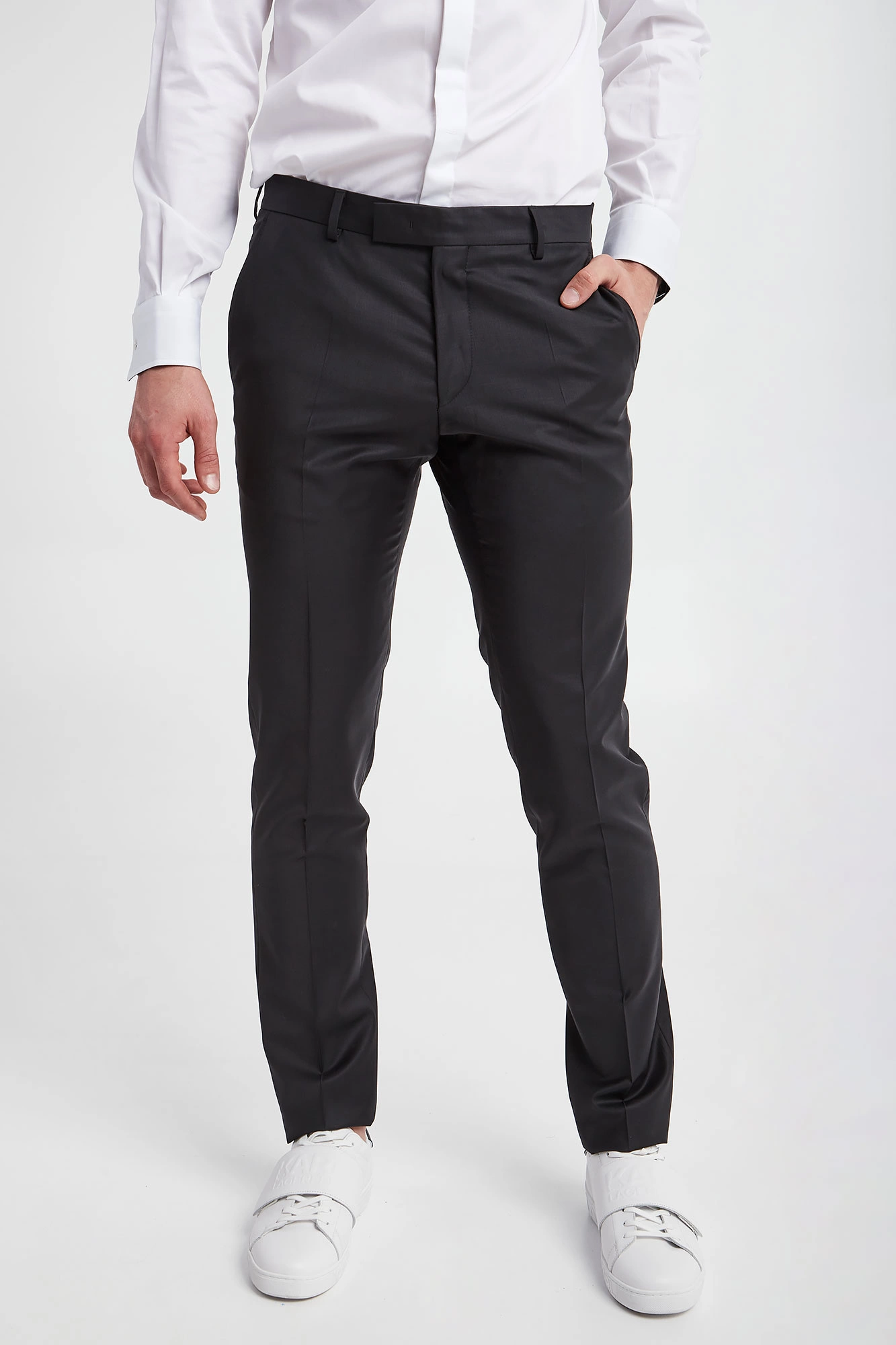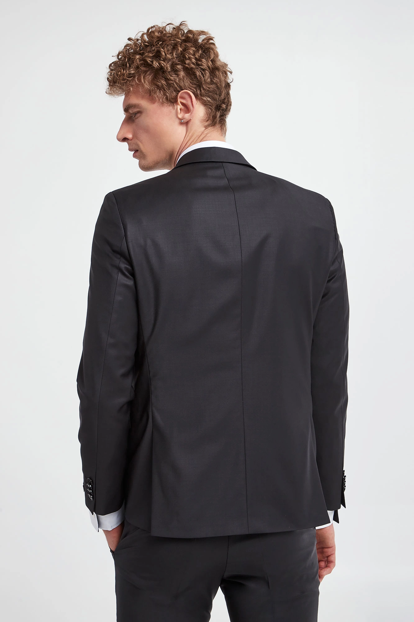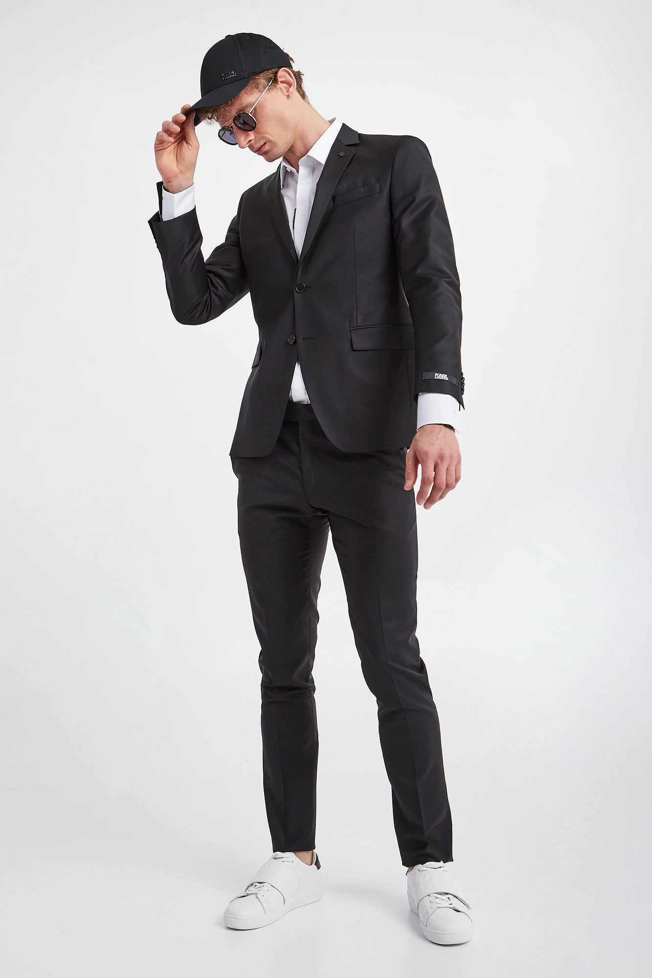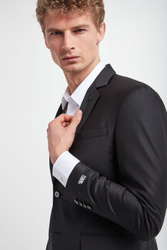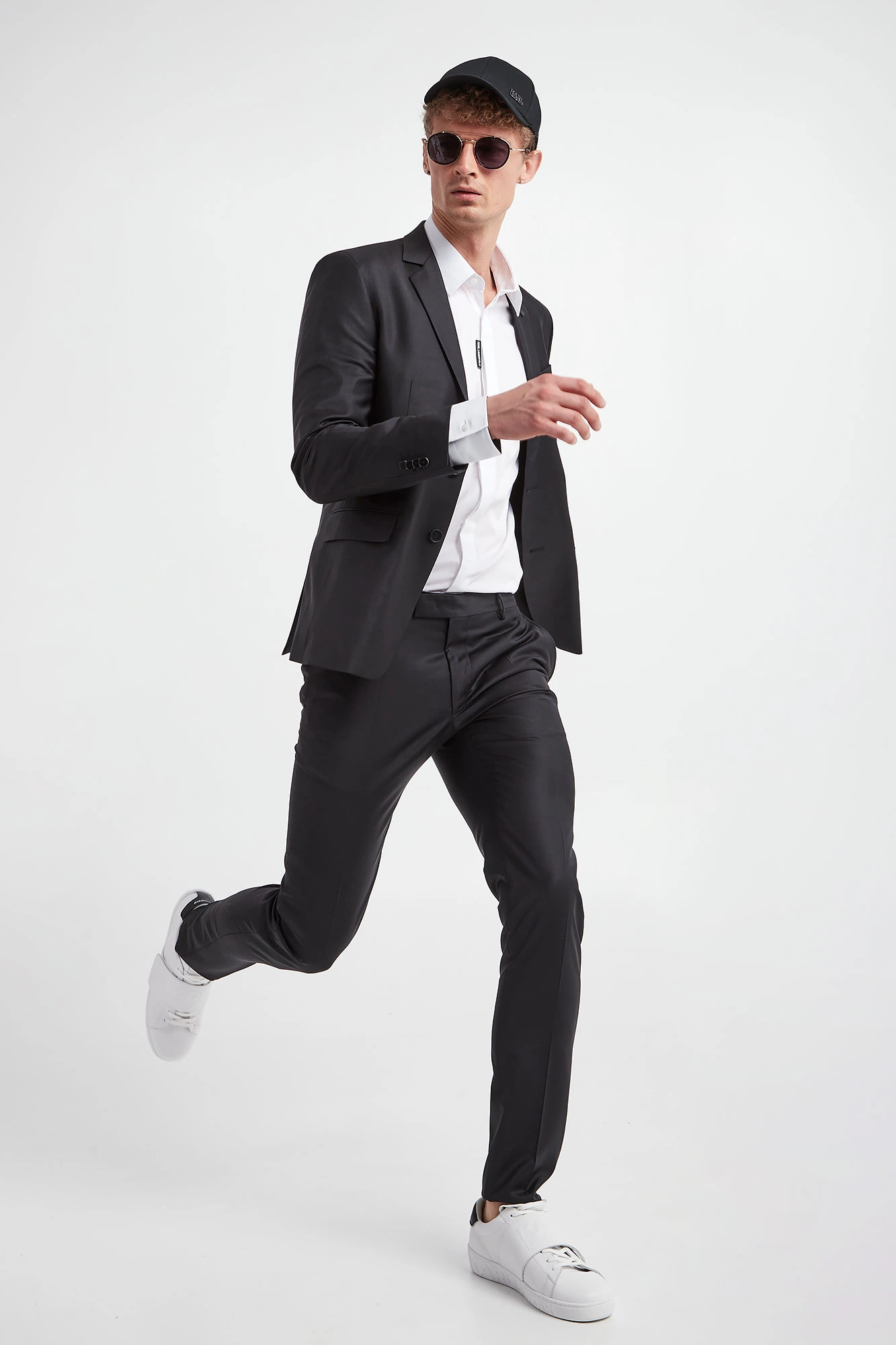 Garnitur marki Karl Lagerfeld w czarnym kolorze. Marynarka zapinana za pomocą guzików. Klasyczny kołnierz z klapami. Dwie boczne kieszenie z patkami. Rękawy zakończone zapinanymi mankietami. Z tyłu rozcięcia. Wykonana z wełny dziewiczej z domieszką elastycznych włókien. Wyściółka sygnowana z czystej wiskozy. Wewnątrz dodatkowe cztery kieszenie. Fason slim. Spodnie zapinane na zamek i zakładki. W pasie szlufki. Nogawki w kant. Model z czteroma kieszeniami.