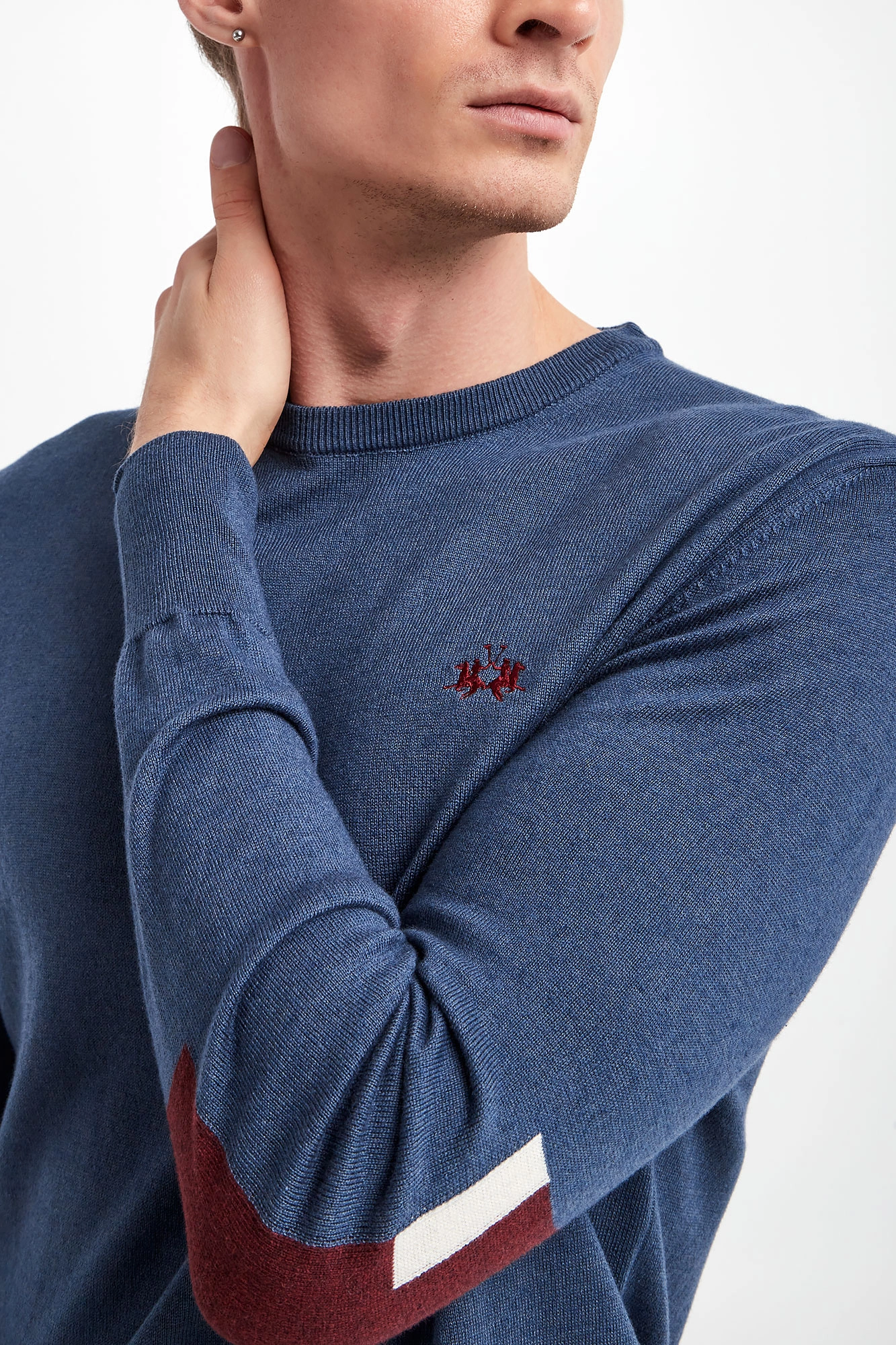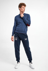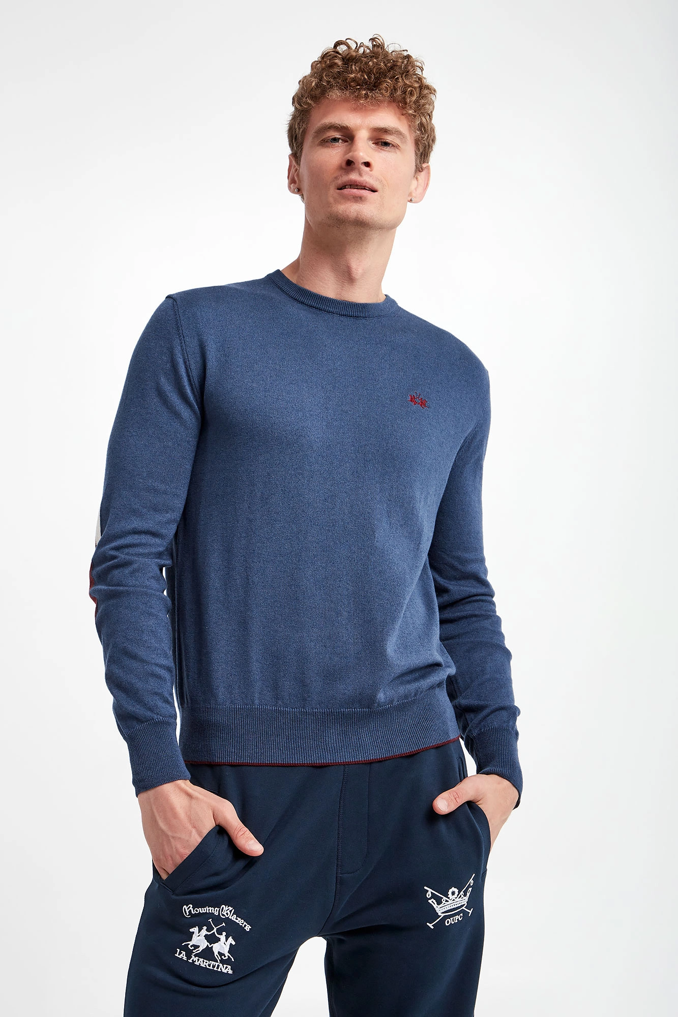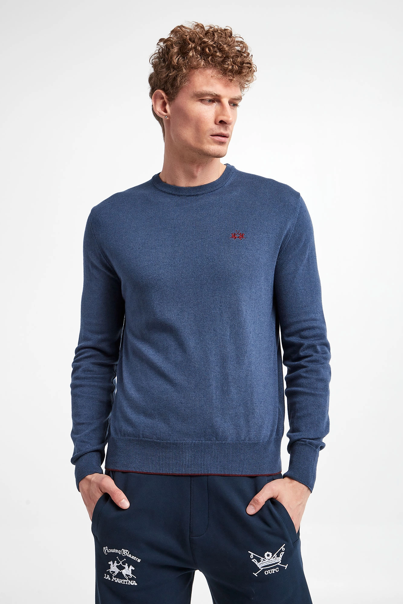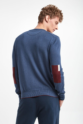Sweter wełniany marki La Martina w niebieskim kolorze. Fason typu regular. Z przodu haft w postaci logo marki. Dekolt typu o-neck, dół i długie rękawy zakończone elastycznym ściągaczem. Na rękawach wstawka imitująca naszywkę. Wykonany z elastycznej, wełnianej tkaniny.