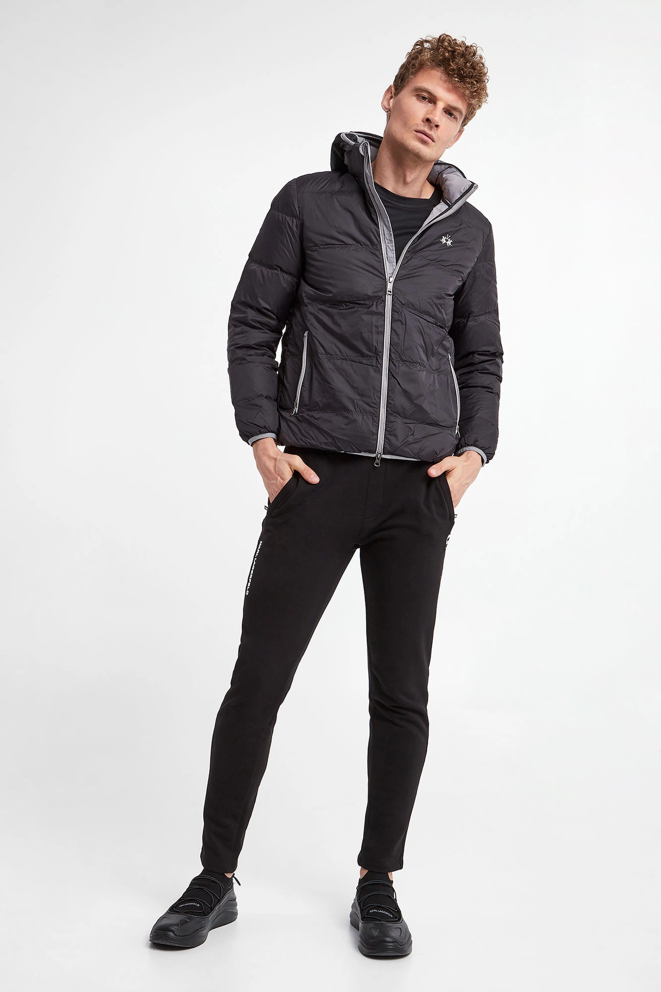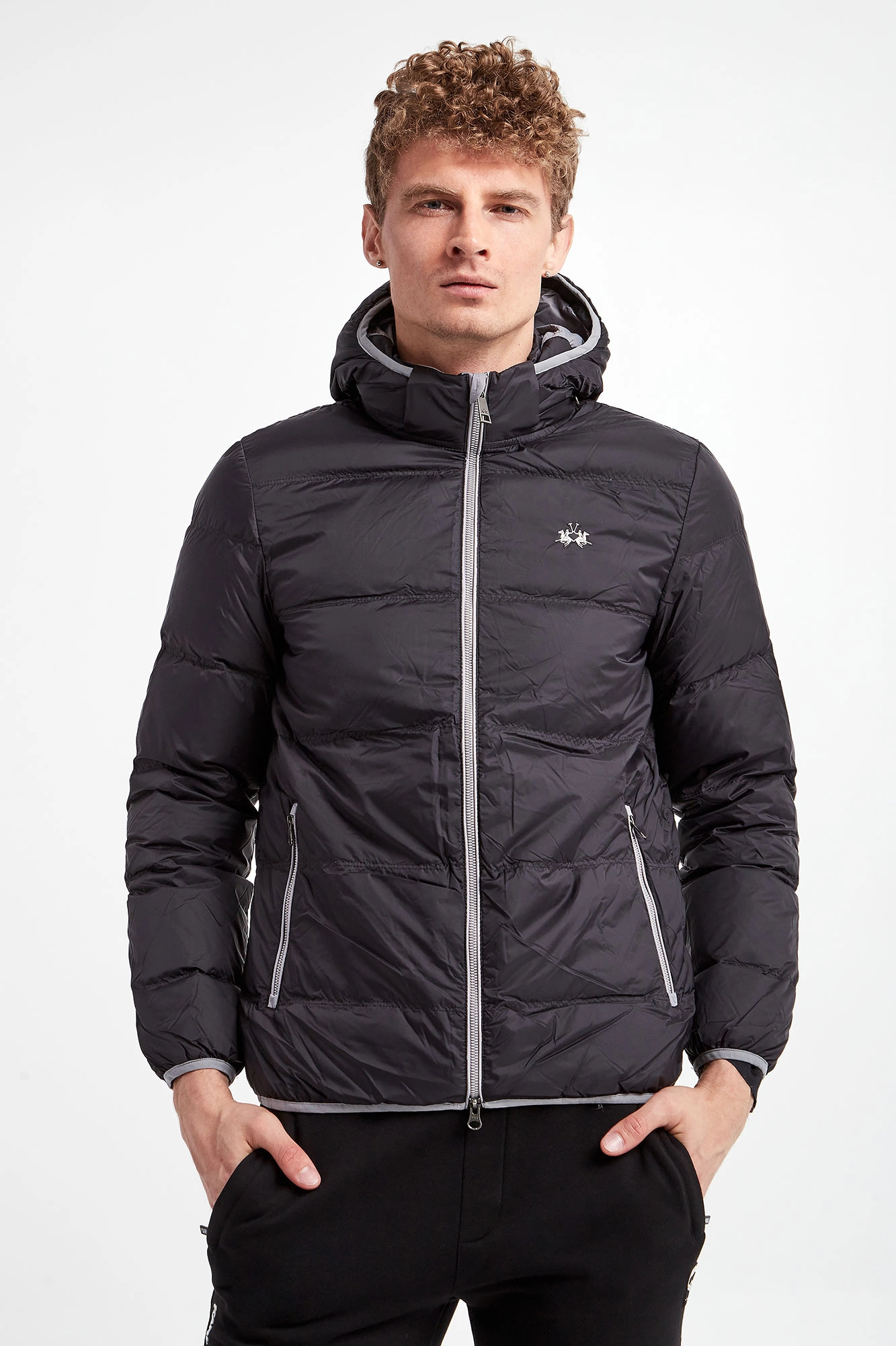 Kurtka puchowa z kapturem marki La Martina w czarnym kolorze. Naturalne wypełnienie. Całość pikowana. Zapinana za pomocą dwukierunkowego zamka. Na przodzie dwie kieszenie zamykane za pomocą suwaka, wewnątrz dwie kieszenie bez zapięcia. Na piersi wyszyte logo. Wnętrze w szarym kolorze. Na kapturze nazwa marki.