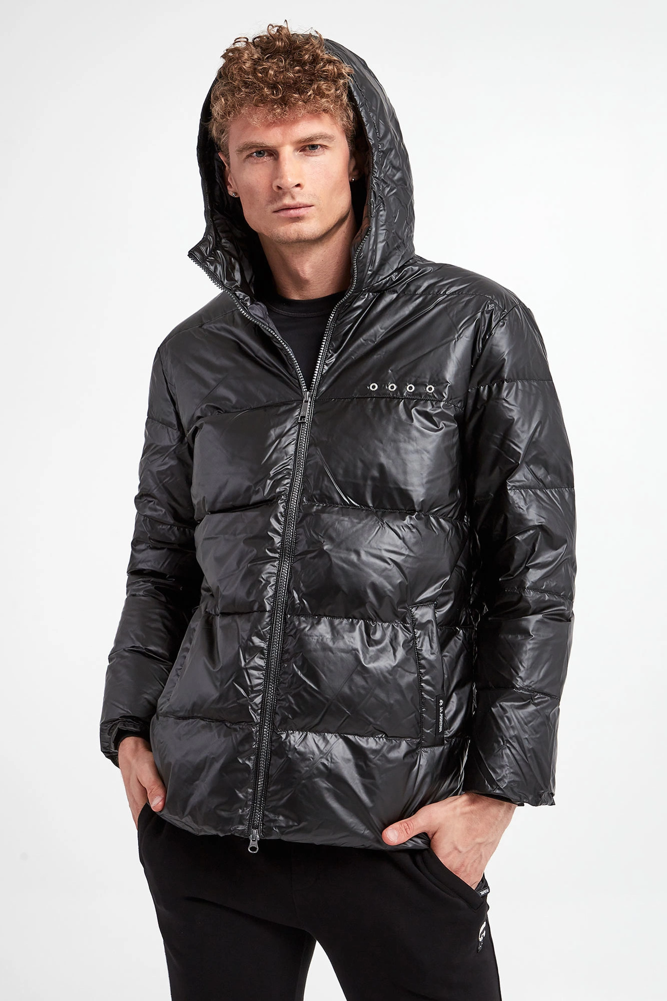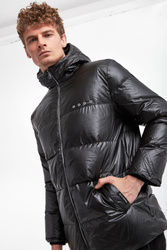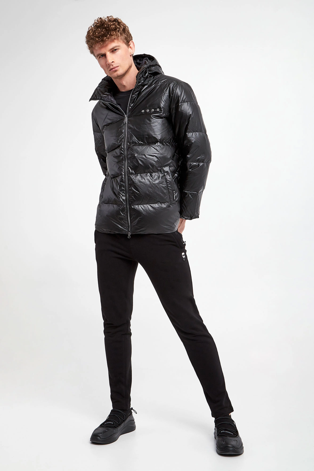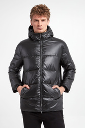 Kurtka puchowa marki La Martina w czarnym kolorze. Naturalne wypełnienie. Pikowana. Nieco połyskująca. Z kapturem, z logowana wyściółką. Długie rękawy wykończone mankietem przeciwsztormowym. Zapinana za pomocą dwukierunkowego zamka. Model z dwoma kieszeniami zapinanymi na napy. Z przodu ozdobne sygnowane dżety w srebrnym kolorze. Fason regular.