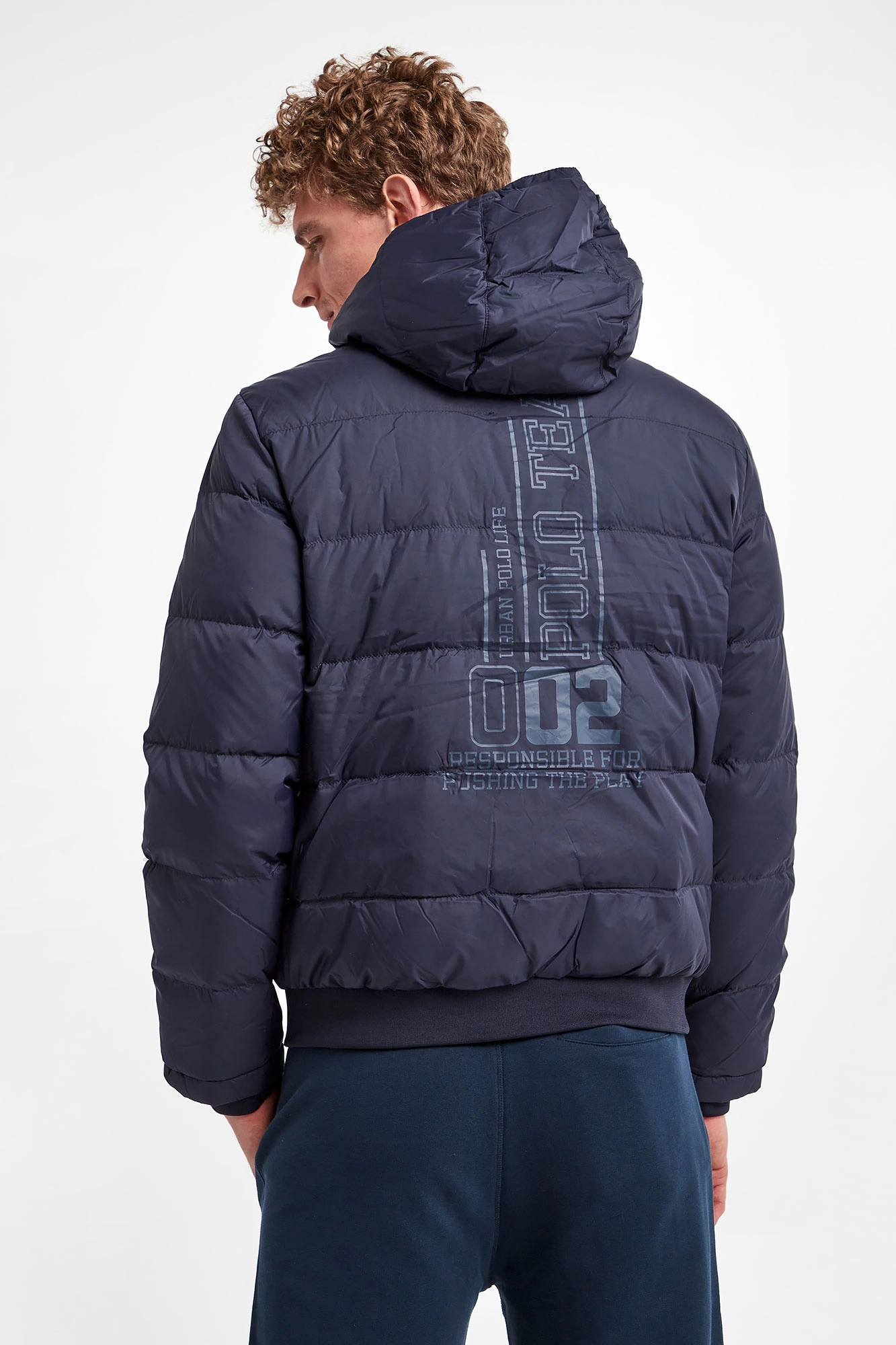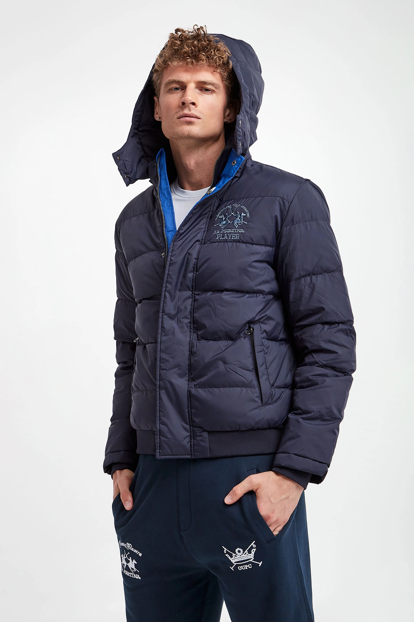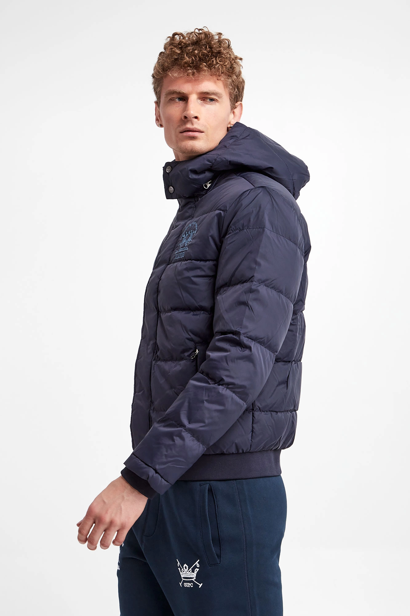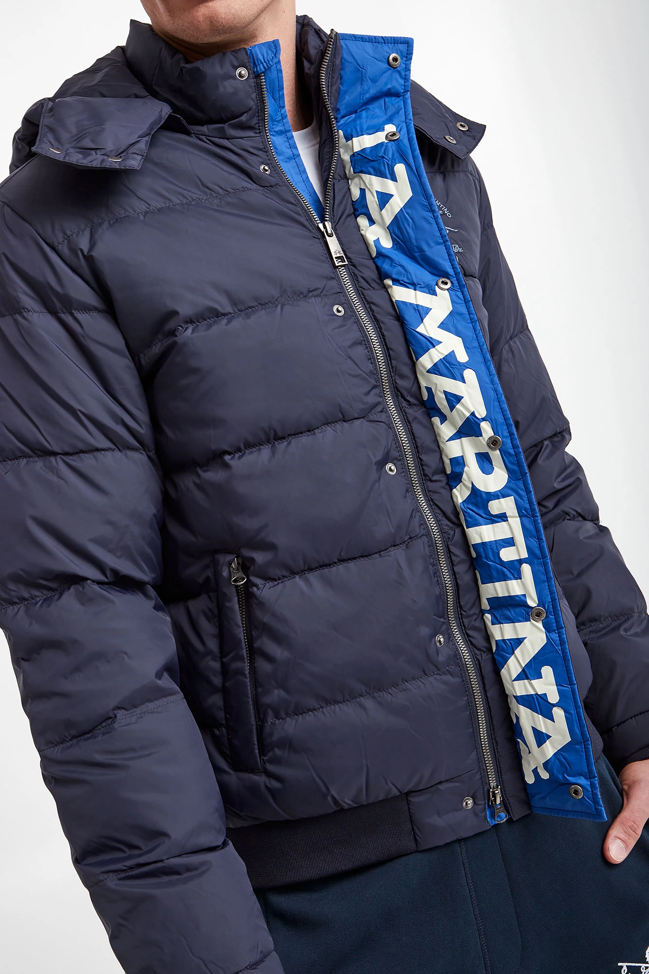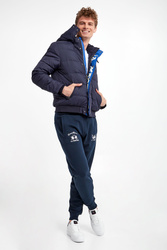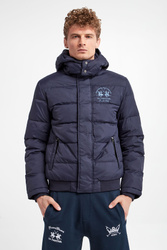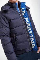 Kurtka puchowa marki La Martina w granatowym kolorze. Wnętrze w kolorze niebieskim. Dekolt wykończony stójką oraz kapturem odpinanym na zamek. Naturalne wypełnienie. Zamykane za pomocą zamka oraz nap, pokrytych tasiemką z nadrukiem nazwy marki od wewnętrznej strony. Z tyłu duży nadruk. Dół oraz rękawy zakończone ściągaczem.