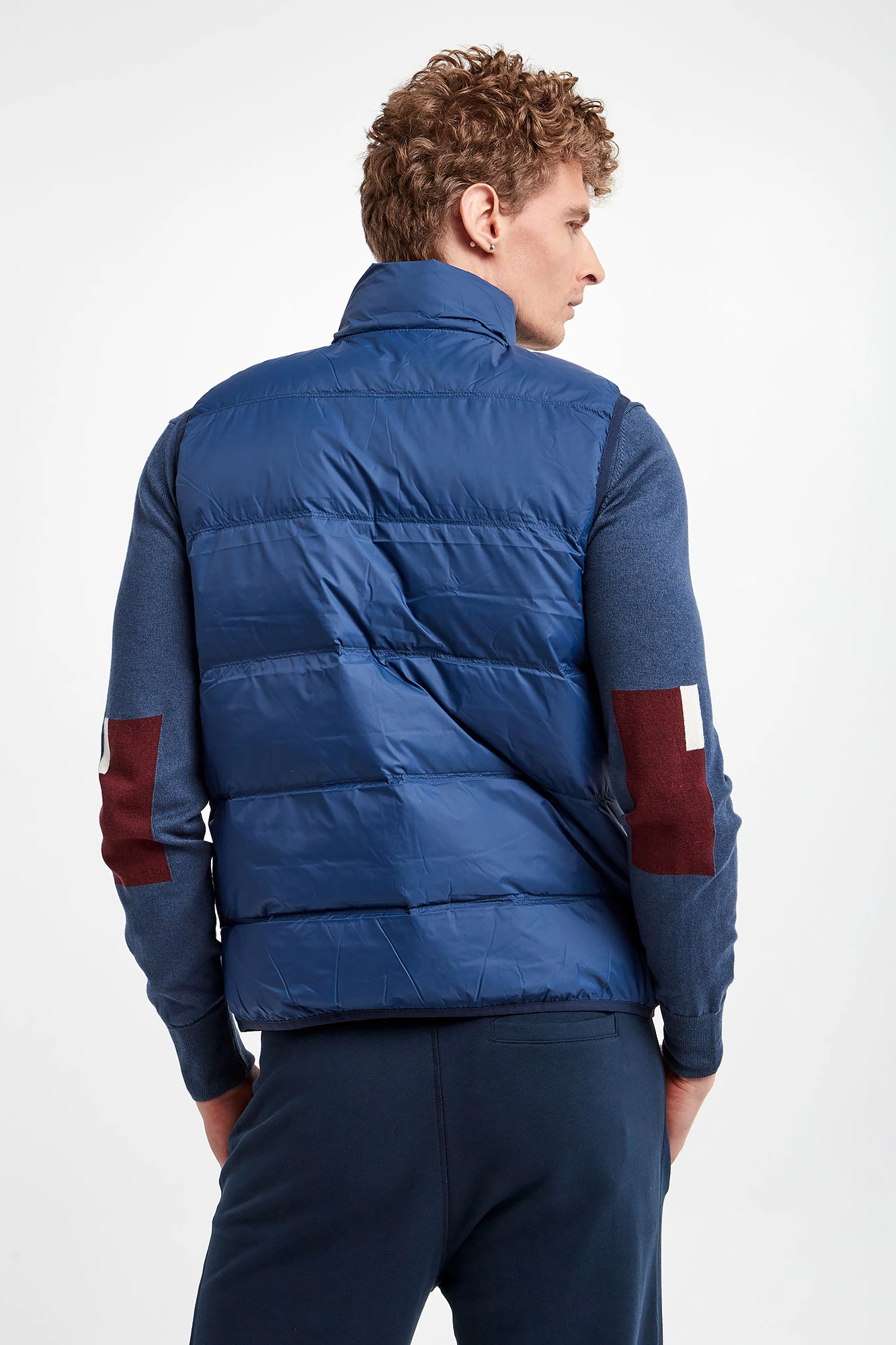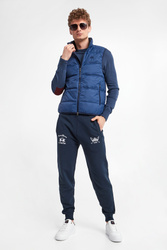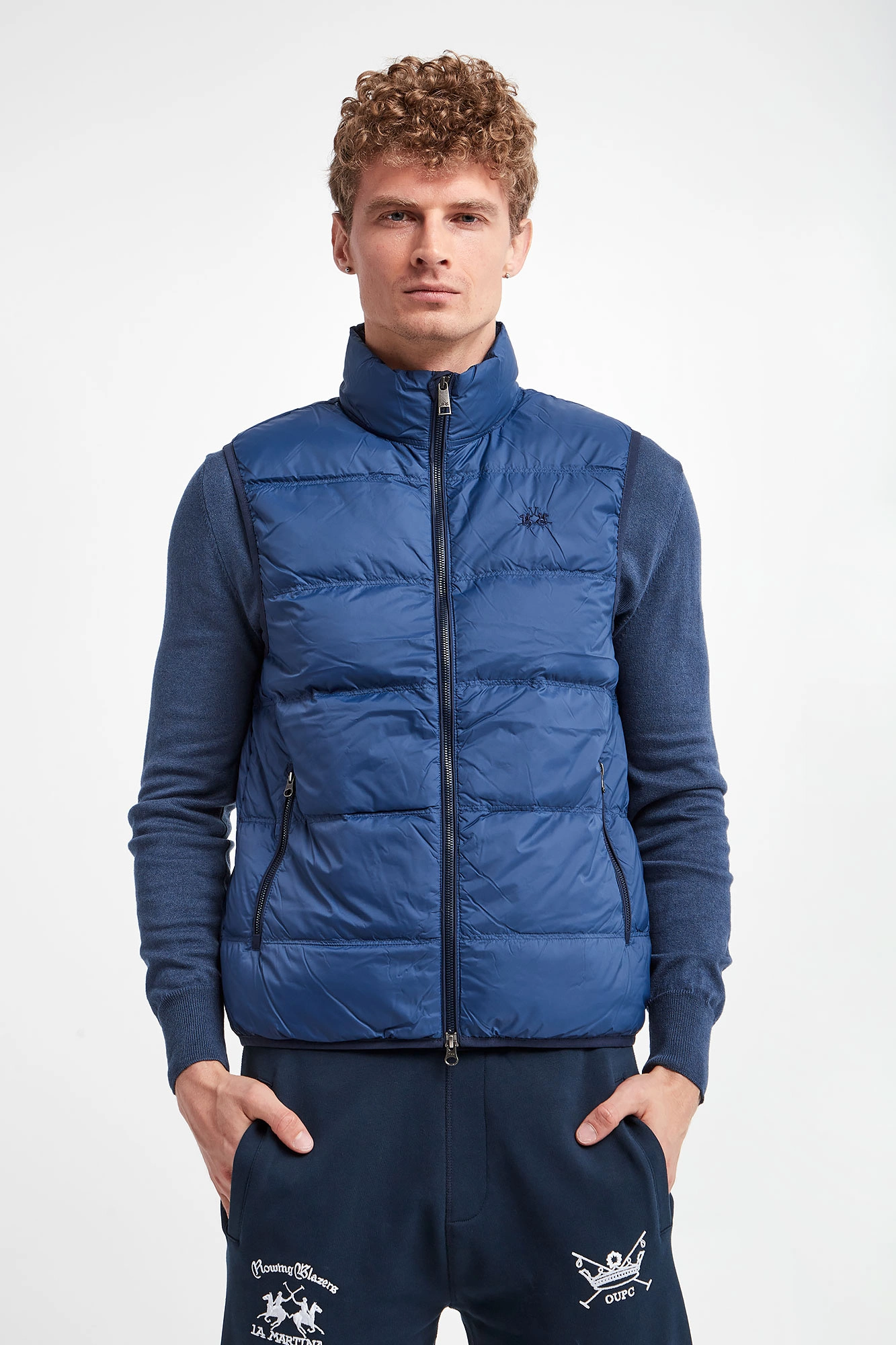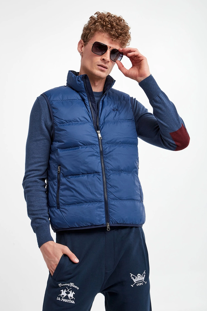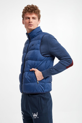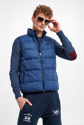 Kamizelka puchowa marki La Martina w kolorze niebieskim. Naturalne wypełnienie. Pikowana. Dekolt wykończony stójką. Model z dwoma kieszeniami z zamkiem. Z przodu wyszywane logo marki. Zapinana za pomocą zamka. Wykończona granatową lamówką. Wyściółka w kolorze granatowym. Model typu regular.