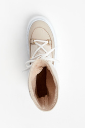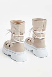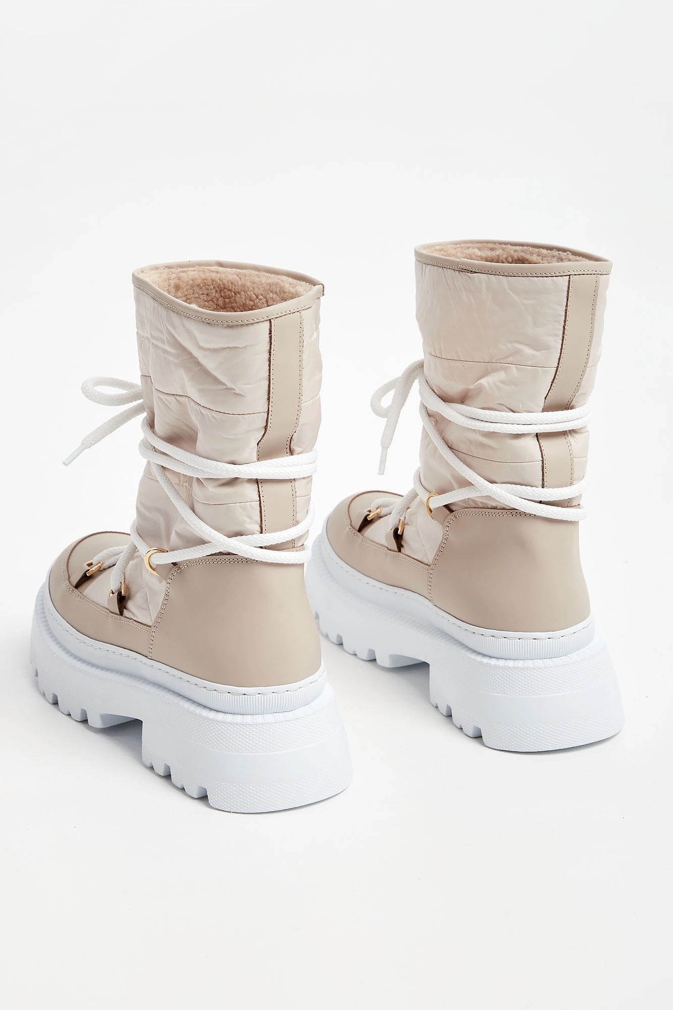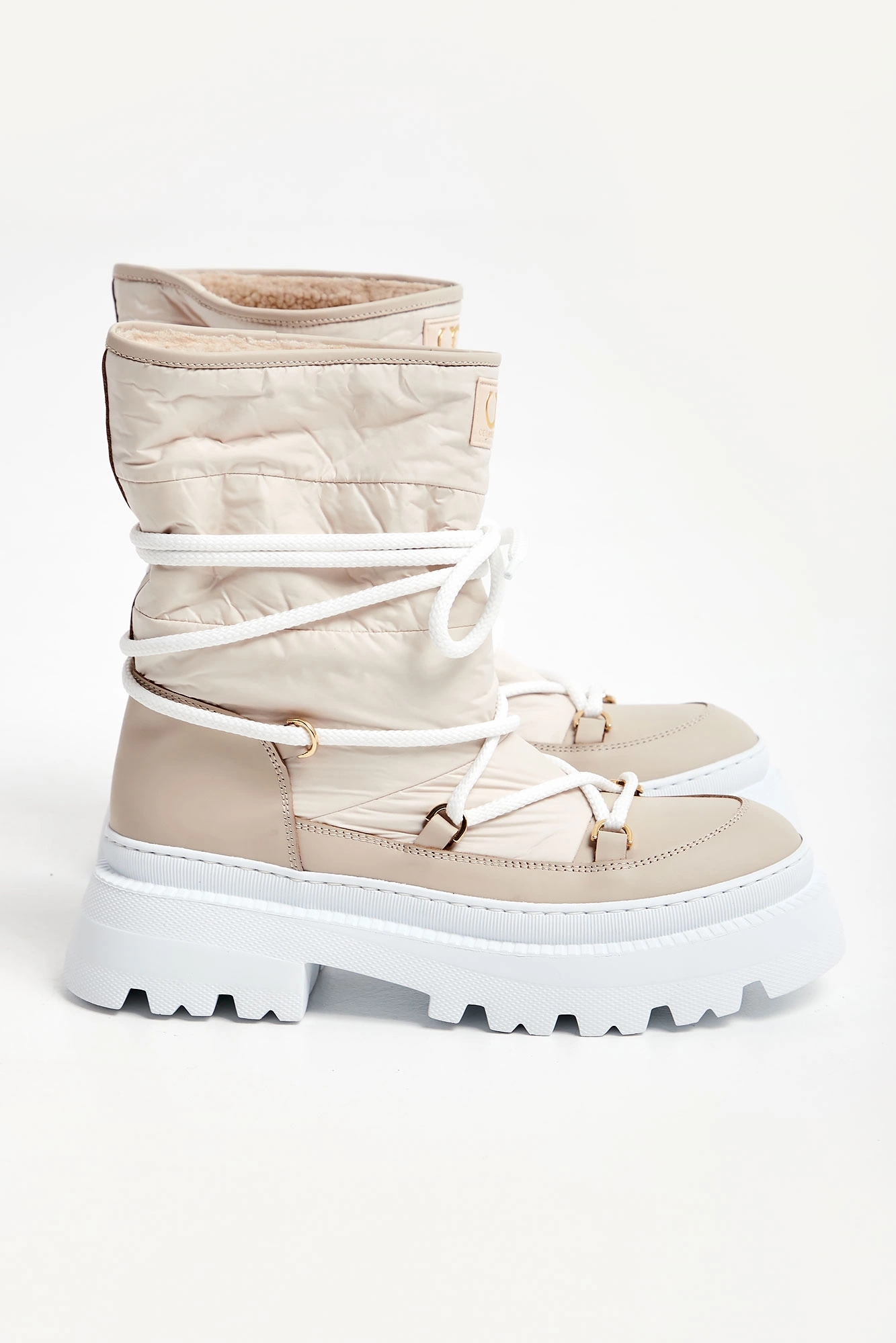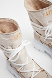 Śniegowce marki Cesare Casadei w beżowym kolorze. Wyższa cholewka. Dolna część wykonana z gładkiej skóry naturalnej, górna-pikowana. Wiązane za pomocą białych sznurówek. Z przodu skórzana naszywka z tłoczonym logo i nazwą marki. Wyściółka wykonana z futerkowej tkaniny. Podeszwa traperowa, w białym kolorze.