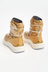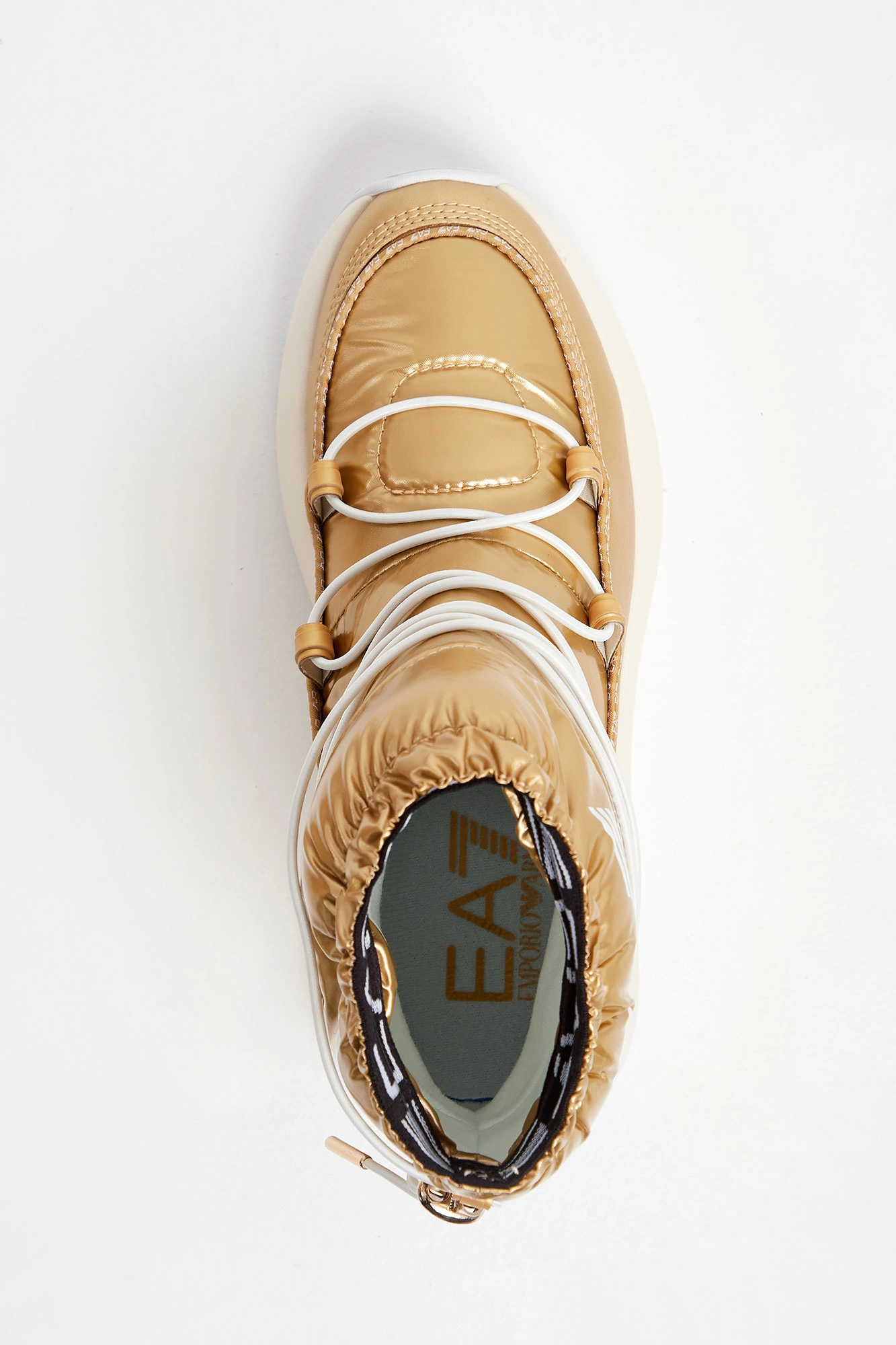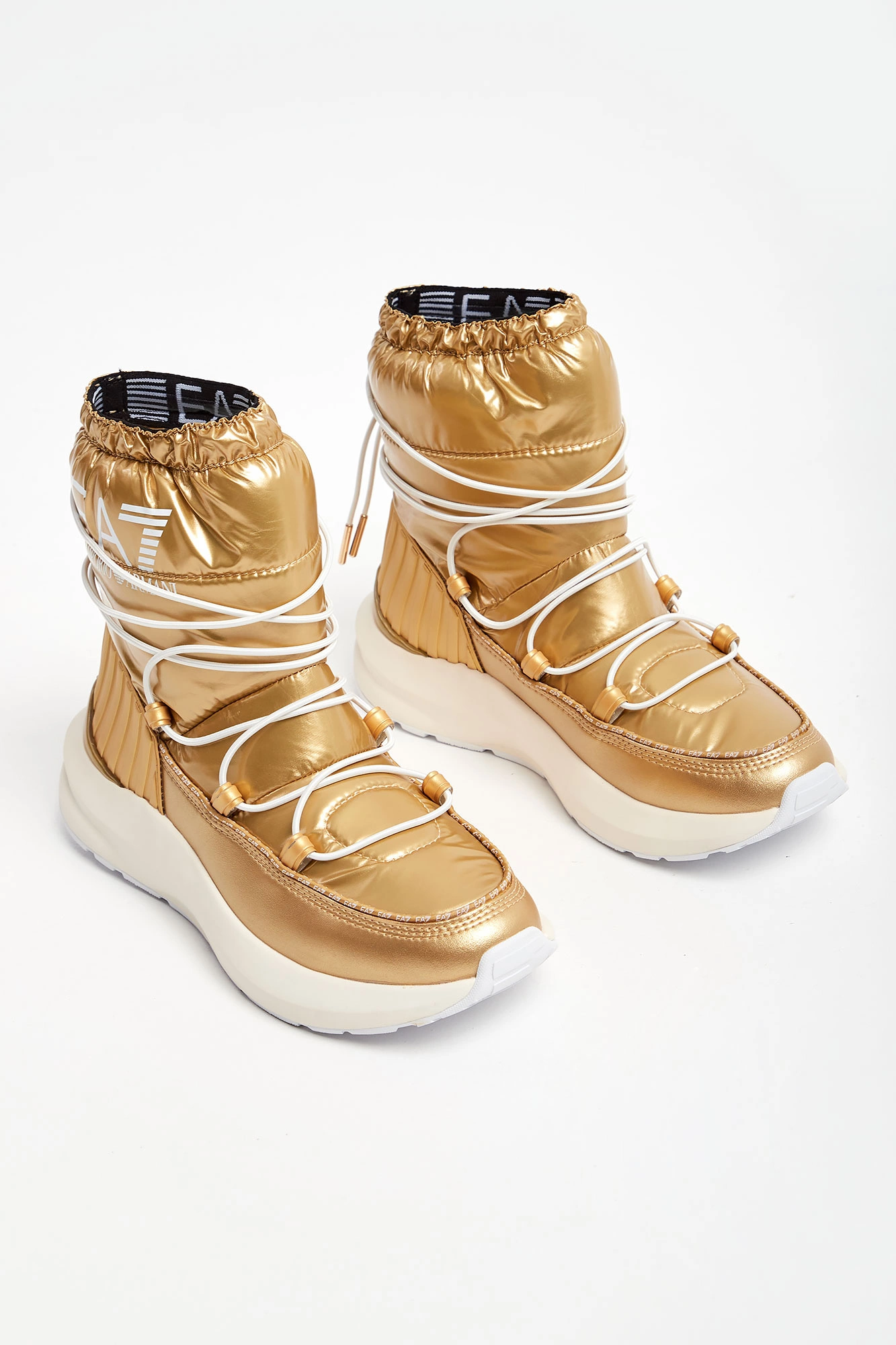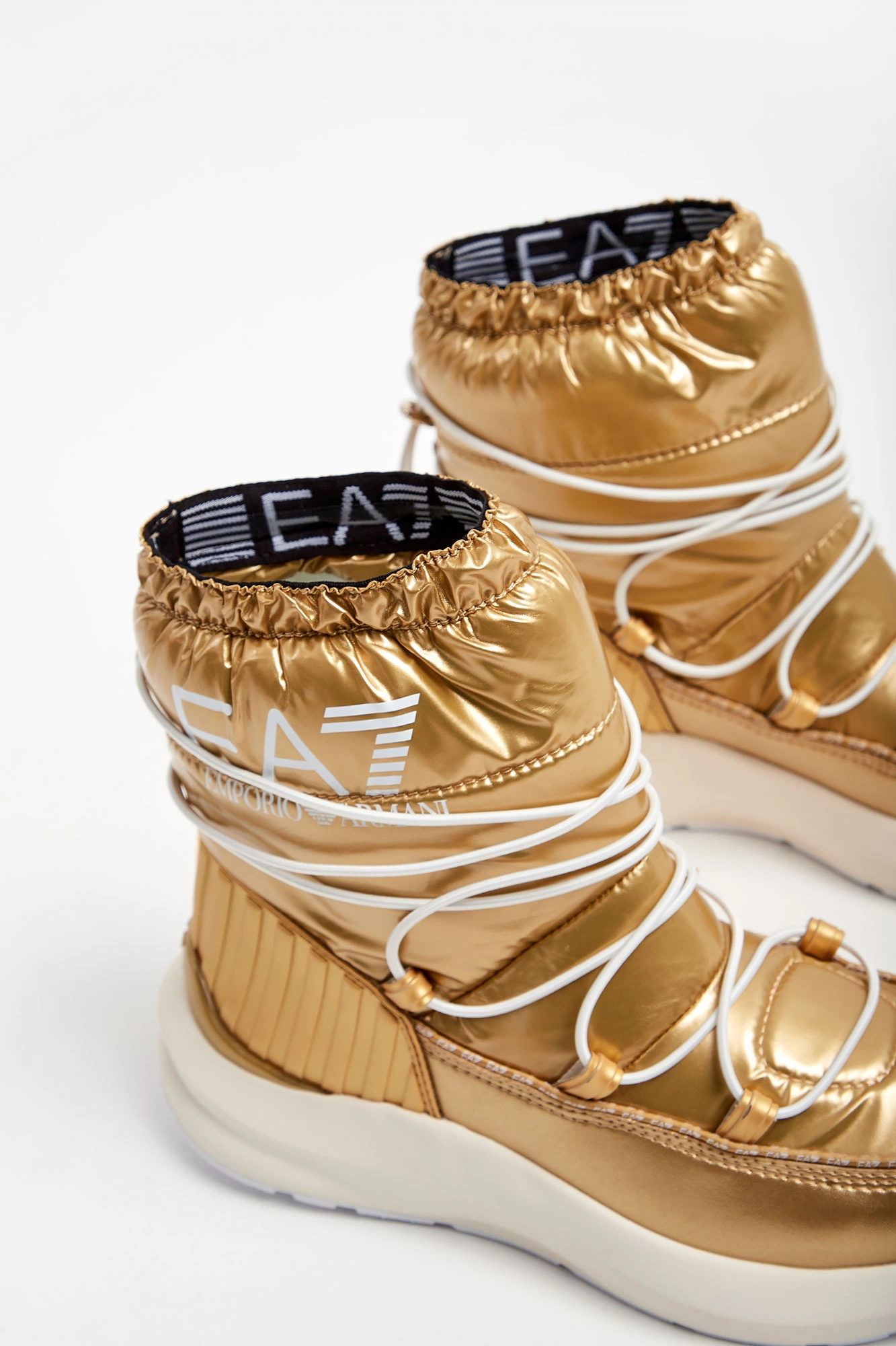 Śniegowce marki EA7 Emporio Armani w złotym kolorze. Regulowane za pomocą ściągaczy. Po bokach logo. Cholewki wykończone ściągaczami. Zaokrąglone noski. Z tyłu złote, logowane wstawki. Lekkie i komfortowe.