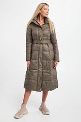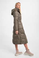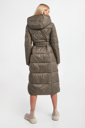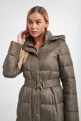Płaszcz pikowany marki Patrizia Pepe w kolorze khaki. Z odpinanym kapturem, regulowanym za pomocą elastycznych troczków ze stoperem. Zapinany za pomocą dwukierunkowego zamka pokrytego tasiemką zapinaną na napy. Długie rękawy zakończone zamkami w złotym kolorze. Model z trzema kieszeniami zapinanymi na zamek. W talii szlufki i elastyczny pasek z klamrą w kształcie owadziego logo marki w złotym kolorze. Syntetyczne wypełnianie.
