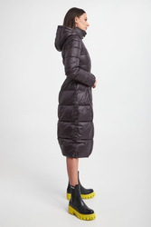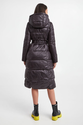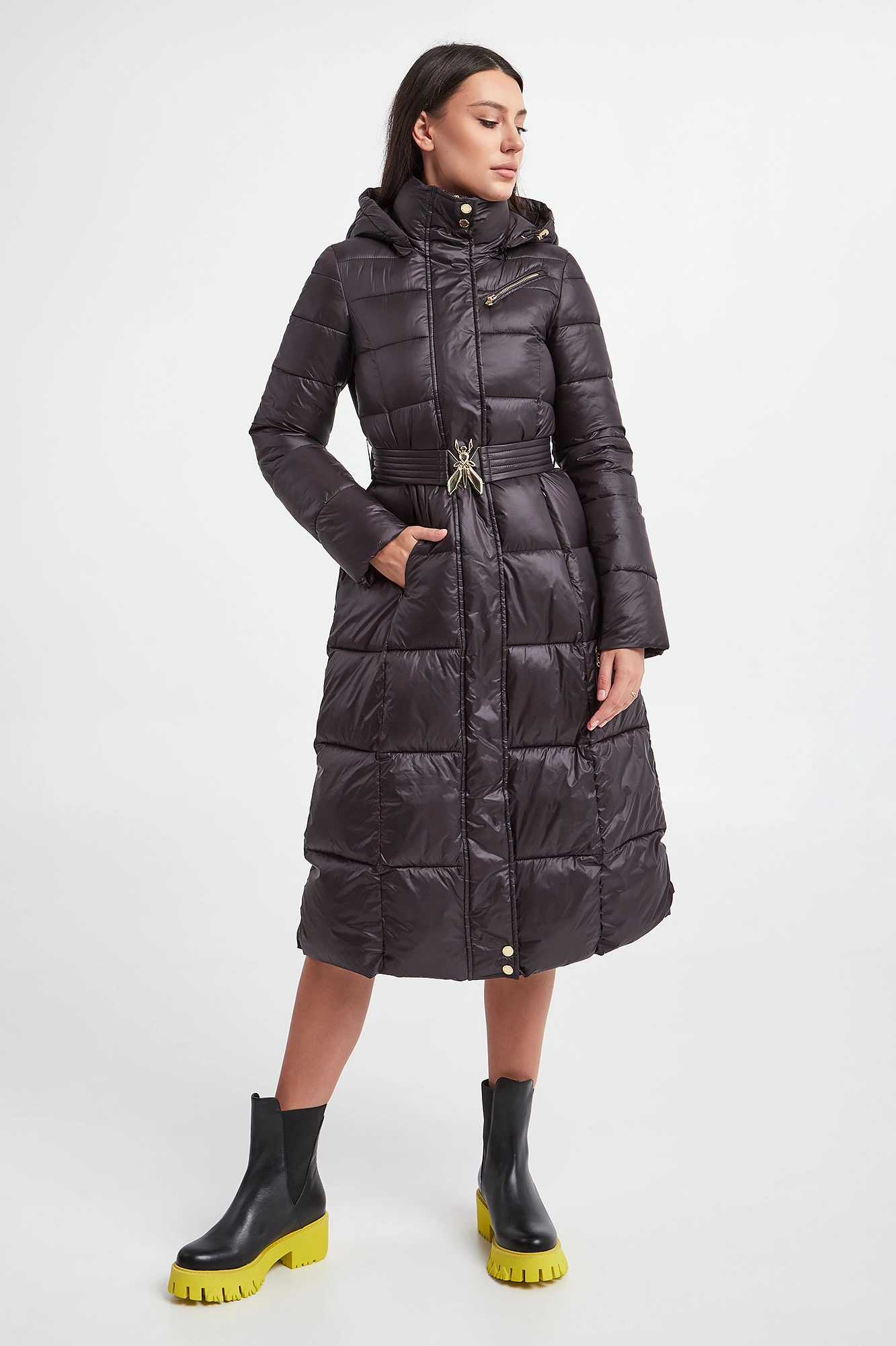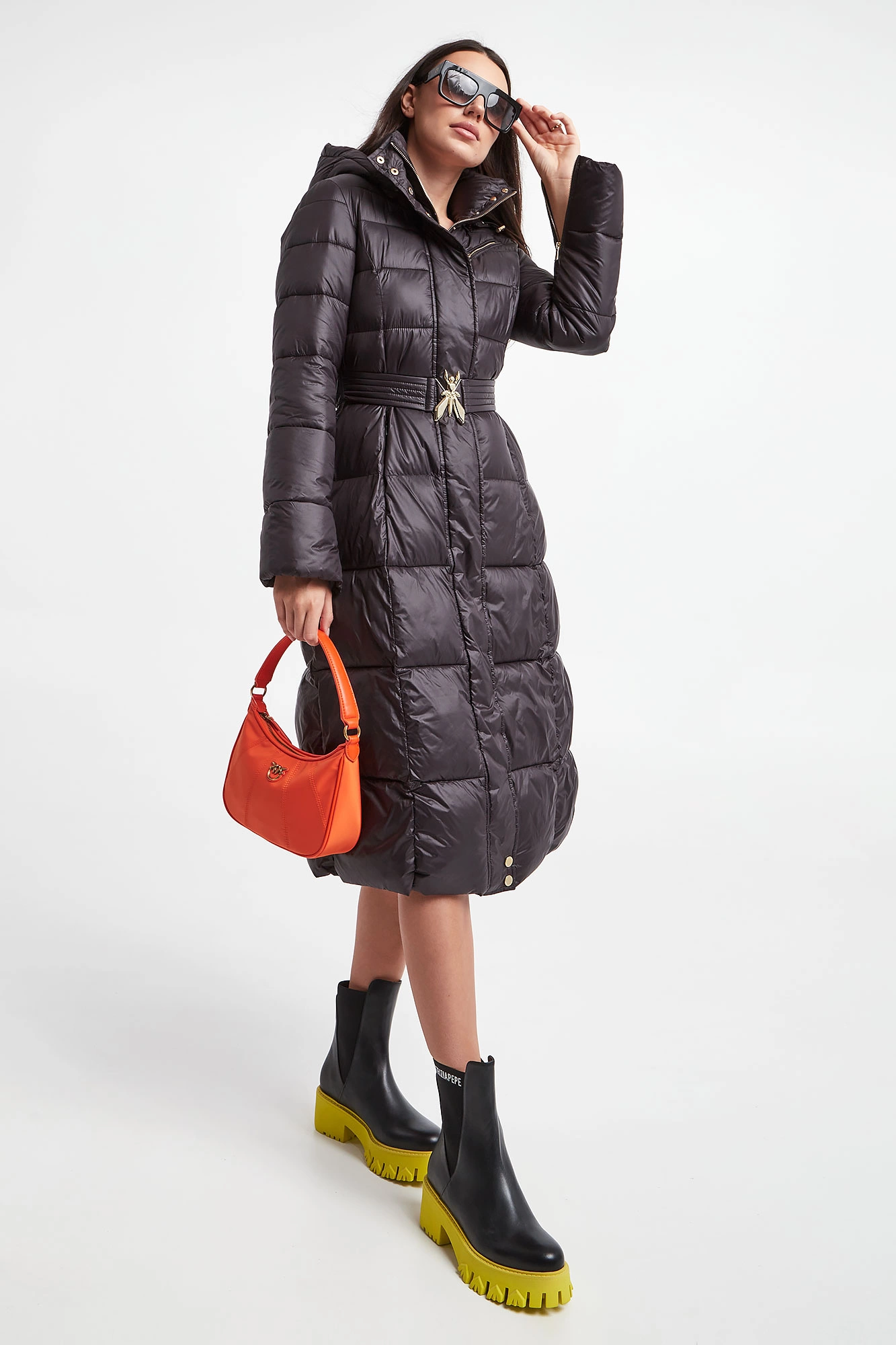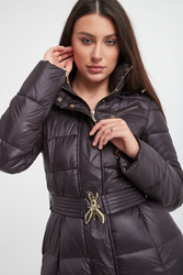 Płaszcz pikowany marki Patrizia Pepe w kolorze czarnym. Z odpinanym kapturem, regulowanym za pomocą elastycznych troczków ze stoperem. Zapinana za pomocą dwukierunkowego zamka pokrytego tasiemką zapinaną na napy. Długie rękawy zakończone zamkami w złotym kolorze. Model z trzema kieszeniami zapinanymi na zamek. W talii szlufki i elastyczny pasek z klamrą w kształcie owadziego logo marki w złotym kolorze. Syntetyczne wypełnianie.