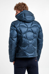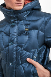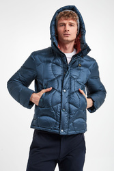 Kurtka puchowa marki Blauer w turkusowym kolorze. Naturalne wypełnienie. Z kapturem regulowanym za pomocą elastycznych troczków ze stoperem. Pikowana. Model z dwoma kieszeniami zapinanymi na napy. Zapinana za pomocą dwukierunkowego zamka w czarnym kolorze i nap krytych tasiemką. Z przodu naszywka z nazwą marki. Wewnątrz dodatkowa kieszeń. Fason typu regular. Dół regulowany za pomocą troczków.