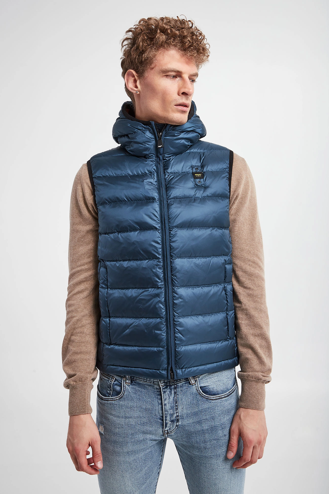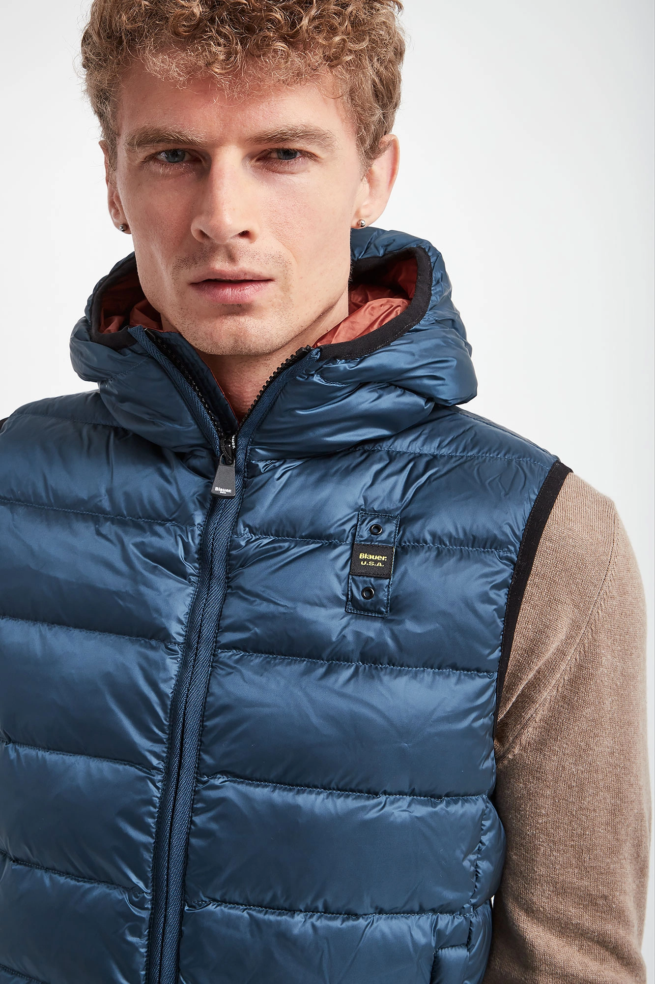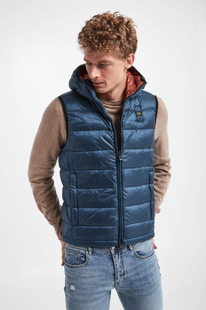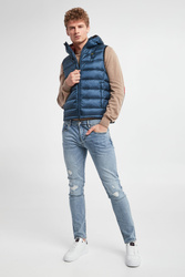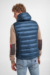 Puchowa kamizelka marki Blauer w ciemnoturkusowym kolorze. Naturalne wypełnienie. Całość pikowana. Wnętrze w brązowym kolorze. Zapinana za pomocą dwukierunkowego zamka w czarnym kolorze. Część wykończona czarną lamówką. Model z dwiema kieszeniami na froncie oraz dwiema wewnętrznymi. Kieszenie zapinane na suwak. Na piersi logowana szlufka. Fason typu slim.