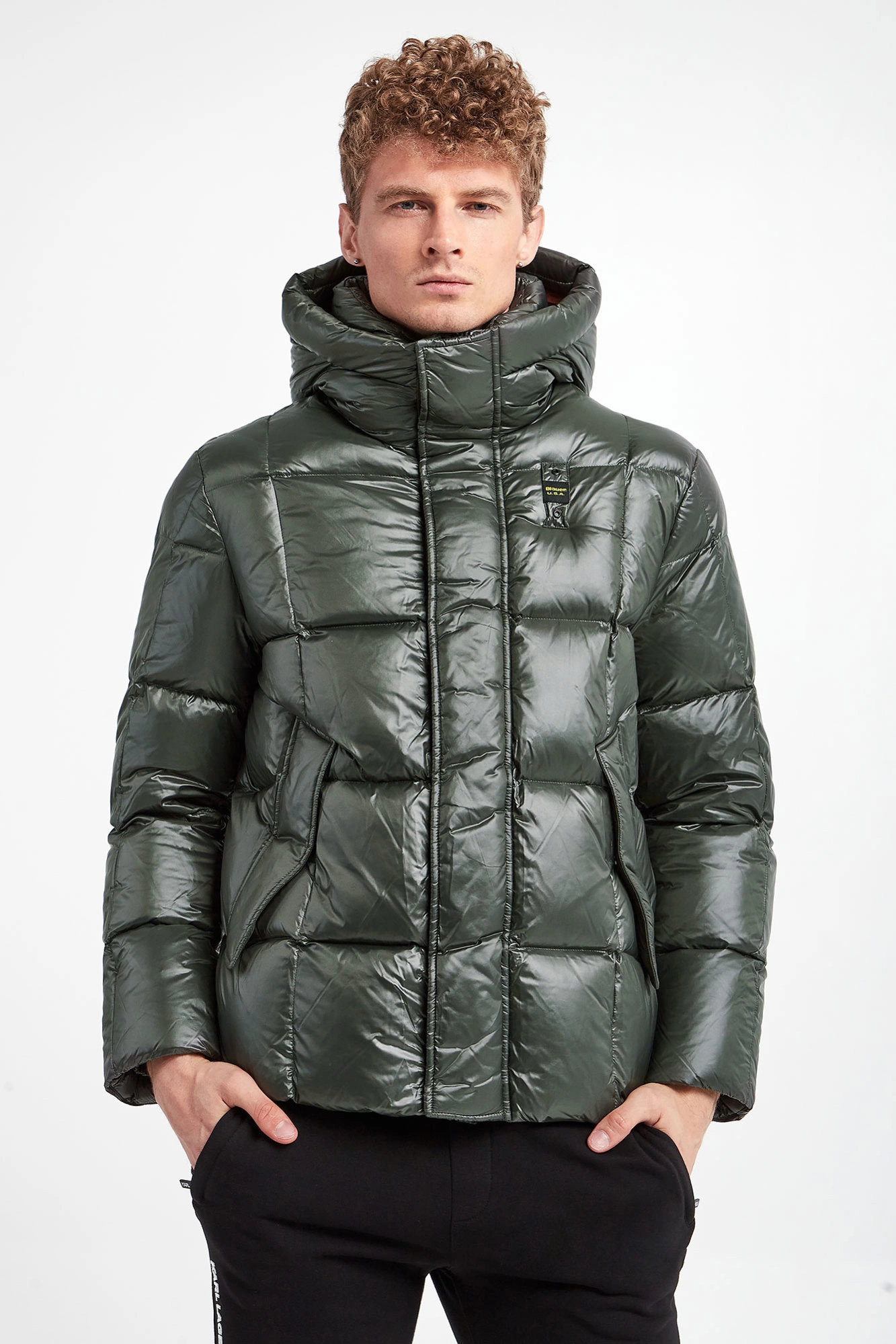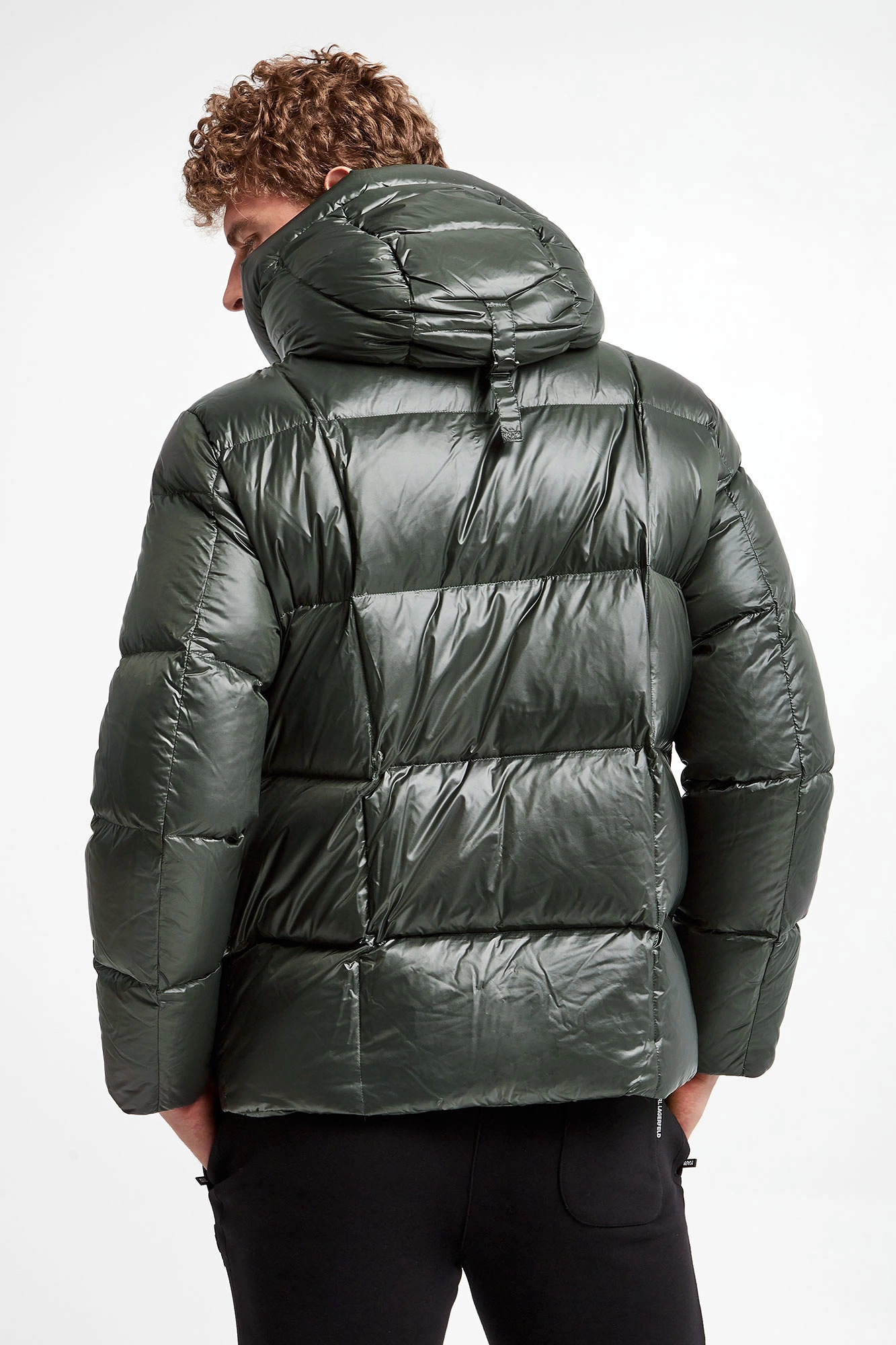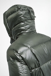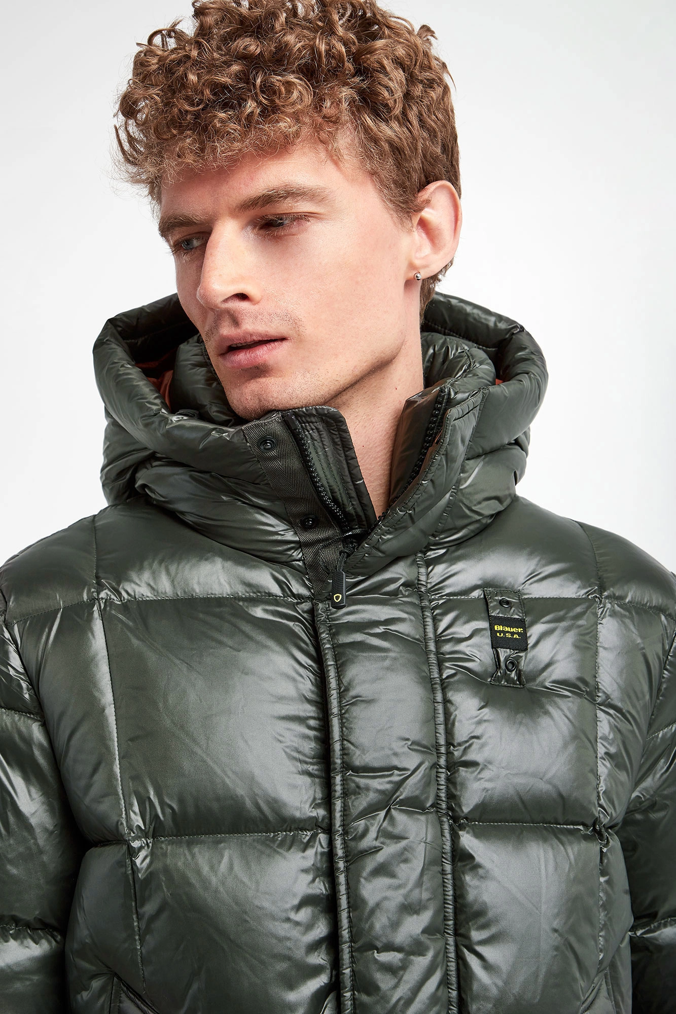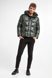 Kurtka puchowa z kapturem marki Blauer w ciemnozielonym kolorze. Wnętrze w kolorze brązowym. Dekolt wykończony stójką oraz kapturem. Naturalne wypełnienie. Całość pikowana. Zapinana za pomocą nap oraz zamka dwukierunkowego w czarnym kolorze. Na przodzie dwie kieszenie zamykane za pomocą suwaka. Wewnątrz dwie kieszenie na rzepy oraz dwie wykonane z siatki. Długie rękawy zakończone przeciwsztormowymi mankietami. Na piersi sygnowana szlufka. Dół oraz kaptur zakończony elastycznymi troczkami ze stoperem.