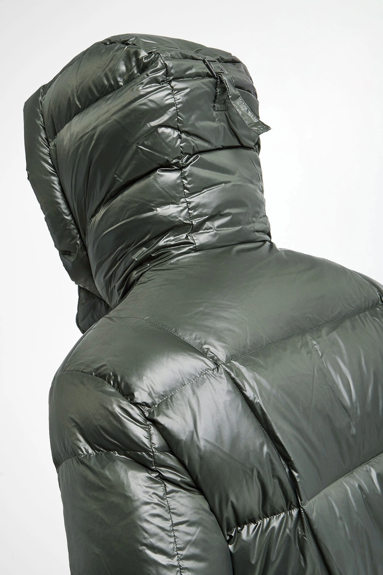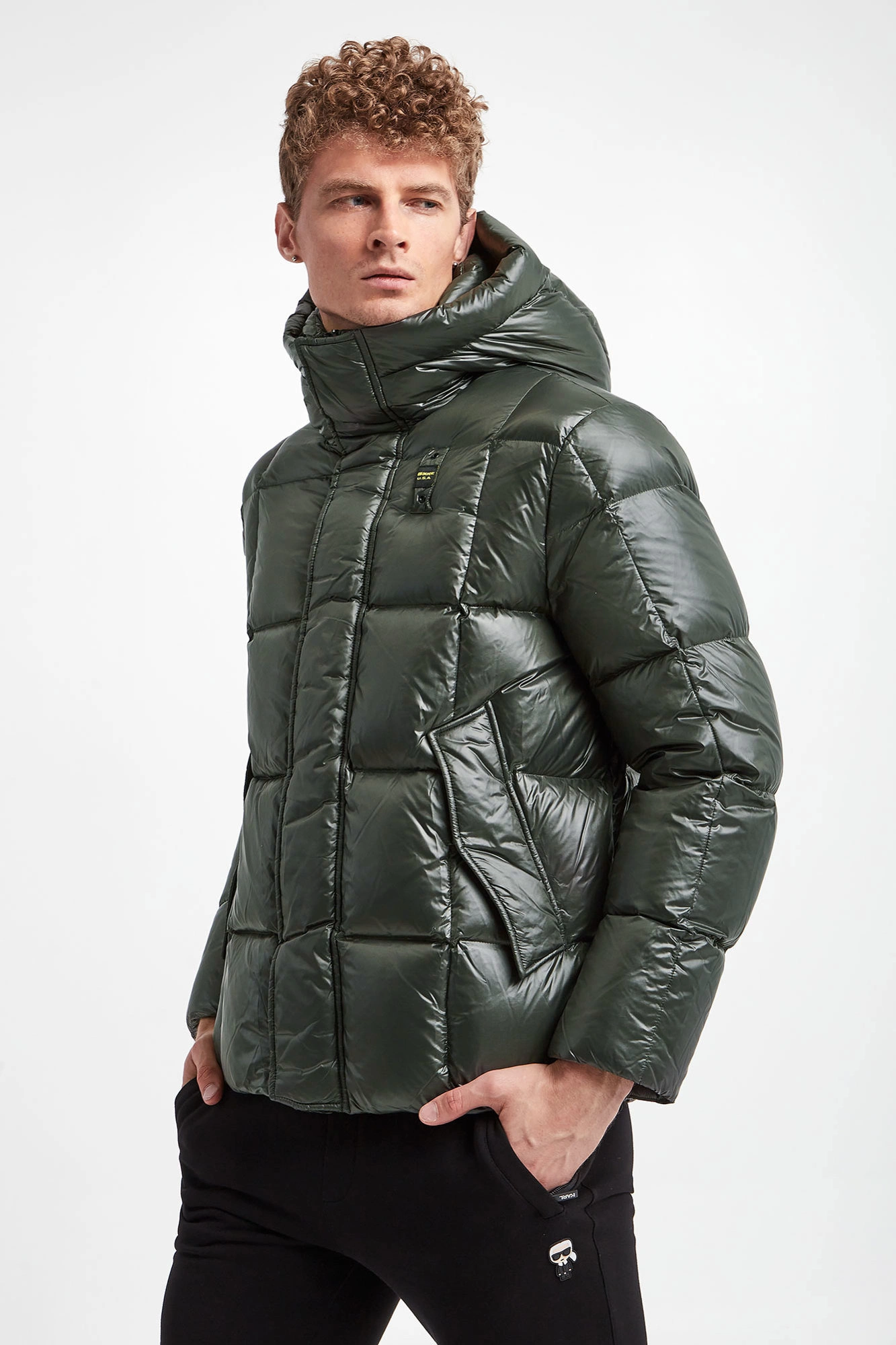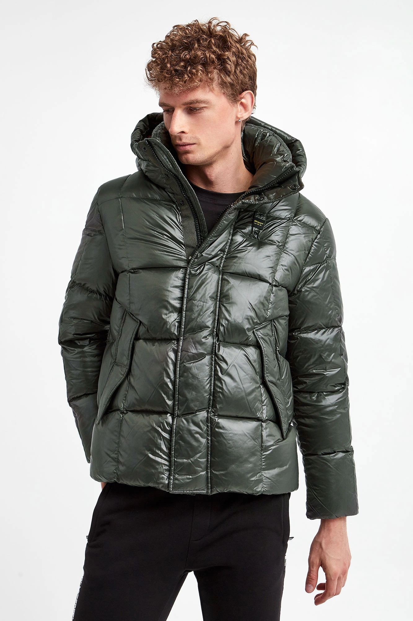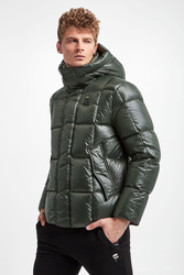 Kurtka puchowa z kapturem marki Blauer w ciemnozielonym kolorze. Wnętrze w kolorze brązowym. Dekolt wykończony stójką oraz kapturem. Naturalne wypełnienie. Całość pikowana. Zapinana za pomocą nap oraz zamka dwukierunkowego w czarnym kolorze. Na przodzie dwie kieszenie zamykane za pomocą suwaka. Wewnątrz dwie kieszenie na rzepy oraz dwie wykonane z siatki. Długie rękawy zakończone przeciwsztormowymi mankietami. Na piersi sygnowana szlufka. Dół oraz kaptur zakończony elastycznymi troczkami ze stoperem.