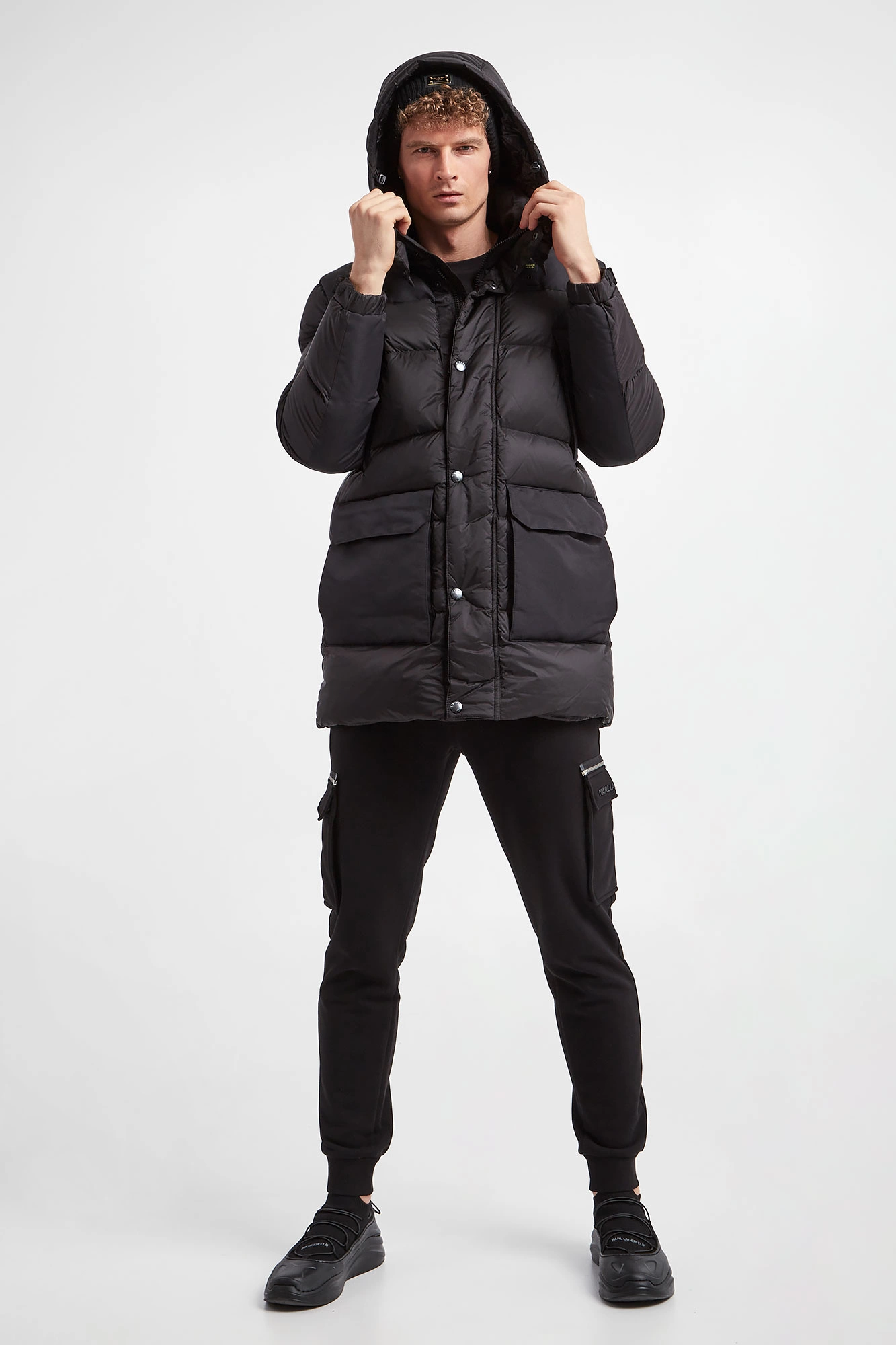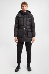 Kurtka puchowa marki Blauer w czarnym kolorze. Dekolt wykończony stójką oraz kapturem. Naturalne wypełnienie. Całość pikowana. Zapinana za pomocą nap oraz dwukierunkowego zamka. Na przodzie sześć kieszeni, z czego dwie zamykane na zamek, a kolejne dwie na nap z patką. Wewnątrz dwie kieszenie na rzepy. Długie rękawy zakończone mankietami zapinanym na rzep. Na piersi sygnowana szlufka.