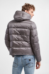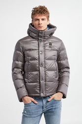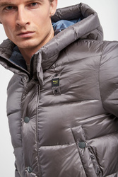 Kurtka puchowa marki Blauer w szarym kolorze. Naturalne wypełnienie. Z kapturem regulowanym za pomocą elastycznych troczków ze stoperem. Pikowana. Model z dwoma kieszeniami zapinanymi na napy. Zapinana za pomocą dwukierunkowego zamka w kontrastowym, czarnym kolorze i nap krytych tasiemką. Z przodu naszywka z nazwą marki. Podszewka w niebieskim kolorze. Wewnątrz dodatkowa kieszeń. Fason typu regular. Dół regulowany za pomocą troczków.