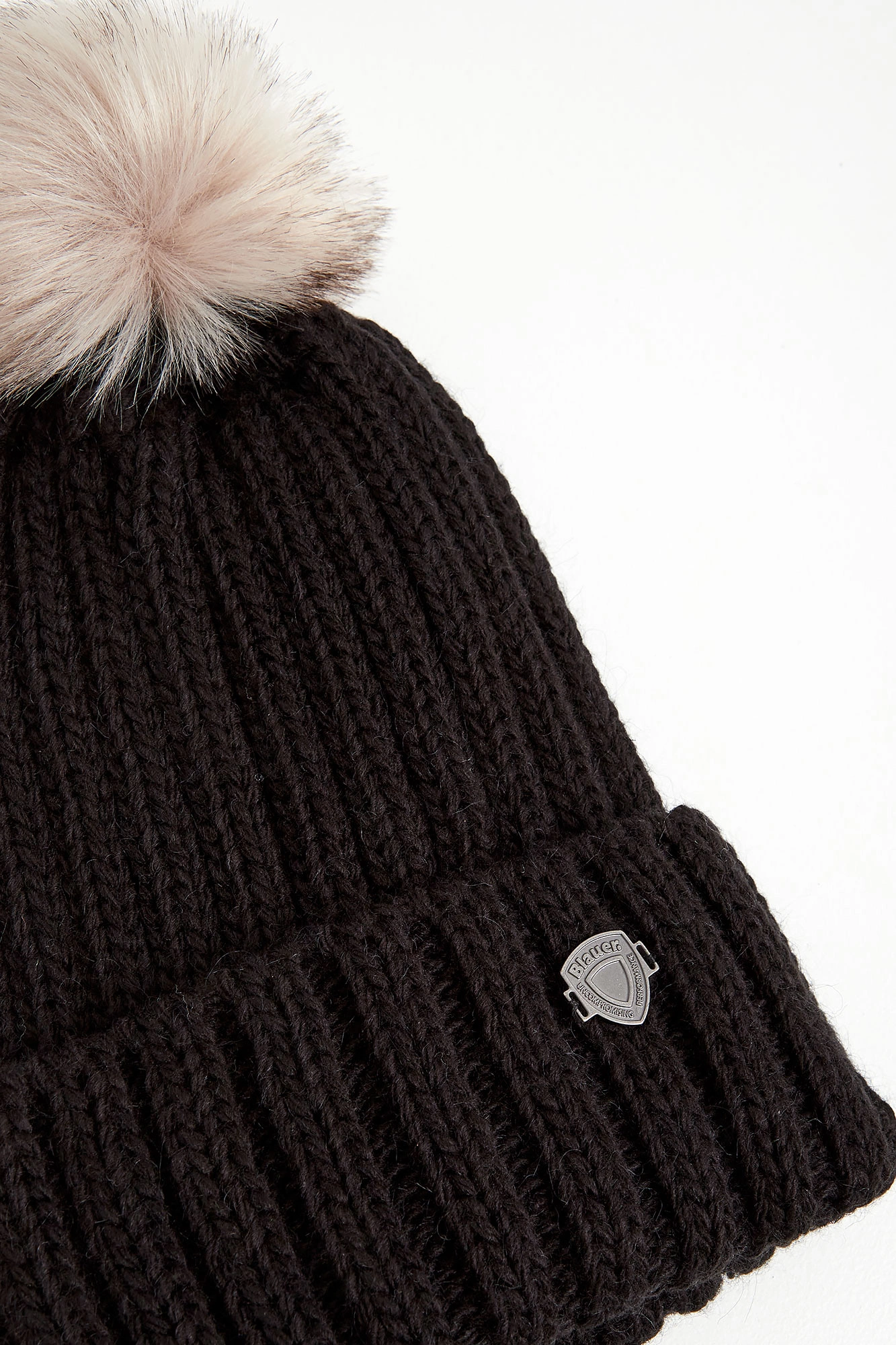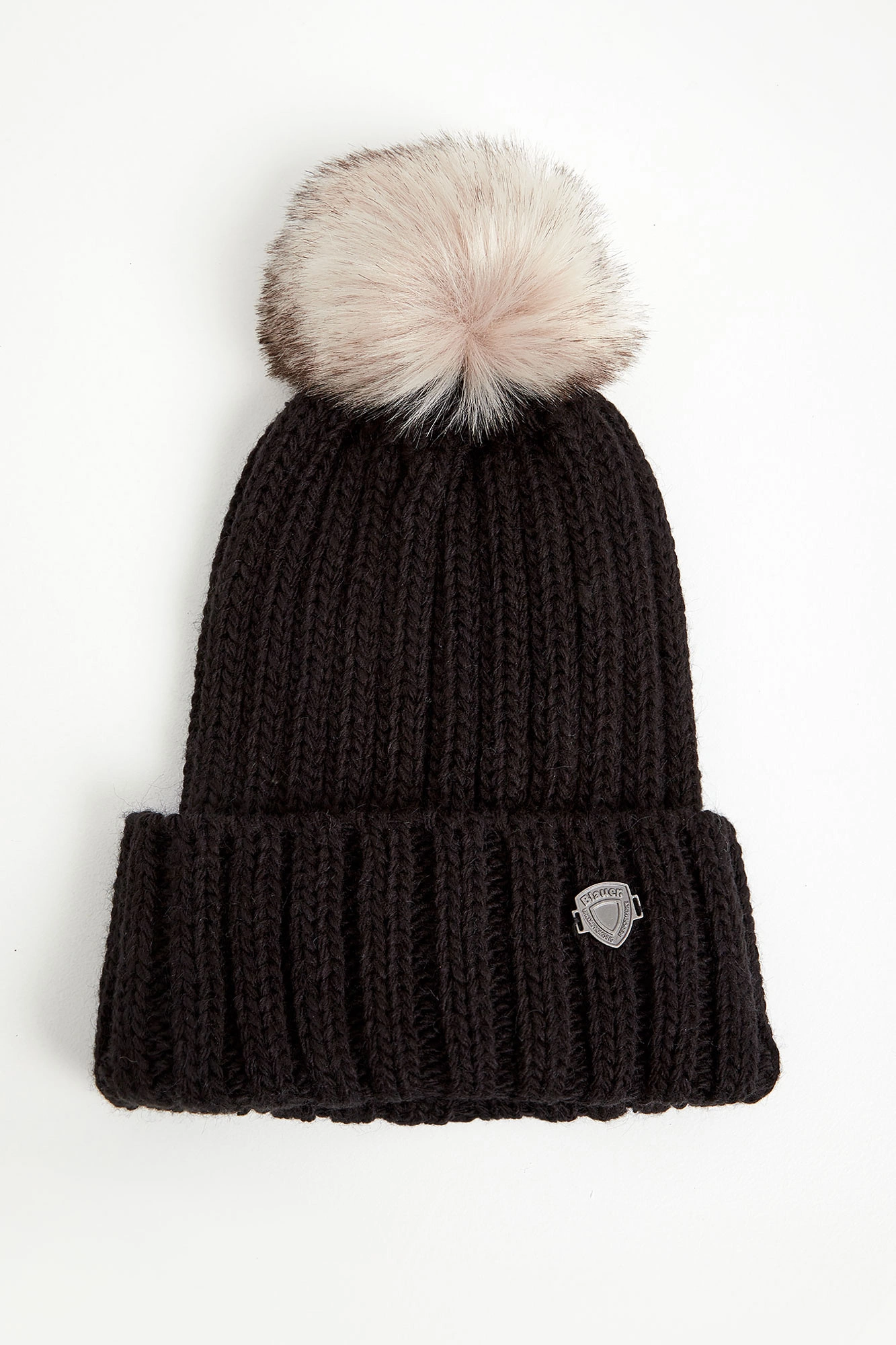 Czapka marki Blauer w czarnym kolorze. Dół wykończony zawinięciem z metalową, aplikacją z tłoczona nazwą marki w srebrnym kolorze. U góry ozdobny pompon w beżowym kolorze. Na całości warkoczowy splot.