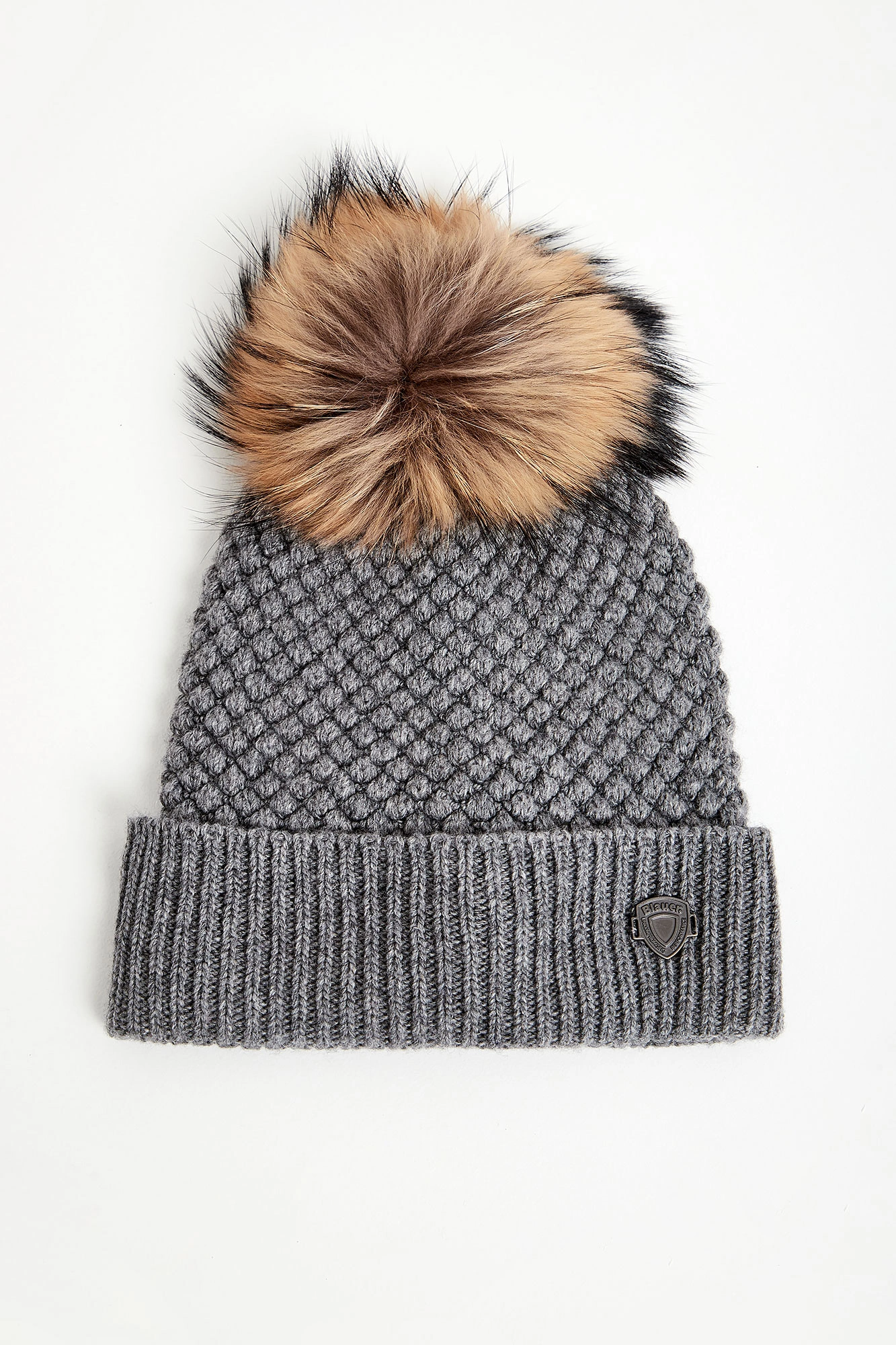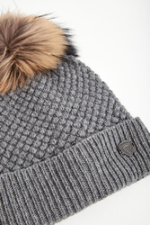 Czapka marki Blauer w szarym kolorze. Dół wykończony zawinięciem z metalową aplikacją z tłoczoną nazwą marki w srebrnym kolorze. U góry ozdobny pompon w beżowym kolorze. Na całości przeszycia. Wykonana z elastycznej mieszanki, wełny, kaszmiru i wiskozy.