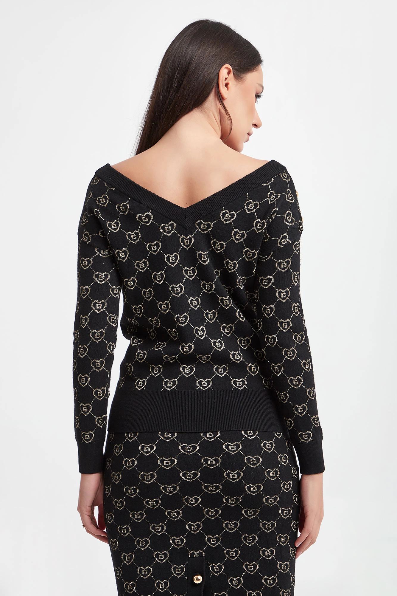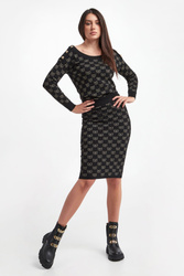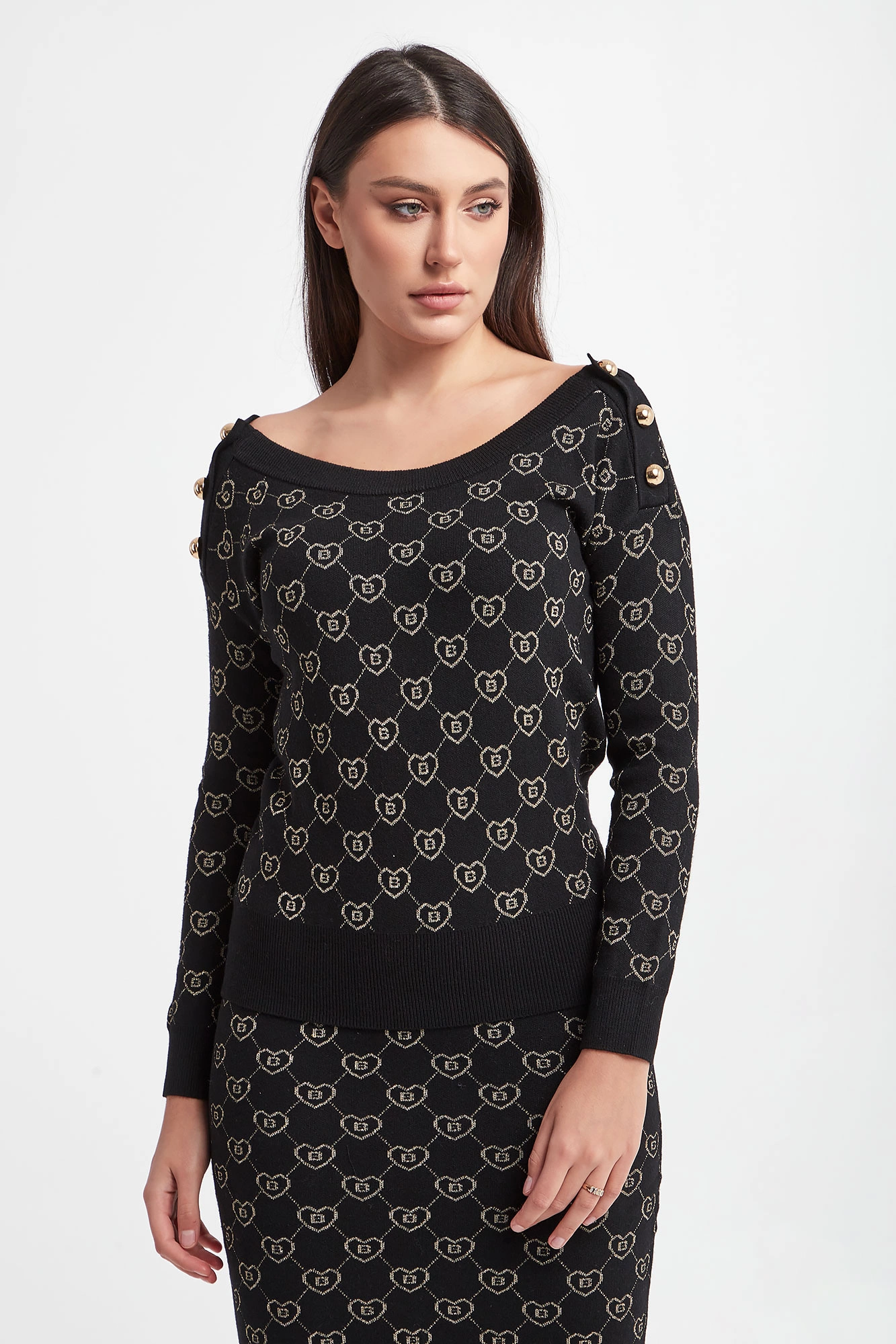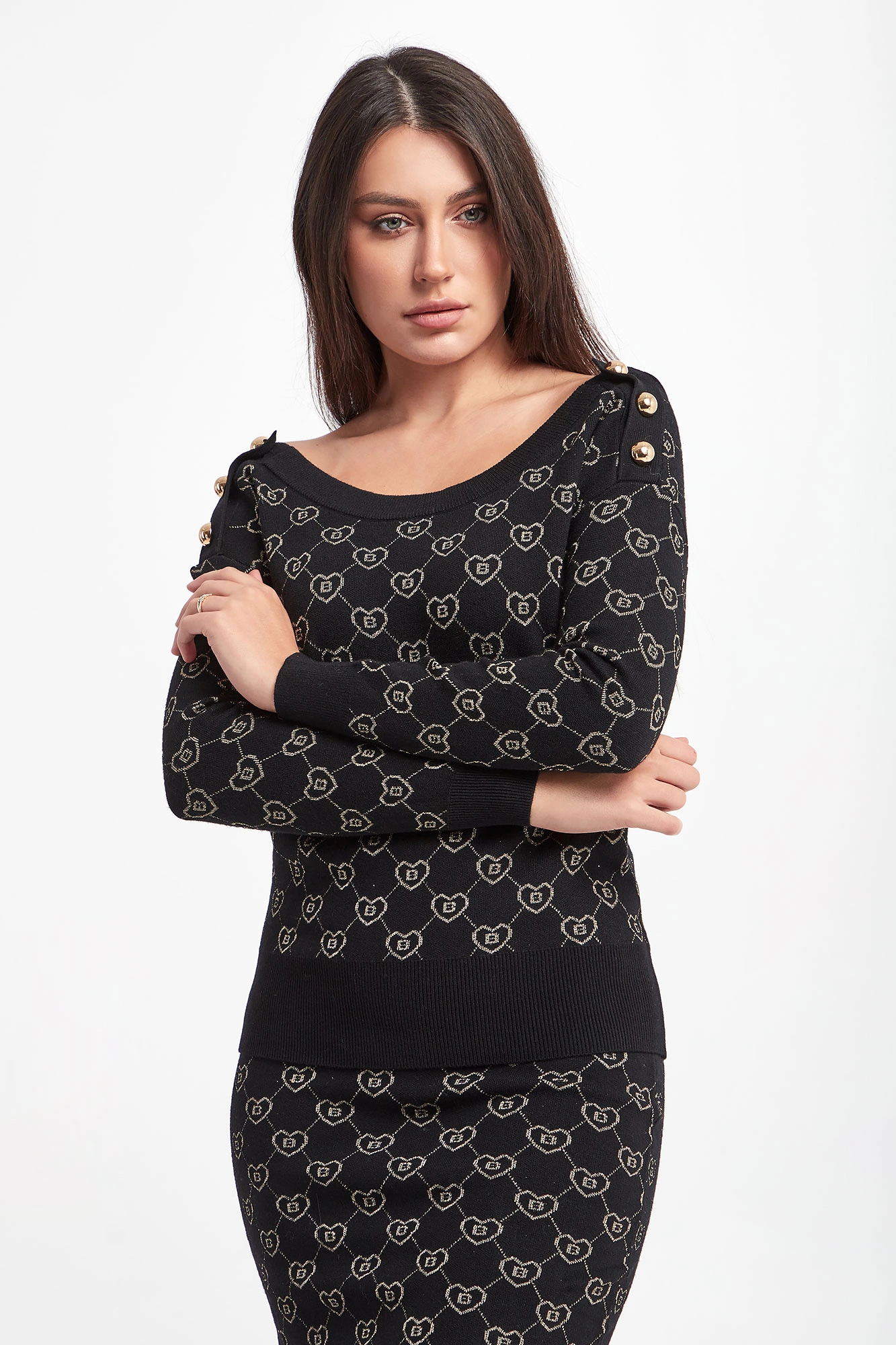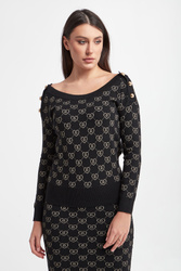 Sweter marki Blugirl Blumarine w kolorze czarnym. Na całości złoty wzór z monogramem marki. Dekolt typu o-neck, długie rękawy i dół zakończone ściągaczami. Z tyłu dekolt w kształcie litery V. Na ramionach pagony ozdobione złotymi, biżuteryjnymi guzikami. Fason typu regular.