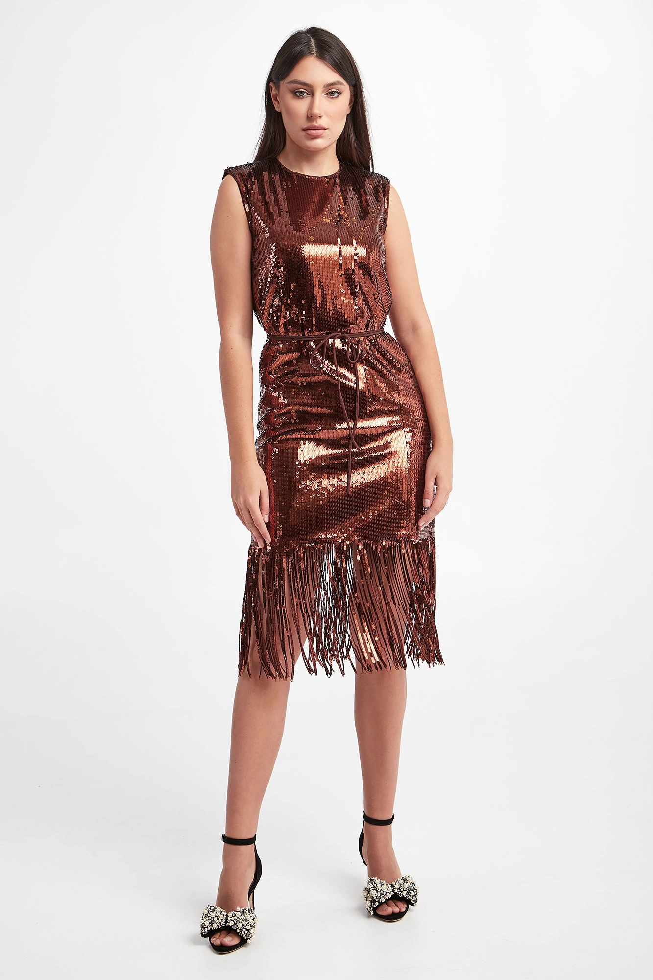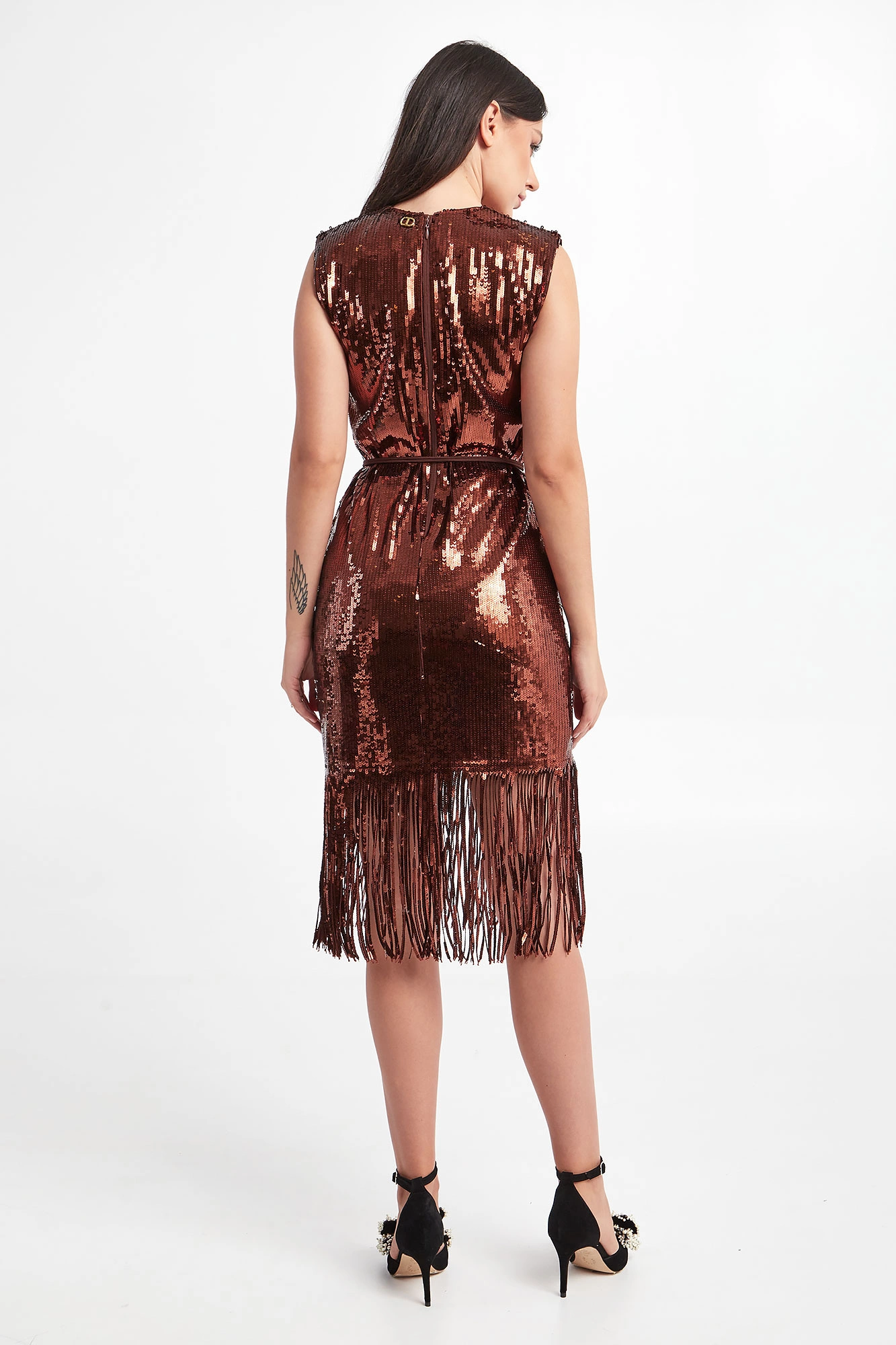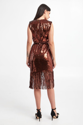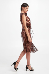 Sukienka marki Twinset w brązowym kolorze. Na całości cekiny. Dekolt typu o-neck. Bez rękawów. W zestawie pasek. Wykończona cekinowymi frędzlami. Zapinana za pomocą tylnego zamka. Na linii karku złota, logowana zawieszka. Fason typu relaxed, długość midi. Sukienka wykonana w stylu lat 20.