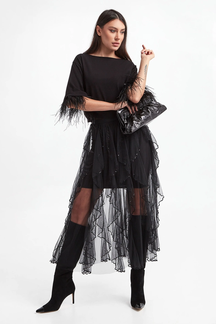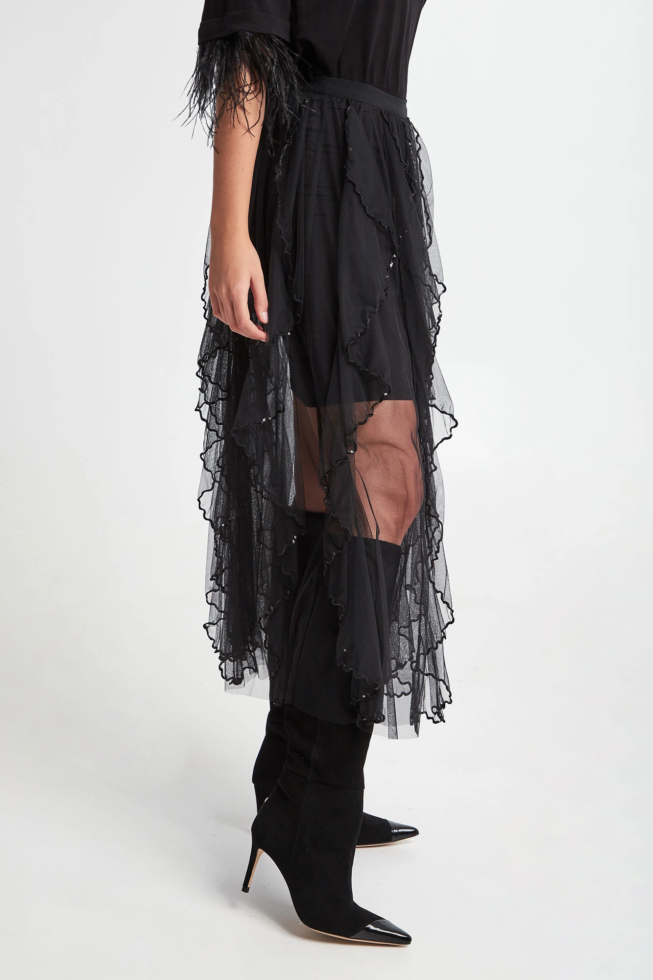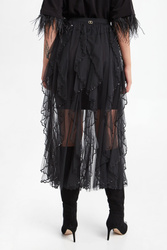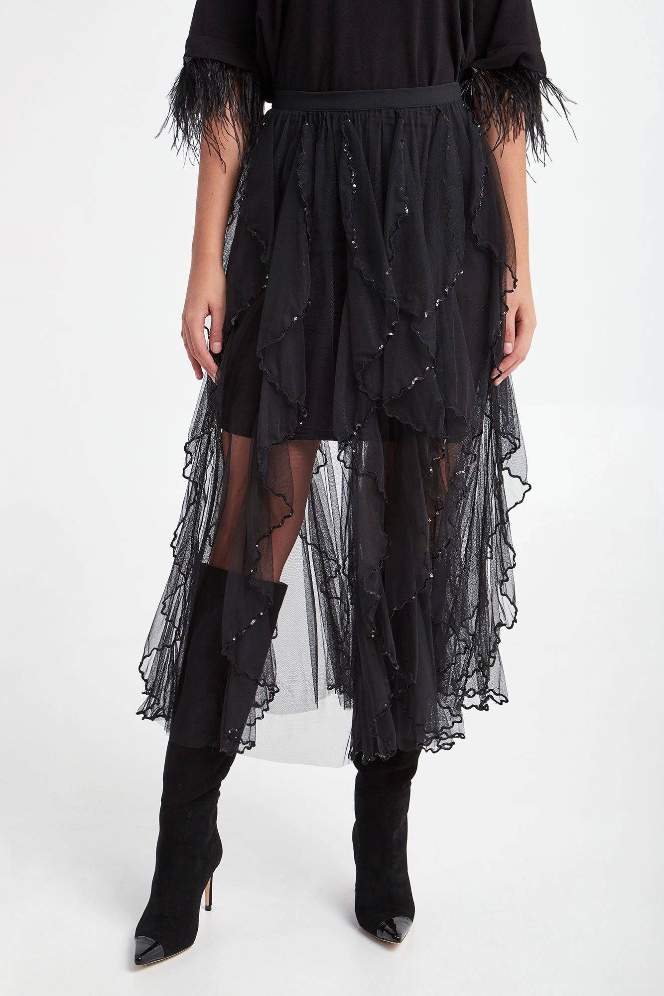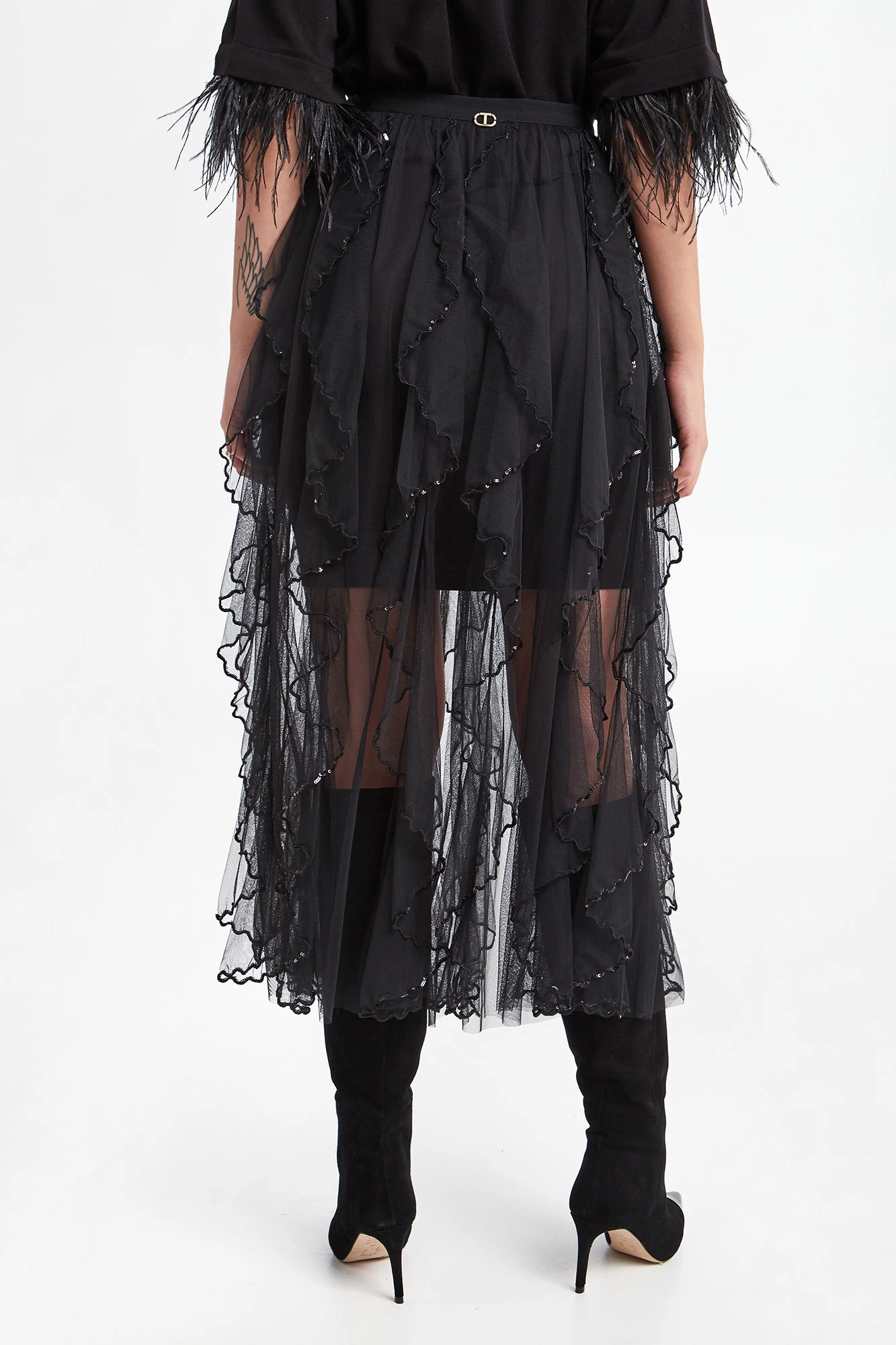 Spódnica marki Twinset w czarnym kolorze. Wykonana z tiulowych, półprzezroczystych falban ozdobionych cekinami. Z tyłu, w pasie złota zawieszka w kształcie monogramu. Zapinana za pomocą bocznego zamka. Pod falbanami wiskozowa podszewka. Fason typu regular, długość midi.