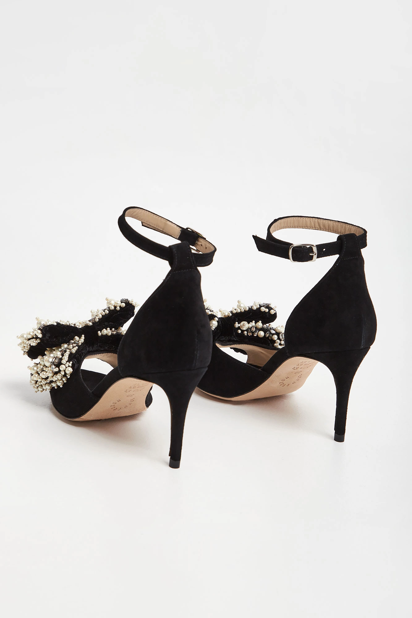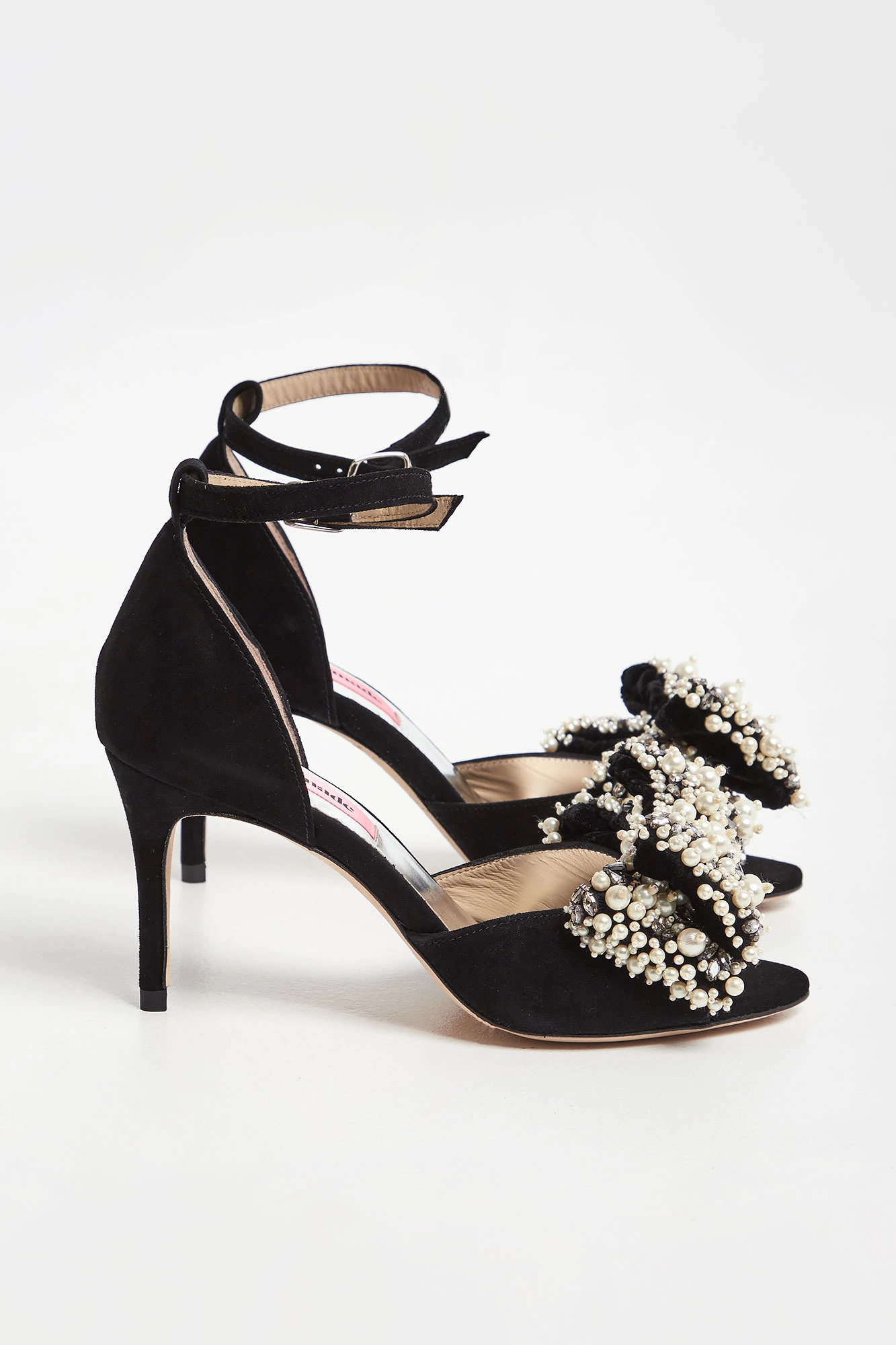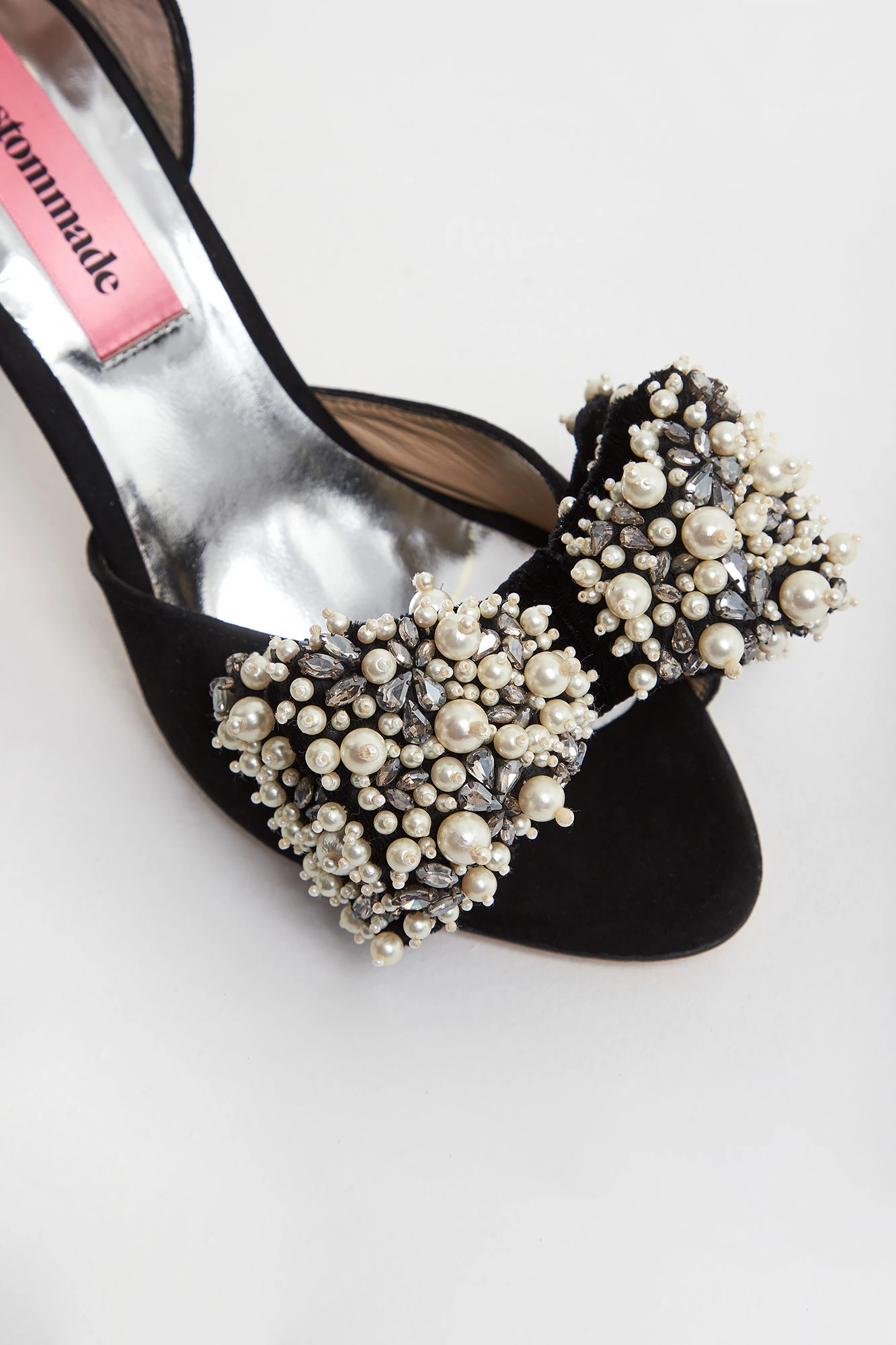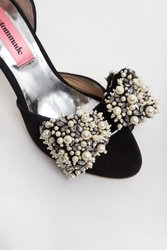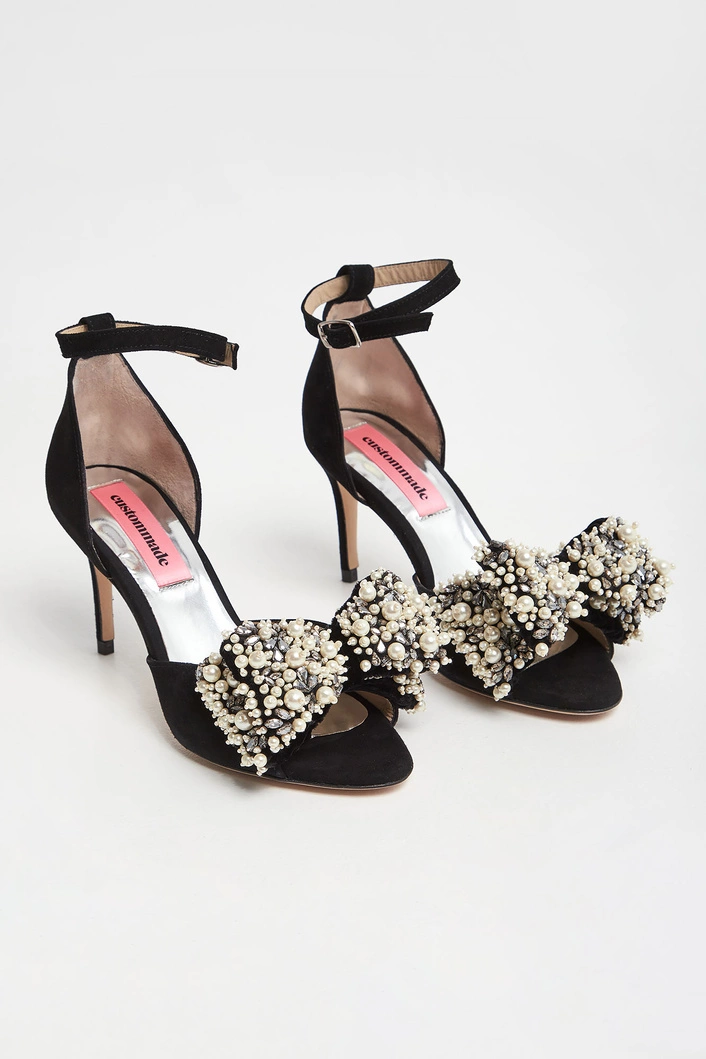 Szpilki marki Custommade w czarnym kolorze. Z przodu odkryte palce i duża podwójna kokarda zdobiona perełkami i kryształkami. Zapinane na kostce za pomocą regulowanego paska z klamrą. Materiał wierzchni wykonany ze skóry zamszowej. Wyściółka skórzana. Buty ręcznie wykonywane.