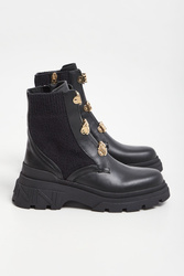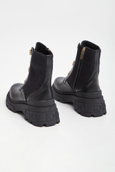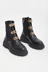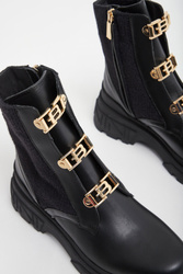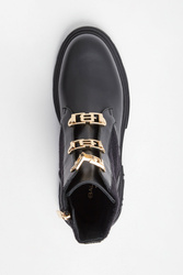 Skórzane botki marki Baldinini w czarnym kolorze. Wykonane z gładkiej, naturalnej skóry. Cholewka oraz bok wykończone materiałowym ściągaczem. Na froncie metalowe ozdobne aplikacje z monogramem marki w złotym kolorze. Zapinane po boku za pomocą zamka. Sygnowana podeszwa.