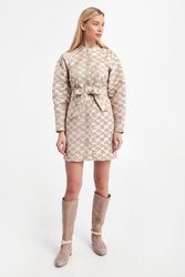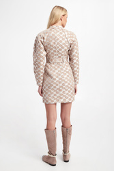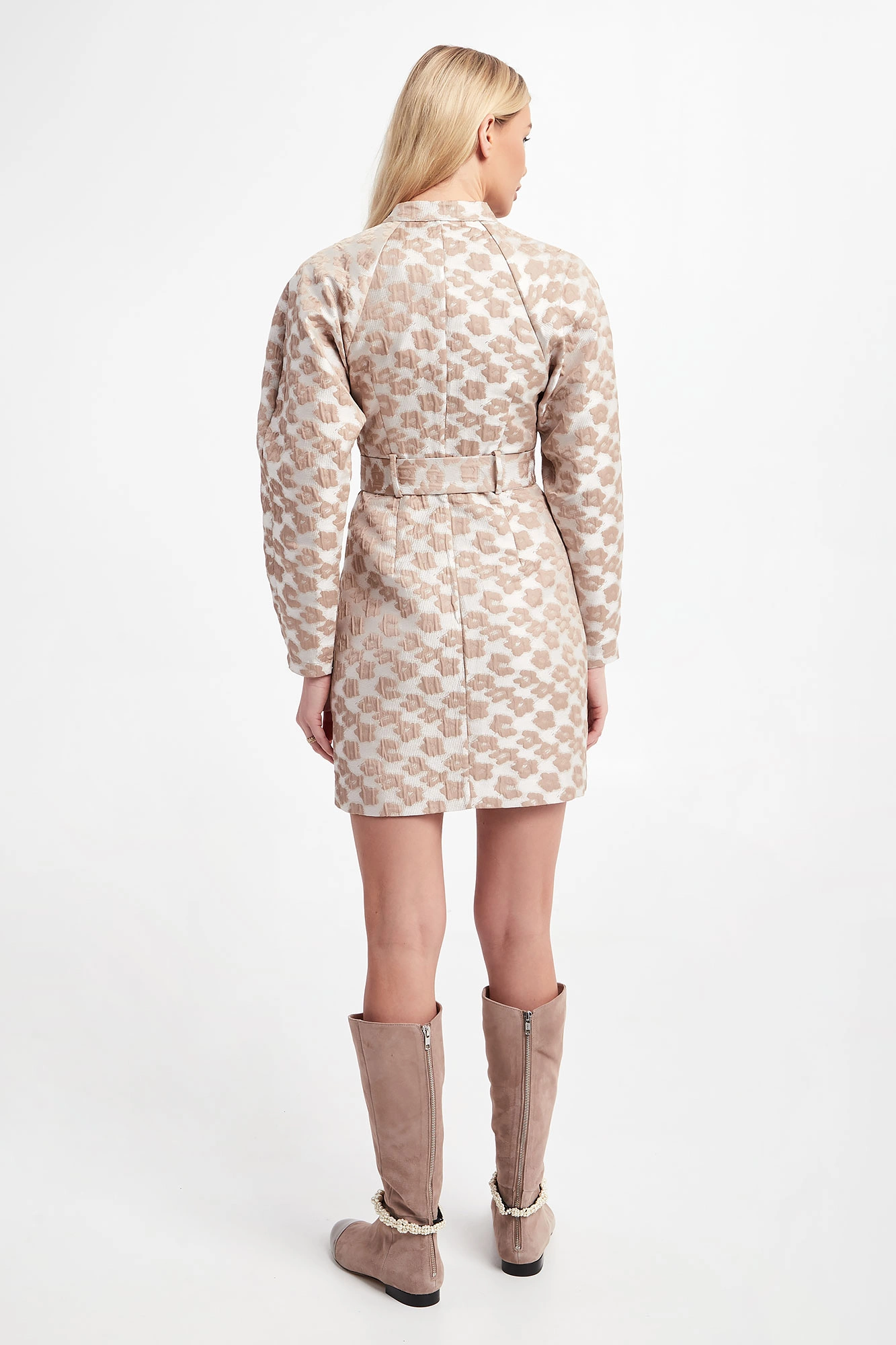 Sukienka w kwiatowy wzór marki Custommade w beżowym kolorze. Dekolt zakończony stójką oraz guzikiem z perłą. Na froncie zapinana za pomocą krytych guzików. W talii wiązany pasek. Luźniejsze rękawy. Fason typu slim, długość mini.