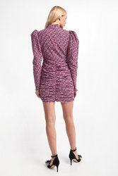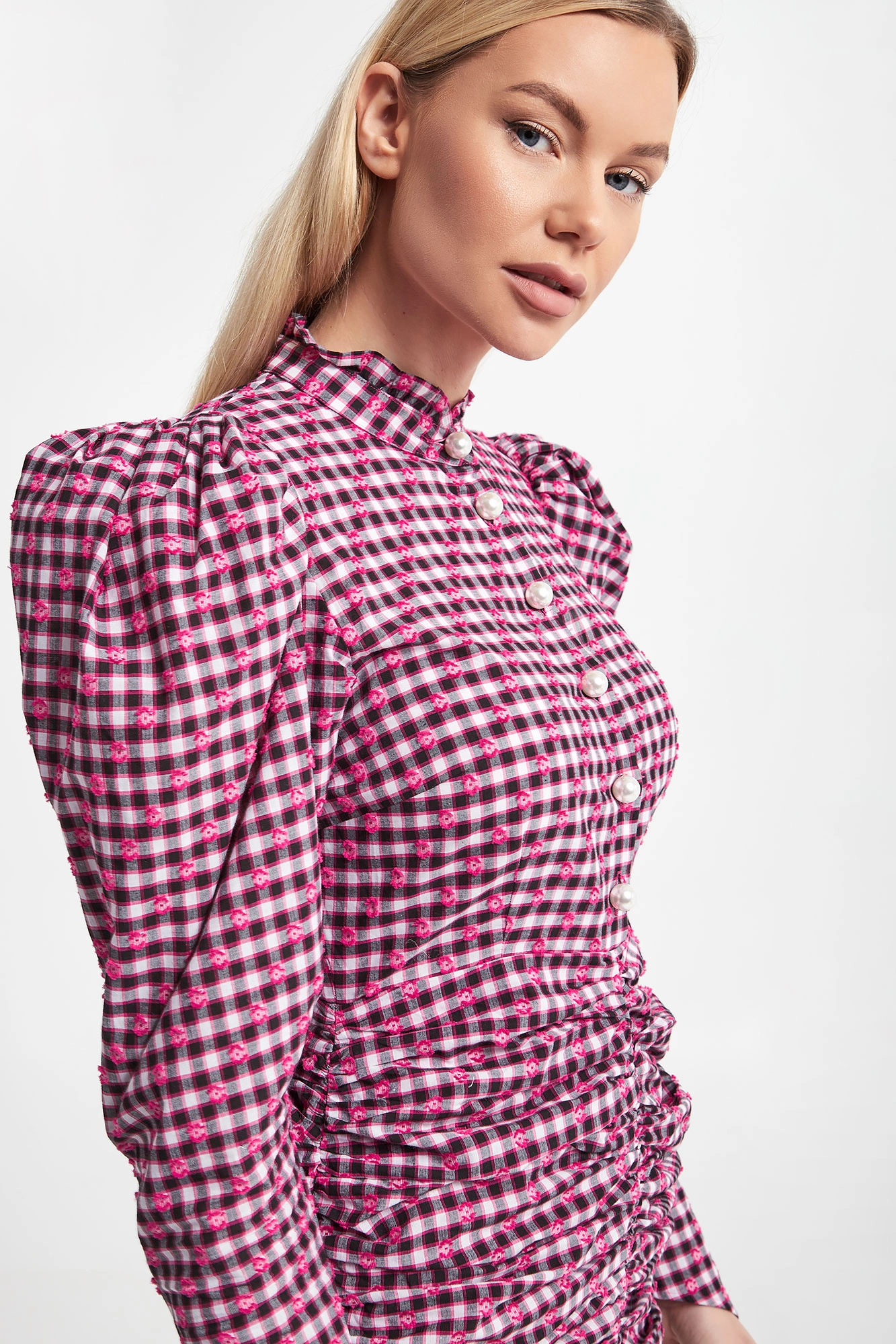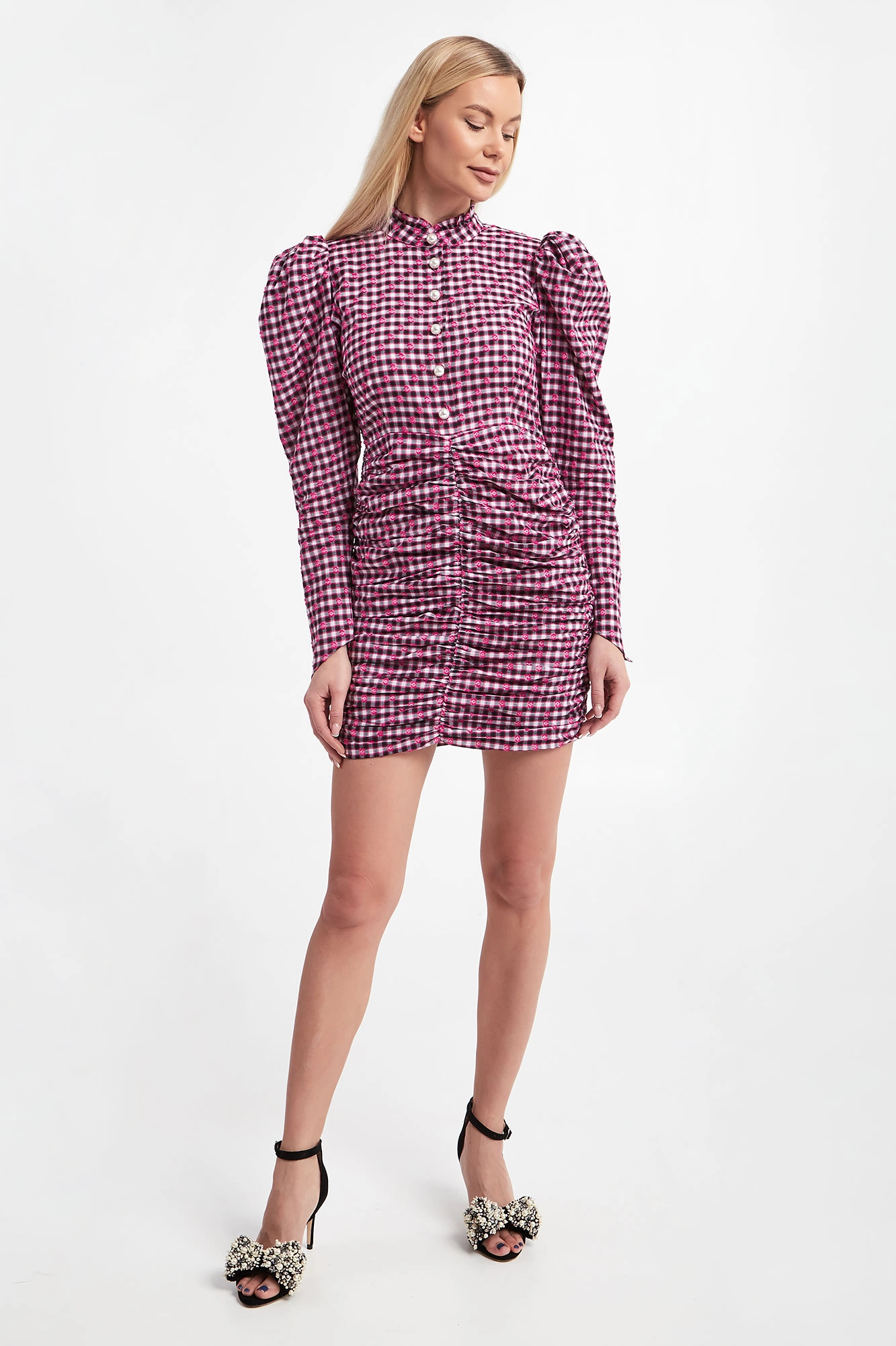 Sukienka w wielokolorową kratkę marki Custommade. Bufiaste rękawy ze skośnym zakończeniem. Haftowany, kwiecisty wzór. Dekolt ze stójką wykończoną falbanką. Guziki z perełkami. Model z marszczoną spódnicą. Fason typu slim, długość mini.
