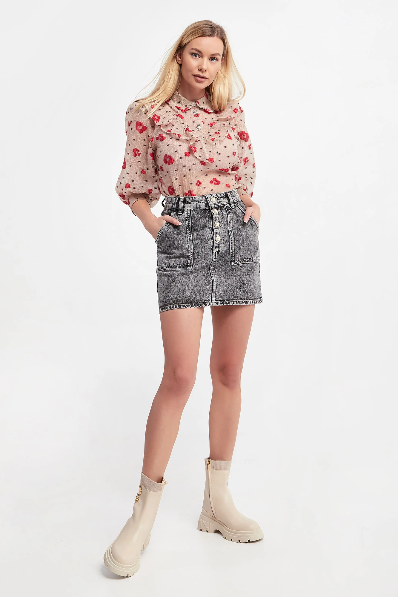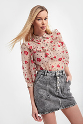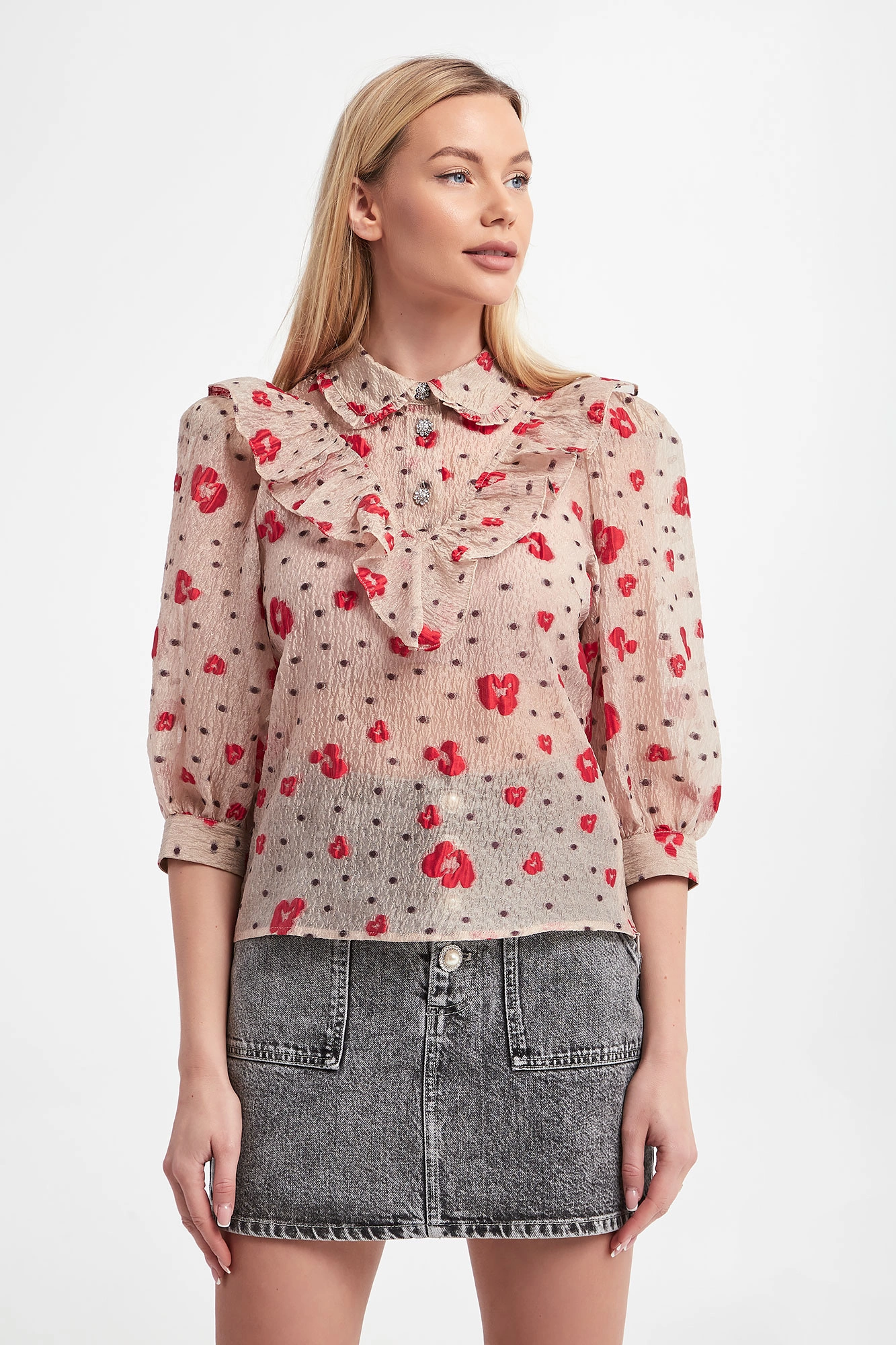 Bluzka marki Custommade w beżowym kolorze. Na całości czerwony, kwiatowy wzór oraz brązowe groszki. Wykonana z półtrasparentnej tkaniny. Dekolt z kołnierzykiem typu bebe, zapinany za pomocą biżuteryjnych guzików z kryształkami. Na froncie żabot. Bufiaste rękawy o długości 3/4 zakończone mankietami. Zapinana za pomocą bocznego zamka. Fason typu regular.