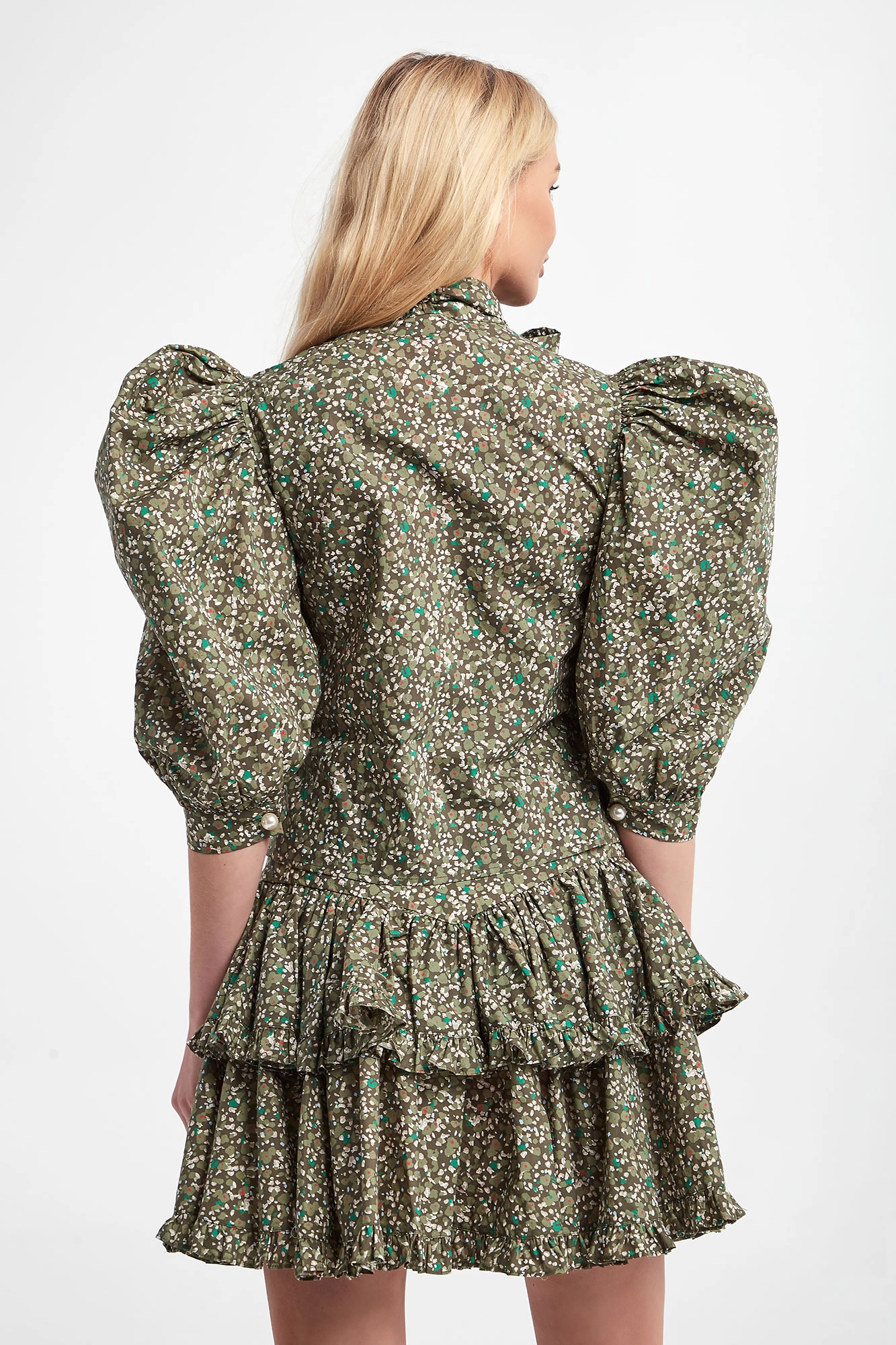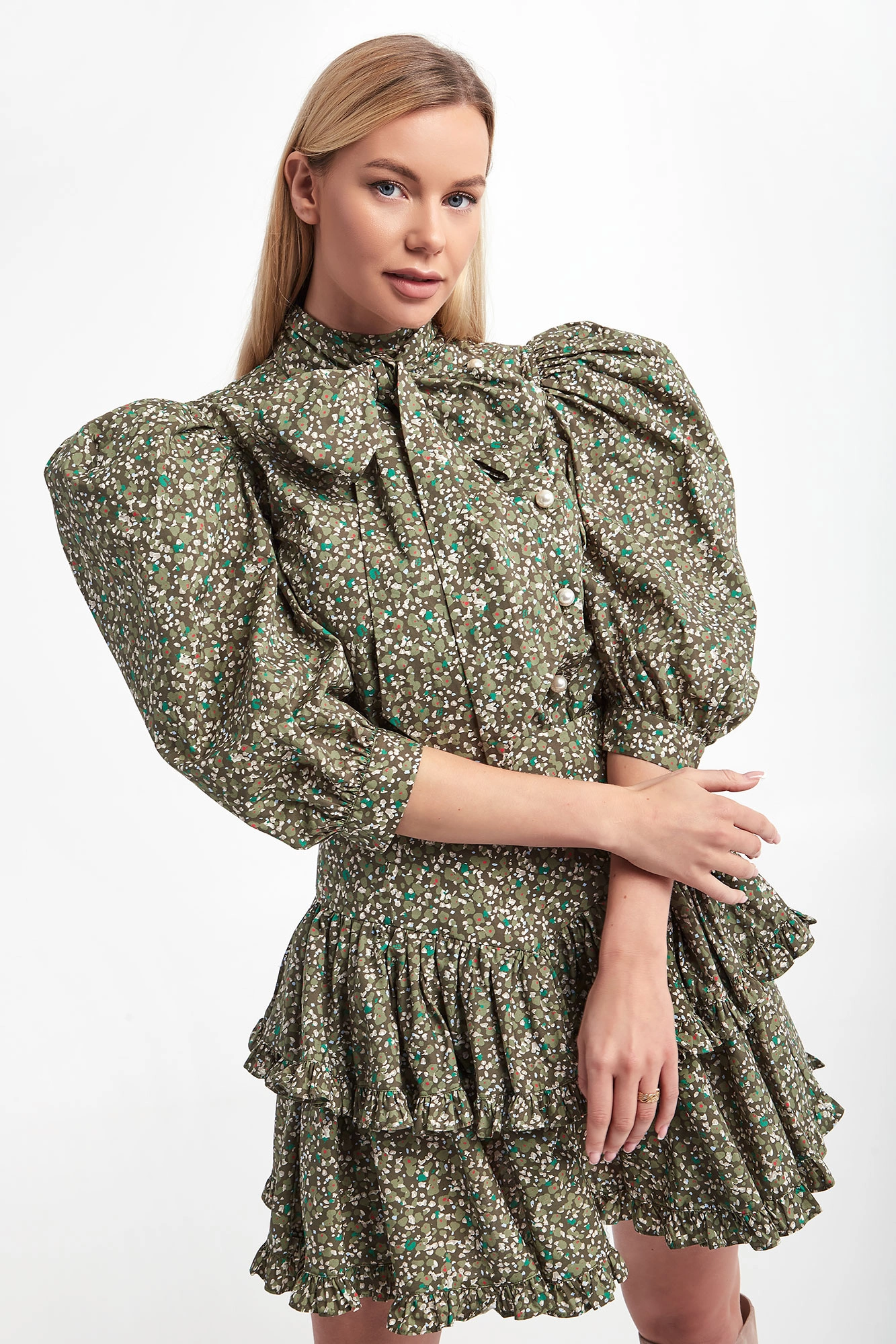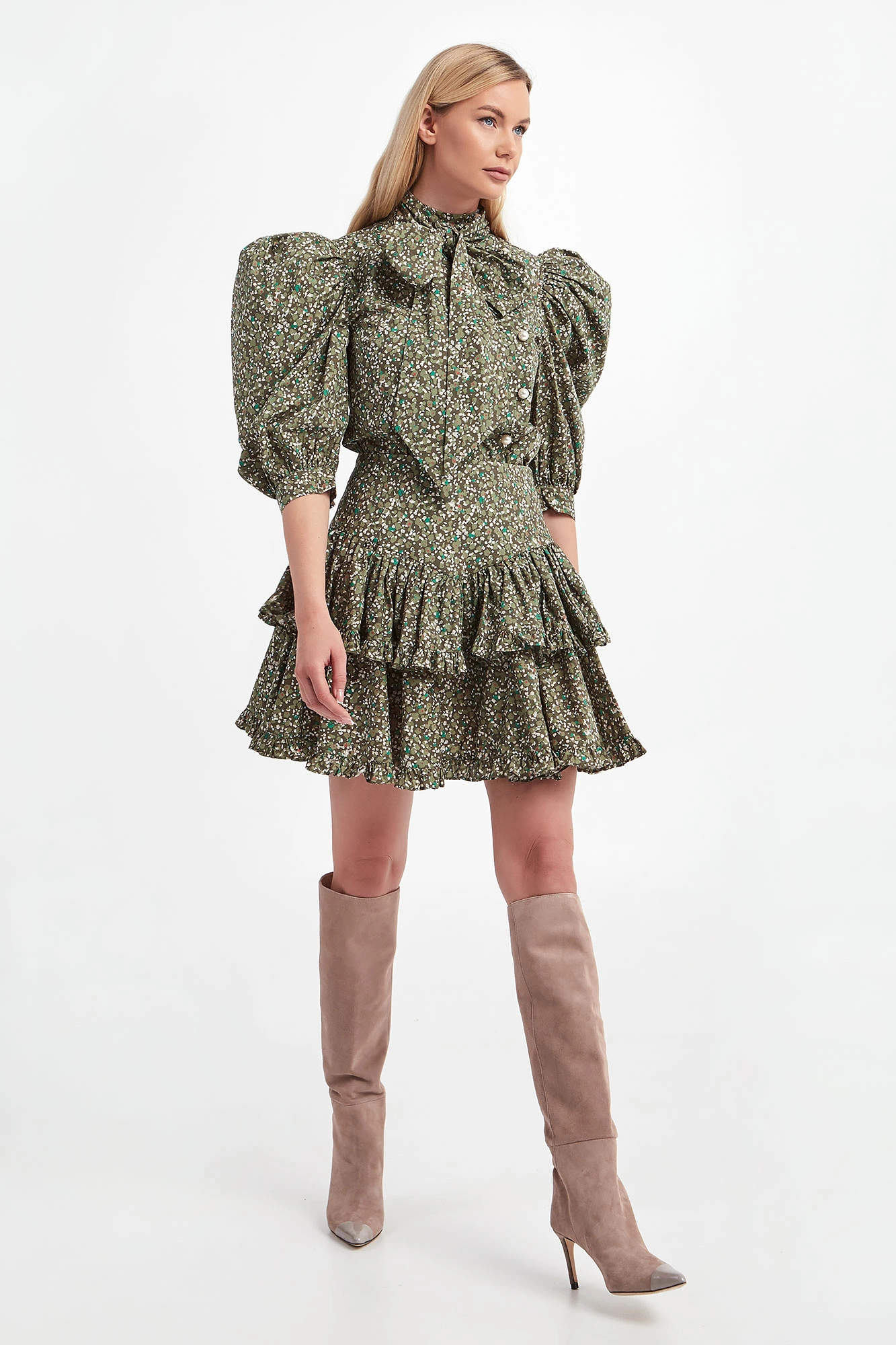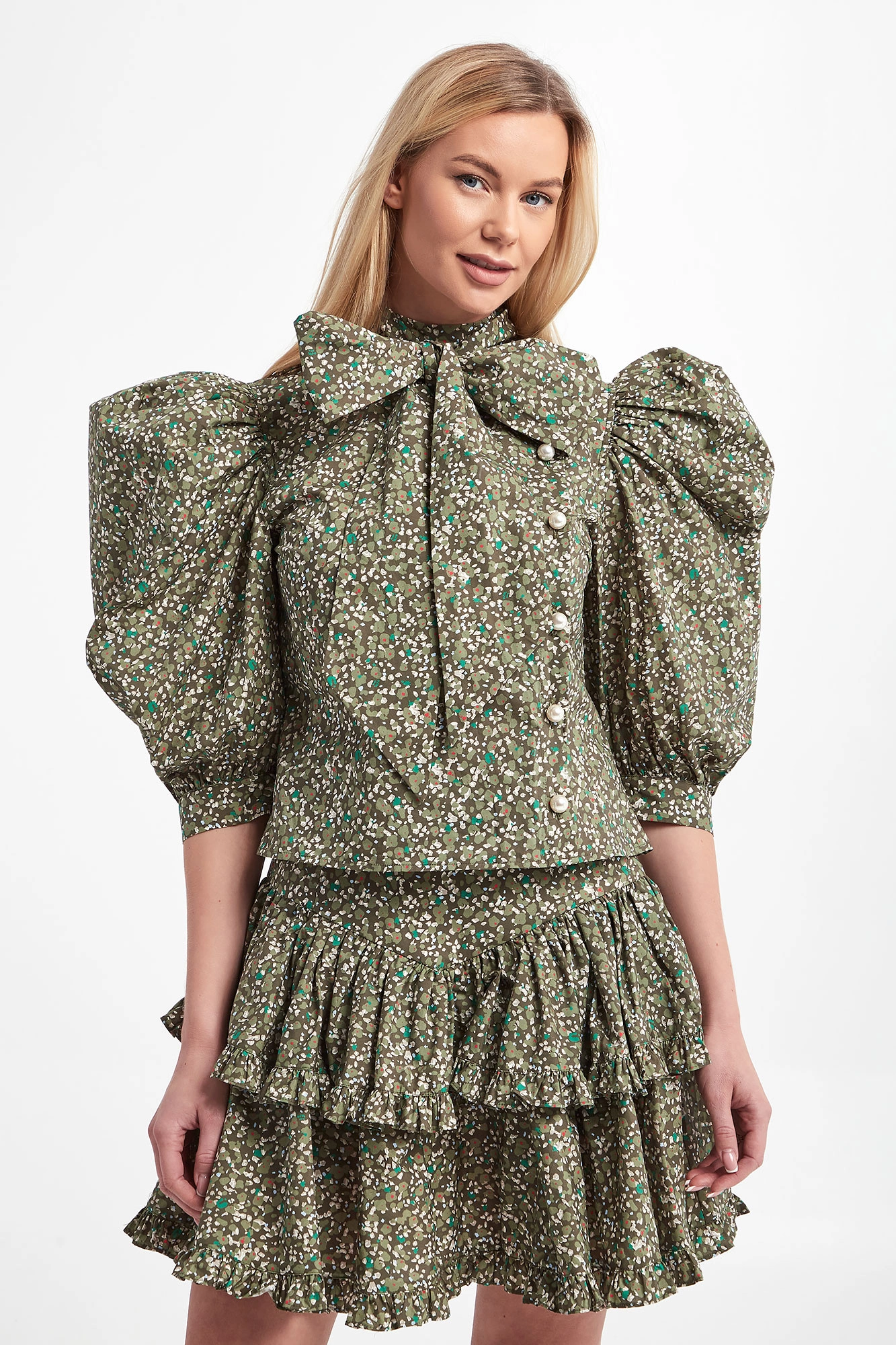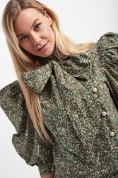 Bluzka marki Custommade w zielonym kolorze. Na całości wielokolorowy wzór. Dekolt z półgolfem i wiązaną dużą kokardą. Zapinana z boku za pomocą perłowych guzików. Bufiaste rękawy o długości 3/4 zakończone zapinanymi mankietami. Fason typu regular. Wykonana z bawełny organicznej.