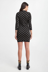 Sukienka marki Blugirl Blumarine w czarnym kolorze. Na całości złoty wzór z monogramem marki. Zapinana za pomocą złotych, biżuteryjnych guzików. Dekolt typu v-neck, rękawy o długości 3/4 i dół zakończone ściągaczami. Po bokach patki imitujące kieszenie. Fason typu slim, długość mini.