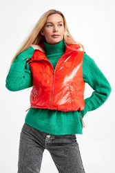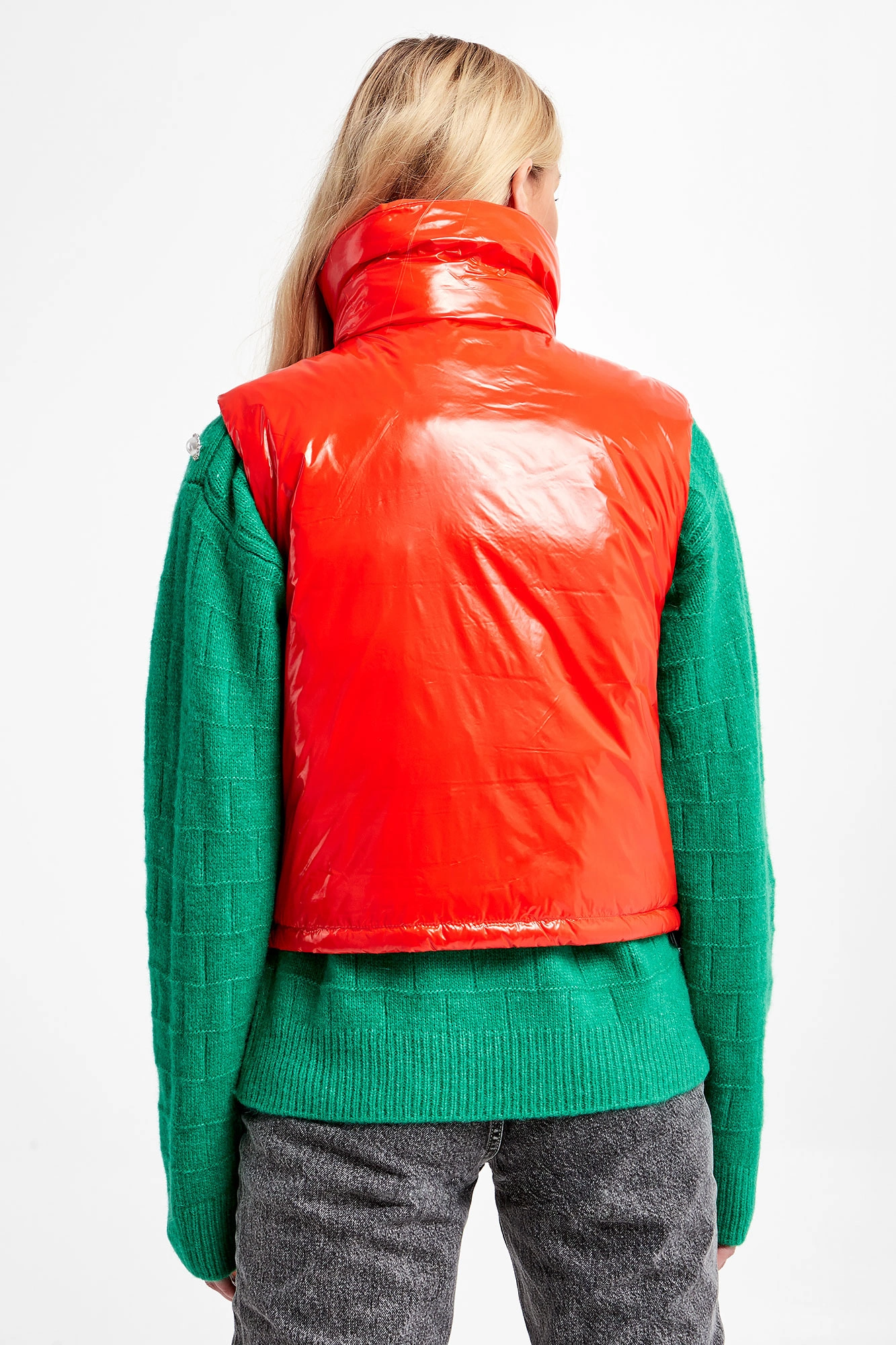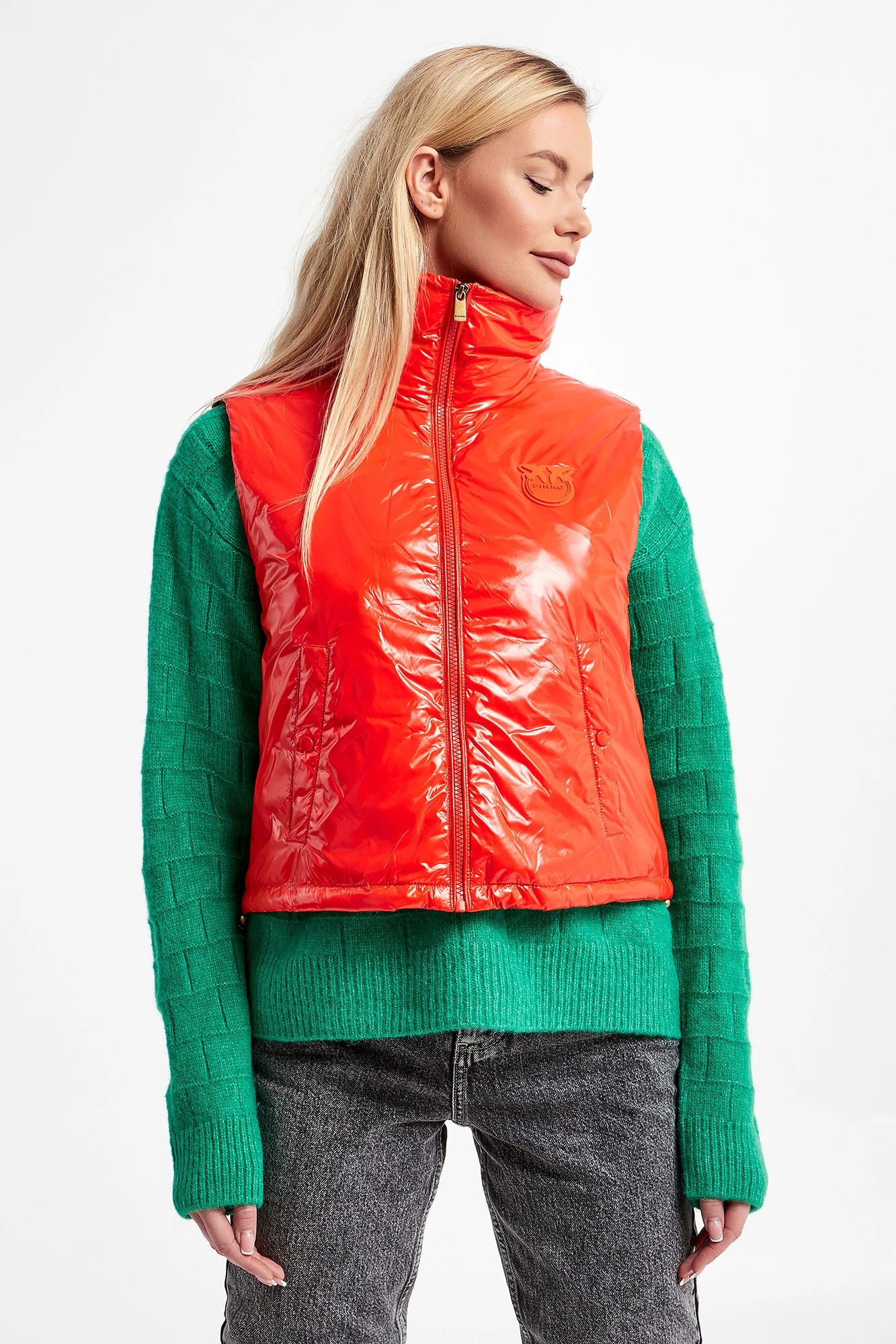 Kamizelka ze stójką marki Pinko w kolorze pomarańczowym. Wykonana z połyskującej tkaniny. Zapinana na zamek. Model z dwiema kieszeniami zapinanymi na napy. Na froncie gumowa aplikacja z logo marki. Dół z elastycznymi troczkami ze stoperami, umożliwiającymi regulację. Fason regular.