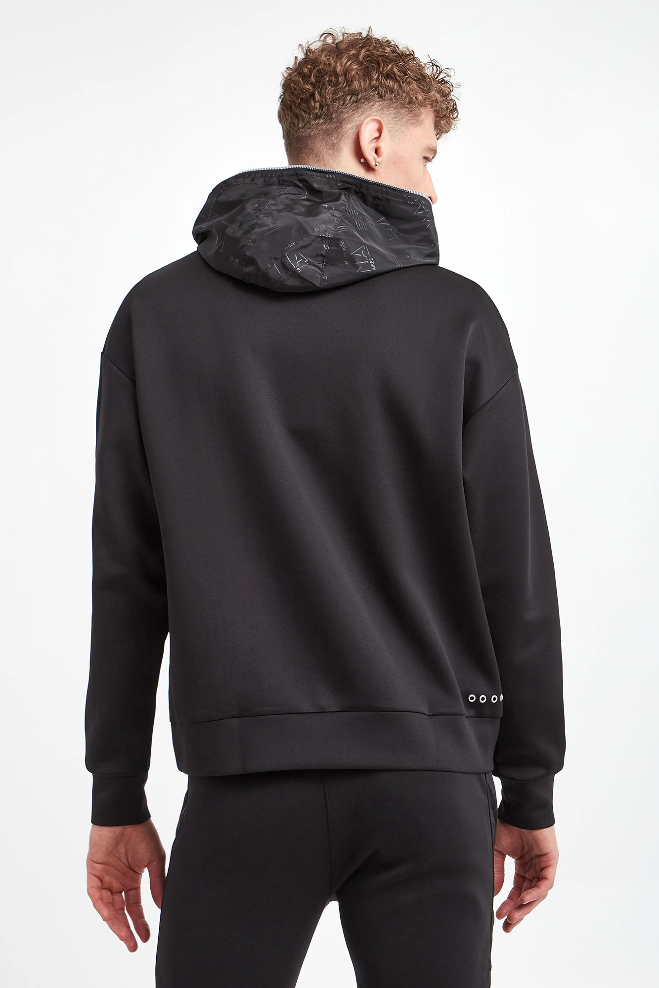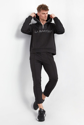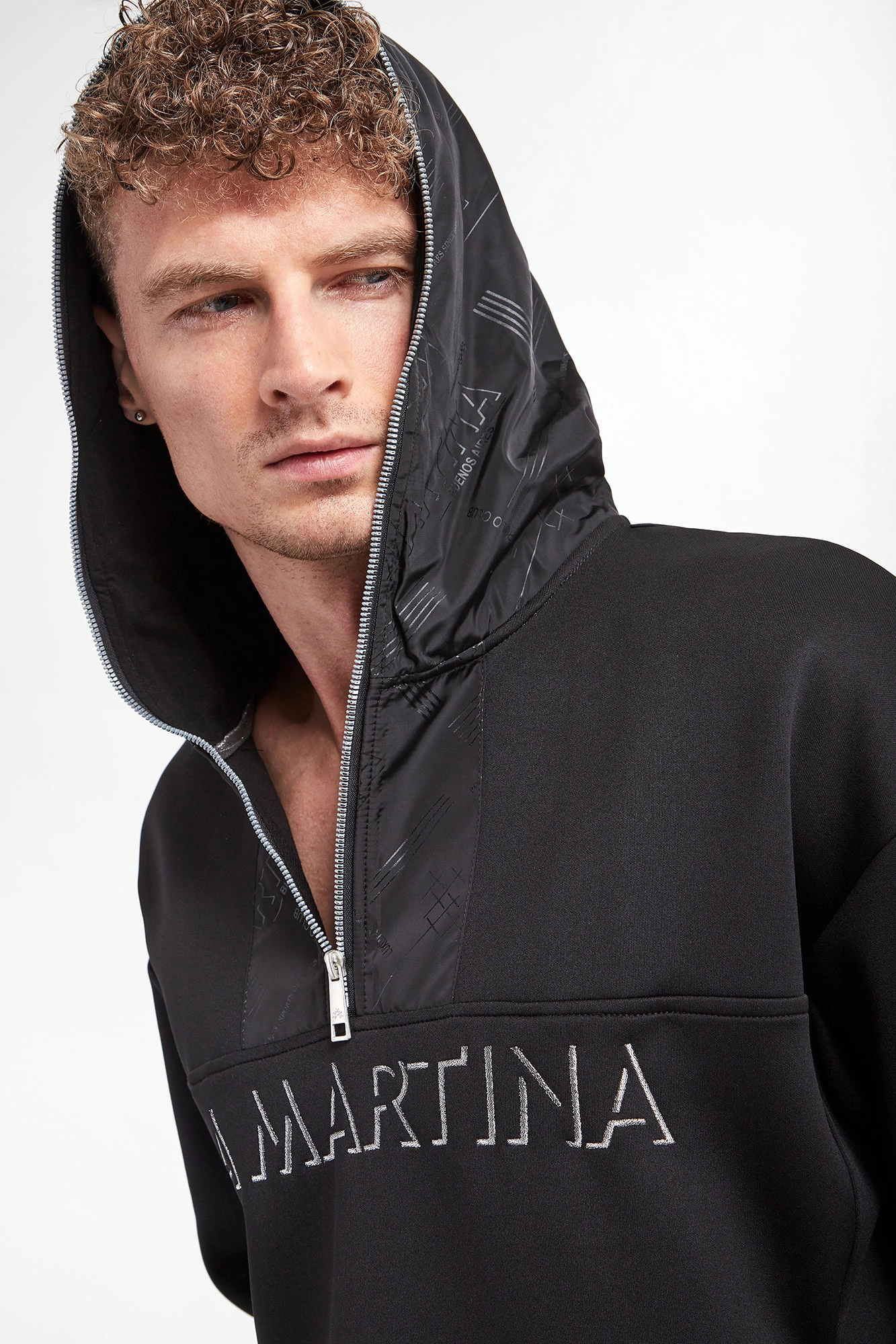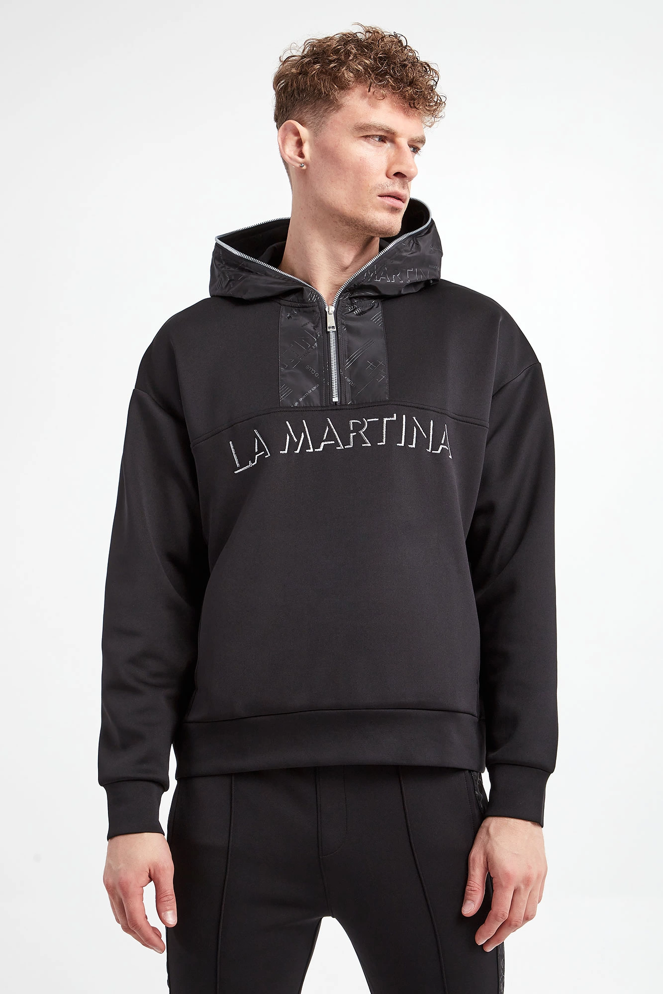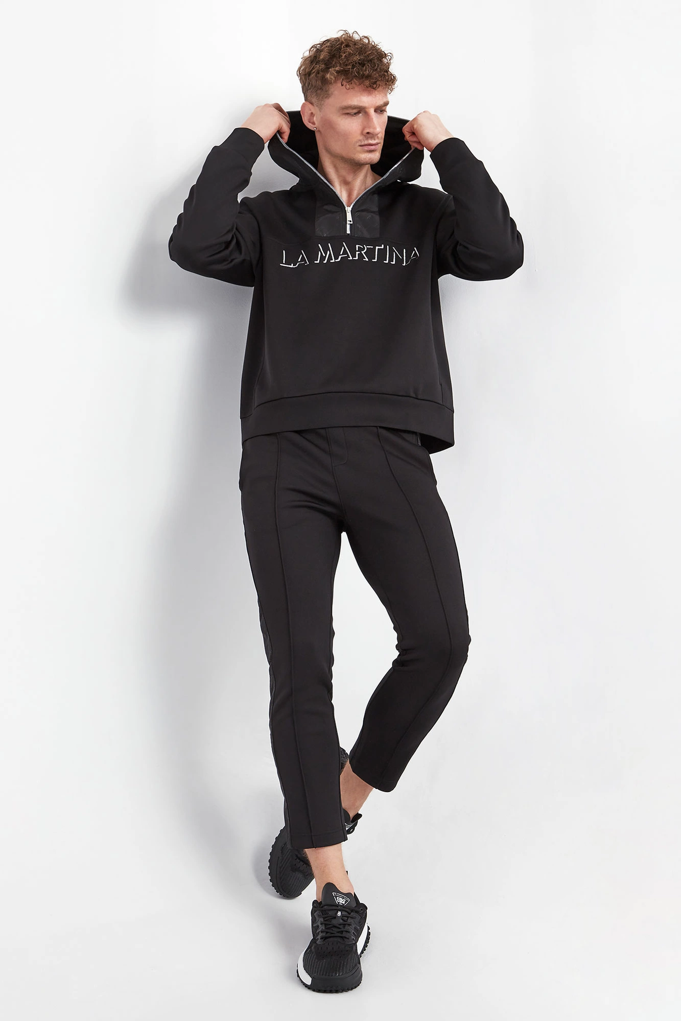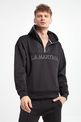 Bluza z kapturem marki La Martina w czarnym kolorze. Na froncie połyskujący haft z nazwą marki. Dekolt i kaptur zapinane za pomocą zamka ze wstawką logowanego materiału. Dwie boczne, wpuszczane kieszenie. Rękawy i dół zakończone gładkimi ściągaczami. Obniżona linia ramion. Fason typu relaxed.