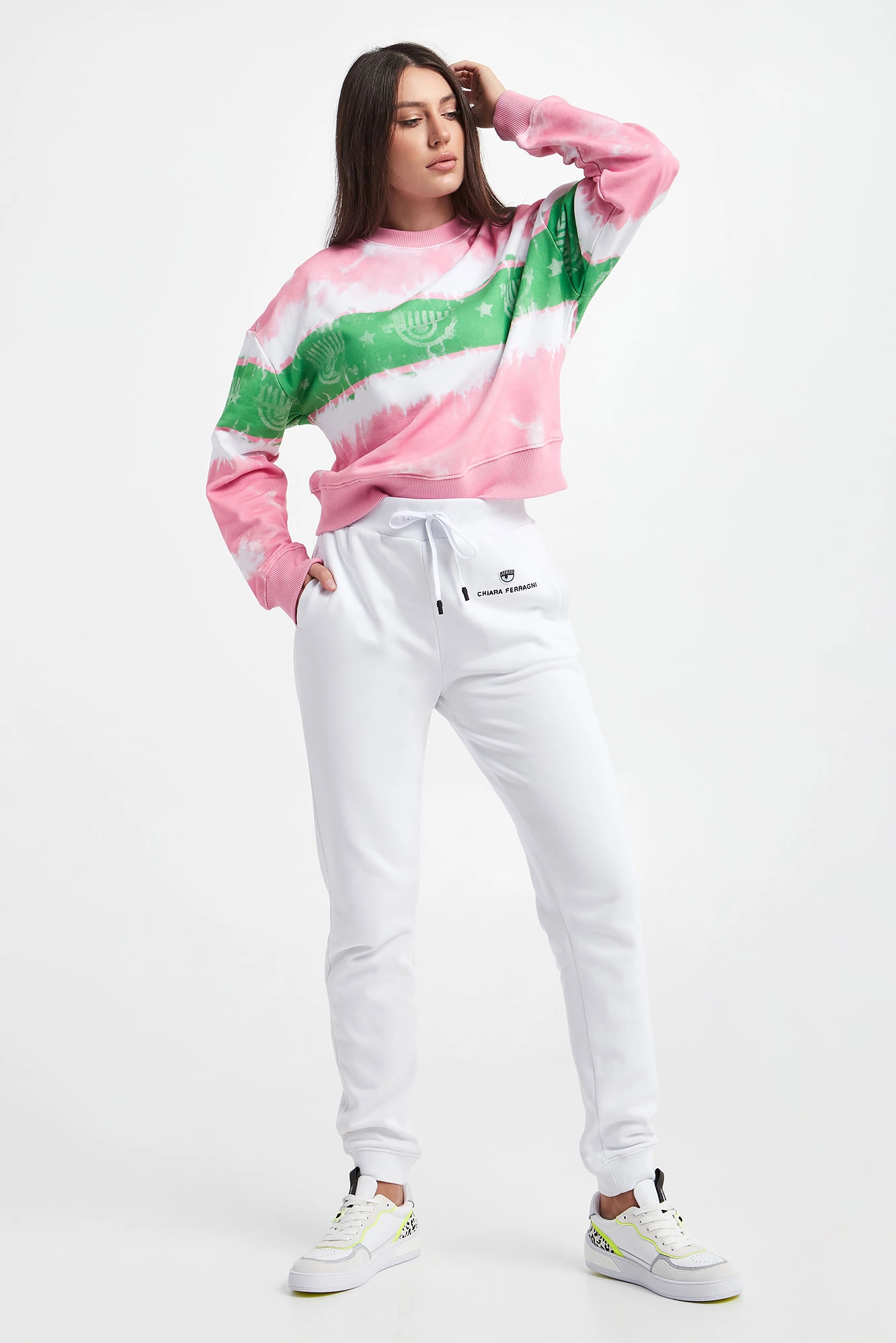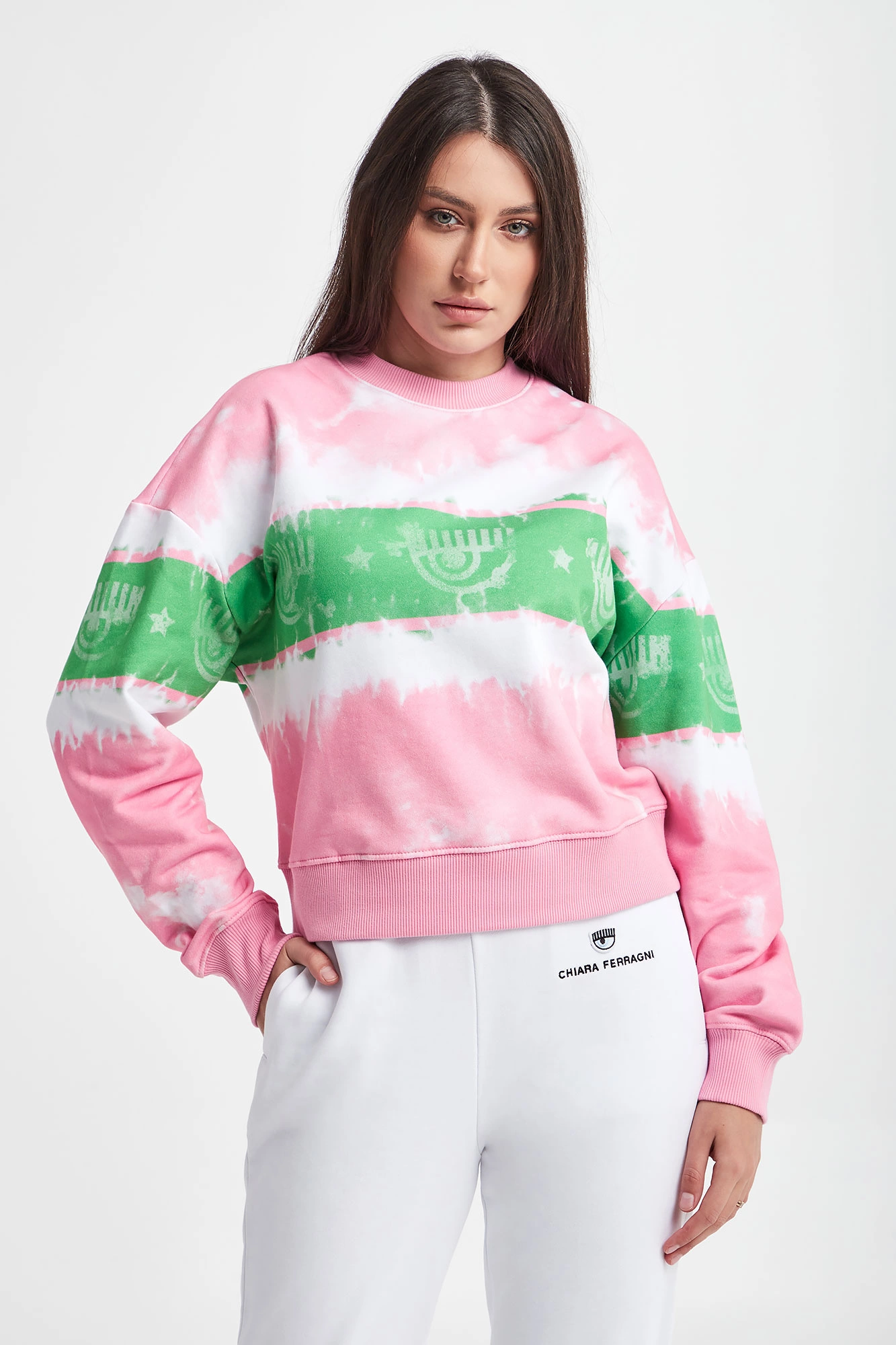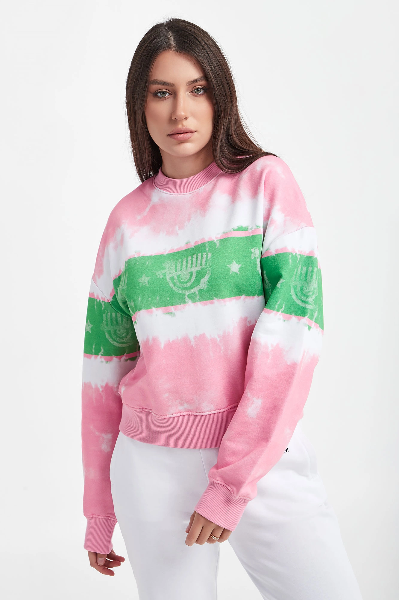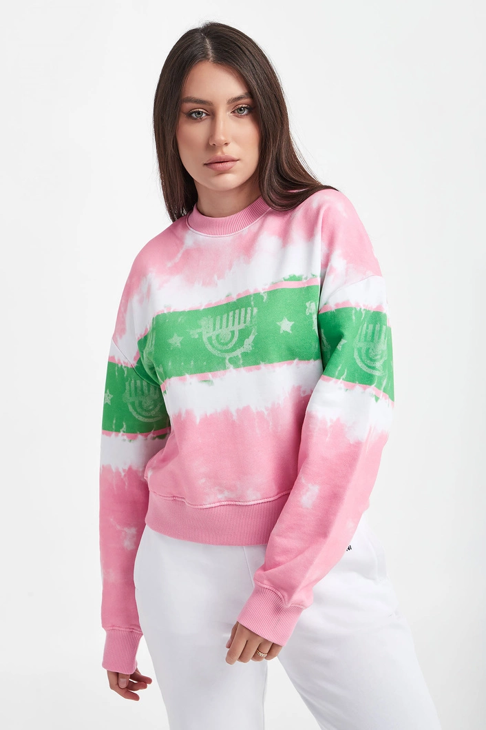 Bluza marki Chiara Ferragni w różowo-białym kolorze z efektem tie-dye. Na środku zielony pasek ozdobiony charakterystycznym dla marki motywem oka. Dekolt typu o-neck, długie rękawy i dół wykończone prążkowanymi ściągaczami. Obniżona linia ramion. Fason typu regular. Wykonana z czystej bawełny.