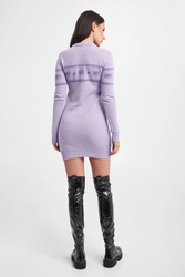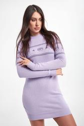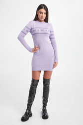 Sukienka marki Chiara Ferragni w liliowym kolorze. Na środku brokatowy, charakterystyczny dla marki motyw oka. Dekolt typu o-neck, długie, przylegające rękawy i dół zakończone prążkowanymi ściągaczami. Fason typi slim, długość mini. Wykonana z wełnianej tkaniny z domieszką wiskozy, kaszmiru oraz elastycznych włókien poliamidowych.