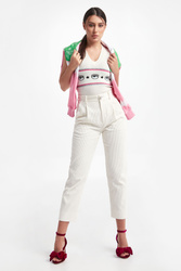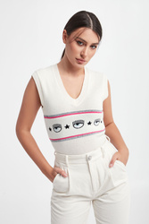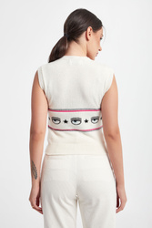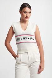 Kamizelka marki Chiara Ferragni w kolorze ecru. Na środku charakterystyczne dla marki motywy oka oraz srebrne, połyskujące paski. Dekolt typu v-neck, ramiona i dół wykończone prążkowanymi ściągaczami. Fason typu slim. Wykonana z wiskozowej tkaniny z domieszką wełny, kaszmiru oraz elastycznych włókien poliamidowych.