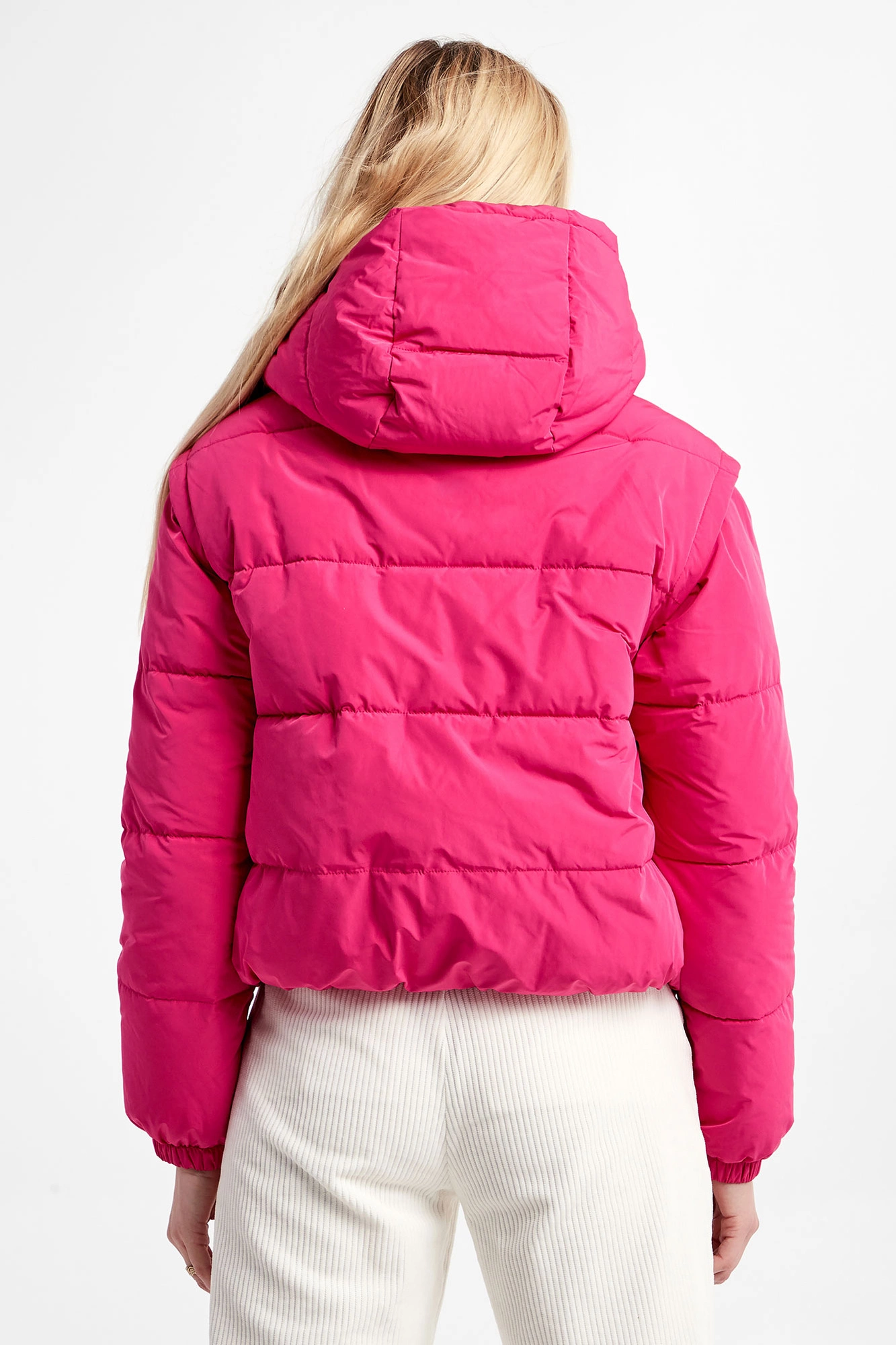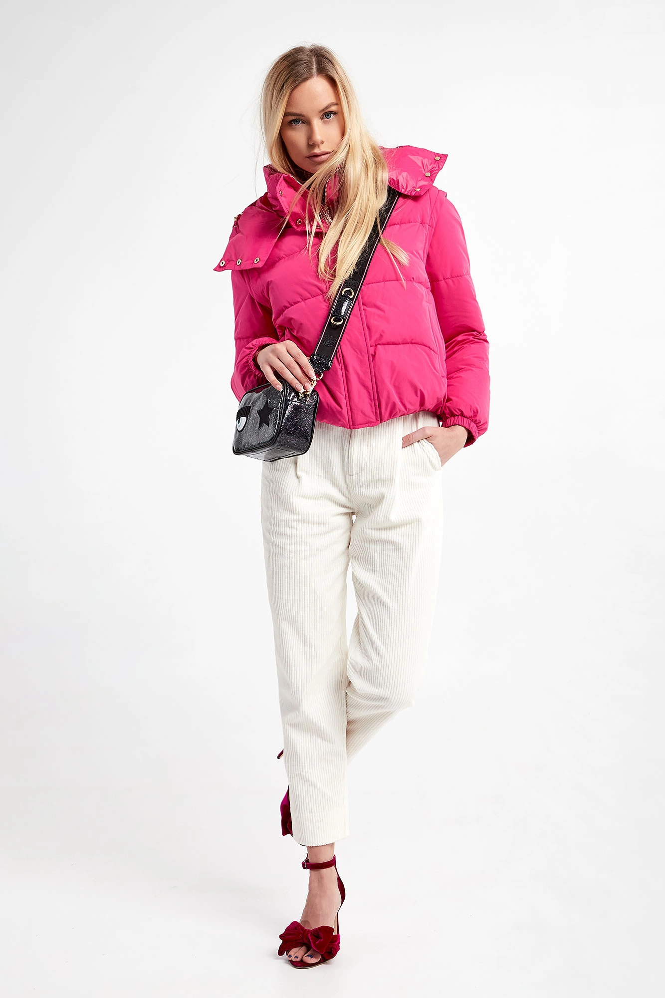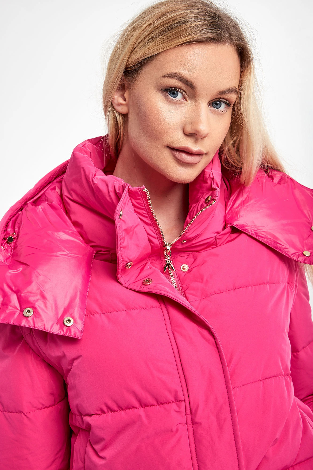 Pikowana kurtka marki Patrizia Pepe w różowym kolorze. Z odpinanym kapturem. Rękawy zakończone elastycznym ściągaczem, odpinane u góry za pomocą zamka. Zapinana za pomocą dwukierunkowego zamka i nap. Dół zakończony ściągaczem. Model z dwoma kieszeniami. Fason typu regular. Syntetyczne wypełnienie.