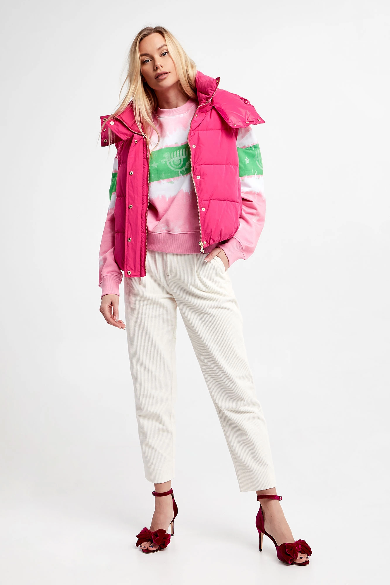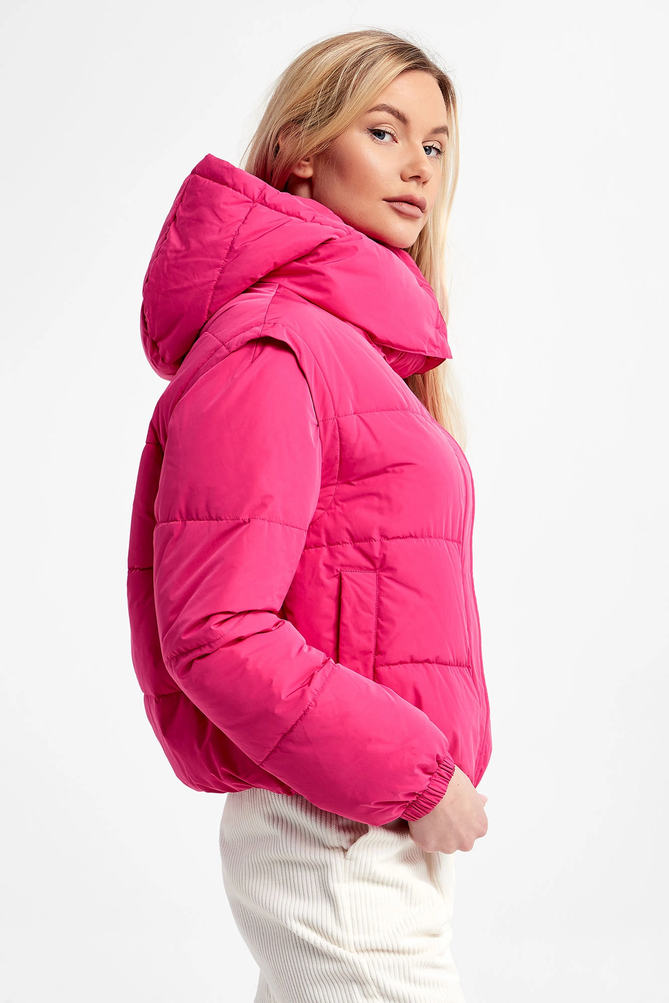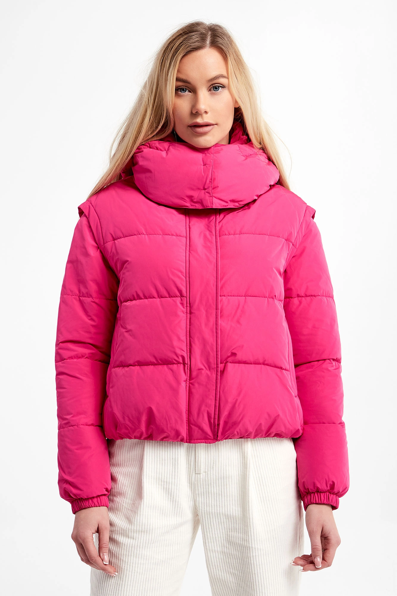 Pikowana kurtka marki Patrizia Pepe w różowym kolorze. Z odpinanym kapturem. Rękawy zakończone elastycznym ściągaczem, odpinane u góry za pomocą zamka. Zapinana za pomocą dwukierunkowego zamka i nap. Dół zakończony ściągaczem. Model z dwoma kieszeniami. Fason typu regular. Syntetyczne wypełnienie.
