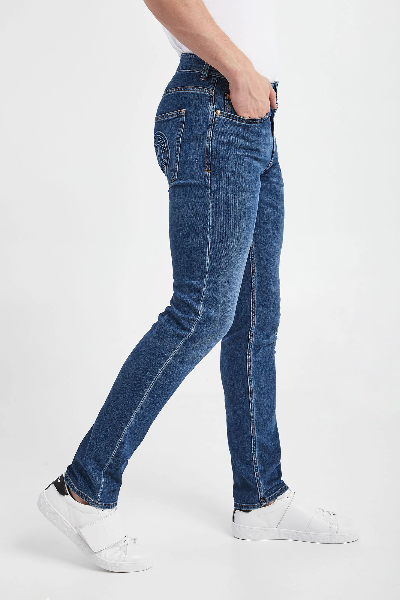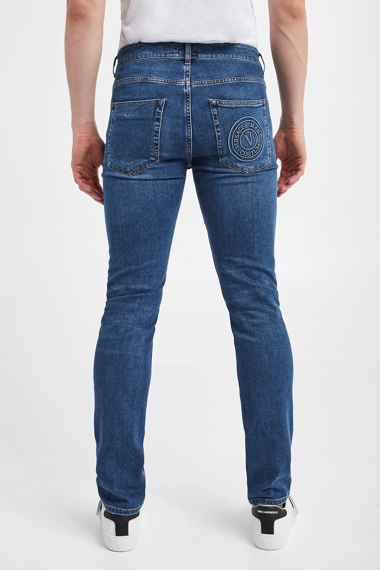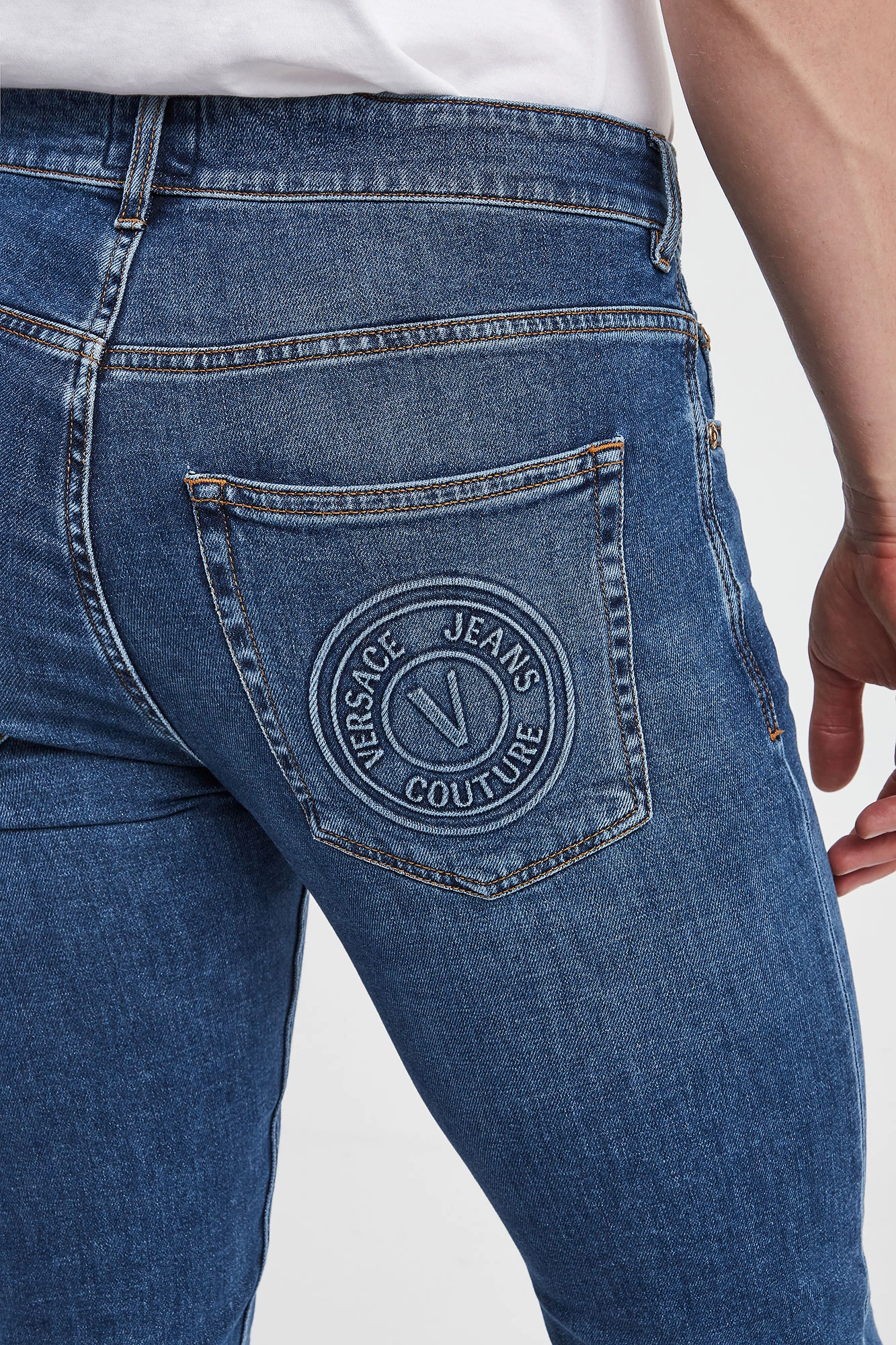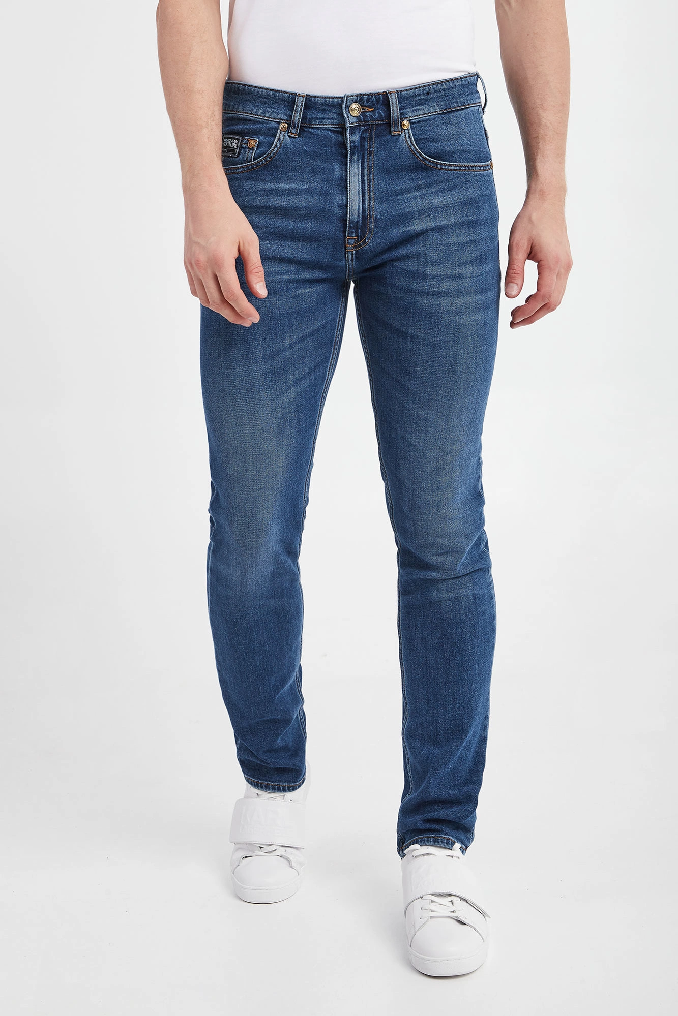 Jeansy marki Versace Jeans Couture w niebieskim kolorze. Fason typu slim. Zapinane za pomocą zamka i złotego, sygnowanego guzika. Model z pięcioma kieszeniami. W pasie szlufki. Spodnie wykończone beżową nicią. Wykonane z bawełnianej tkaniny z domieszką elastanu.