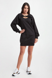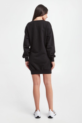 Sukienka dresowa marki Versace Jeans Couture w czarnym kolorze. Na piersi wycięcie ozdobione złotą, logowaną klamrą. Okrągły dekolt. Długie rękawy i dół zakończone prążkowanymi ściągaczami. Obniżona linia ramion. Fason typu relaxed, długość mini. Wykonana z czystej bawełny.