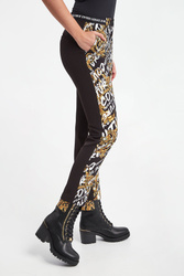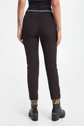 Spodnie marki Versace Jeans Couture w czarnym kolorze. Na froncie złote, barokowe wzory oraz białe napisy w postaci nazwy marki. Zapinane za pomocą zamka oraz sygnowanego guzika. Logowany pas. O kroju cygaretek. Na nogawkach kant. Dwie boczne, wpuszczane kieszenie. Fason typu regular.
