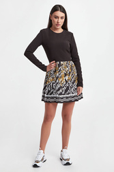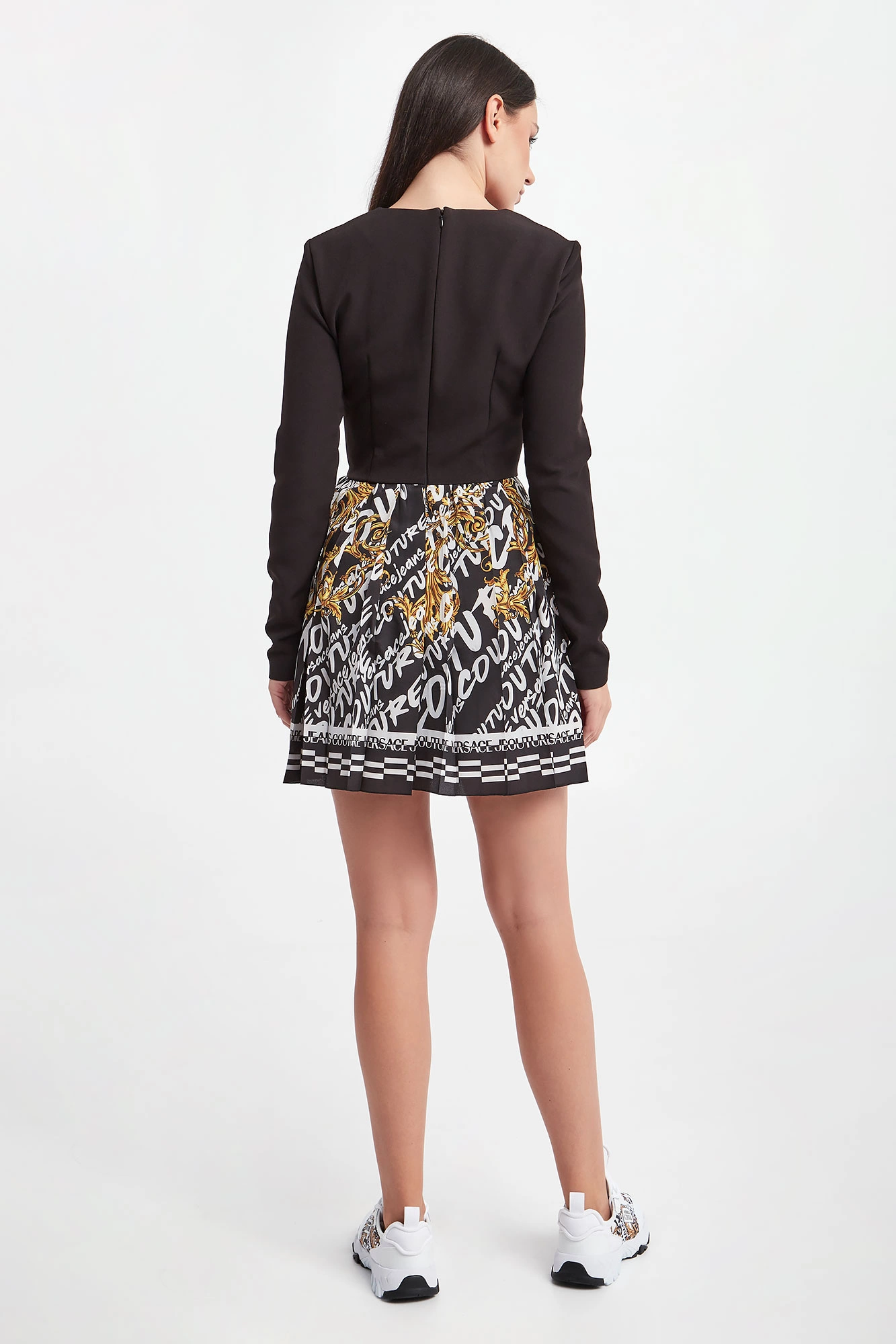Sukienka marki Versace Jeans Couture w czarnym kolorze. Dół plisowany, ozdobiony złotymi, barokowymi wzorami oraz białymi napisami z nazwą marki. Dekolt typu o-neck. Długie rękawy zakończone lamówką. Zapinana za pomocą tylnego zamka. Fason typu regular, długość mini.