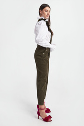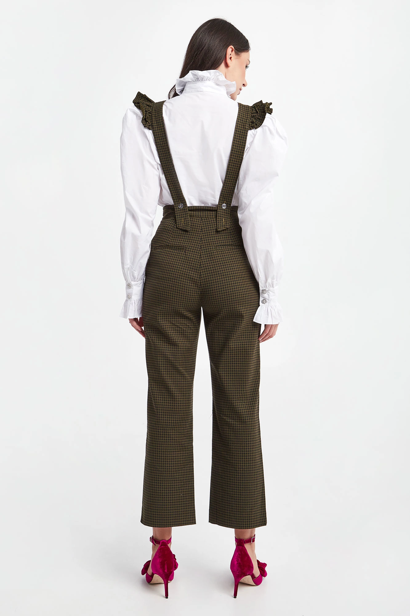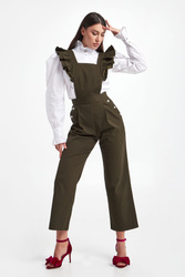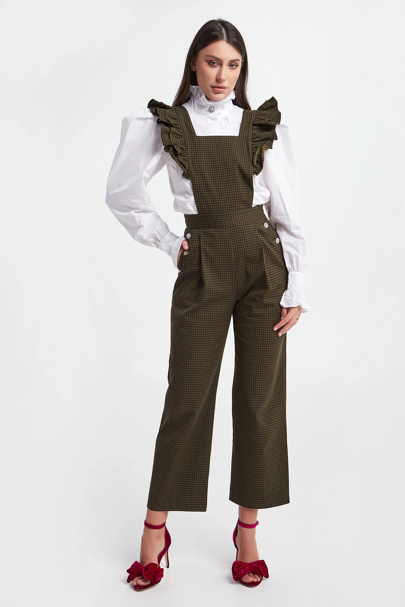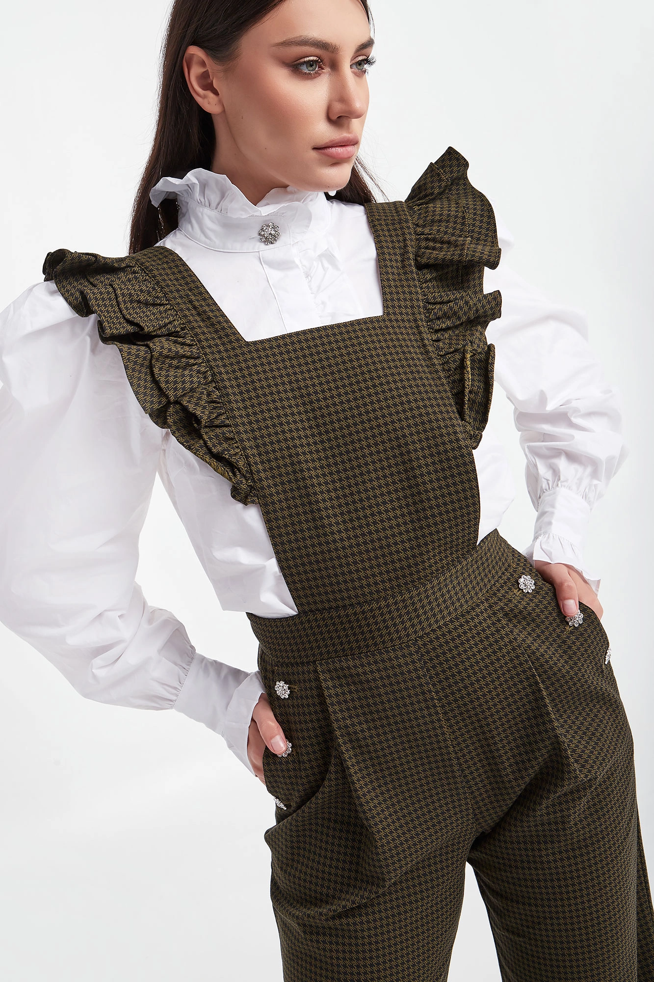 Kombinezon marki Custommade w zielonoczarną pepitkę. Dekolt typu karo. Przód szelek zdobiony falbanami. Zapinany na zamek oraz wewnętrzny guzik. Na froncie zdobione kryształkami guziki. Z tyłu wsuwane kieszenie. Wykonany z bawełnianej tkaniny. Fason typu wide.