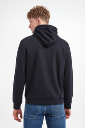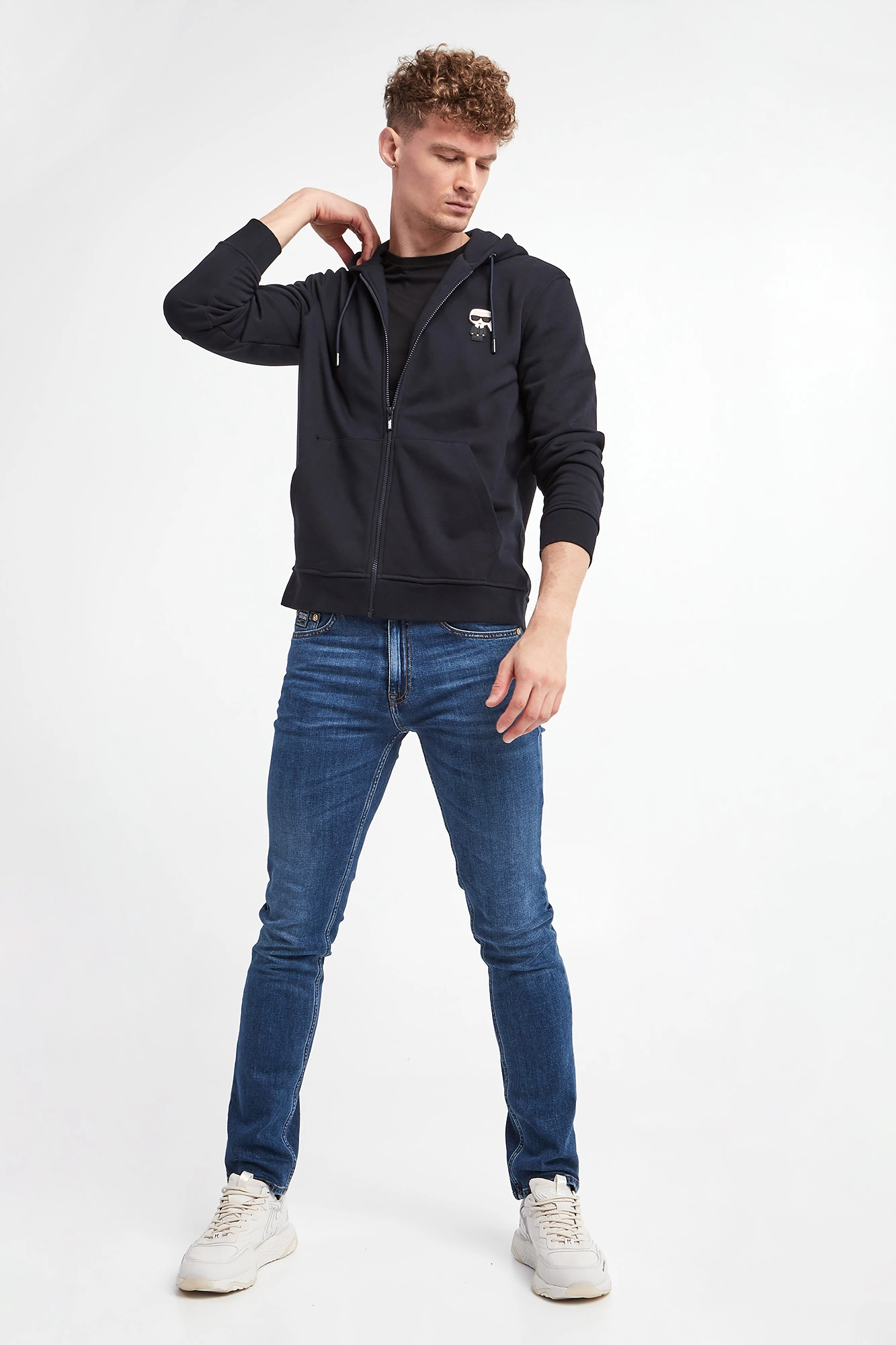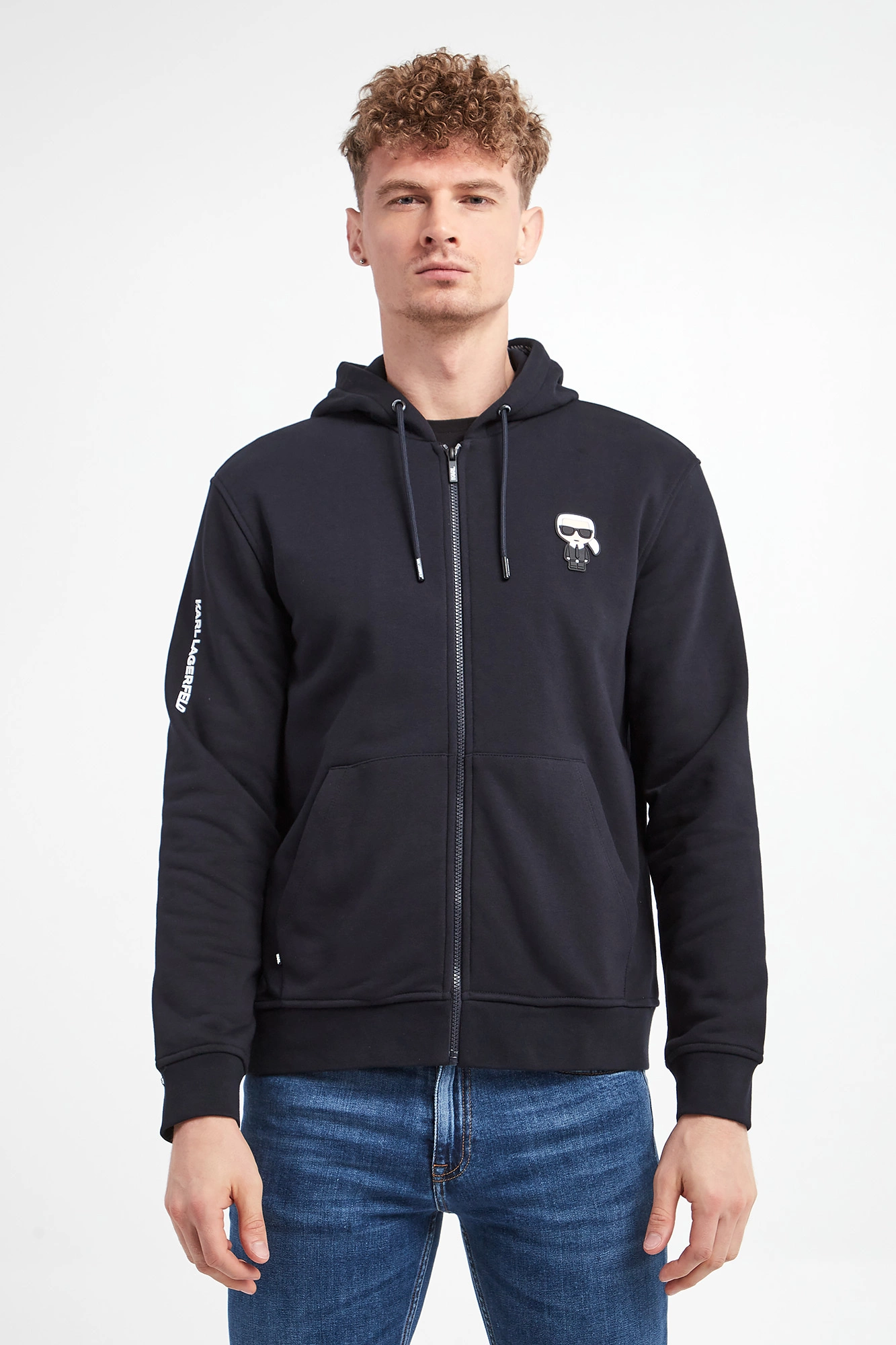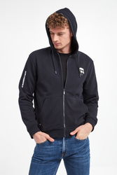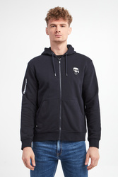 Bluza z kapturem marki Karl Lagerfeld w granatowym kolorze. Z boku gumowana naszywka z wizerunkiem założyciela marki. Zapinana na zamek sygnowaną zawieszką. Na ramieniu i kapturze białe logo. Dwie boczne, wpuszczane kieszenie. Długie rękawy i dół zakończone ściągaczami. Fason typu regular. Wykonana z bawełnianej tkaniny z domieszką elastycznych włókien.