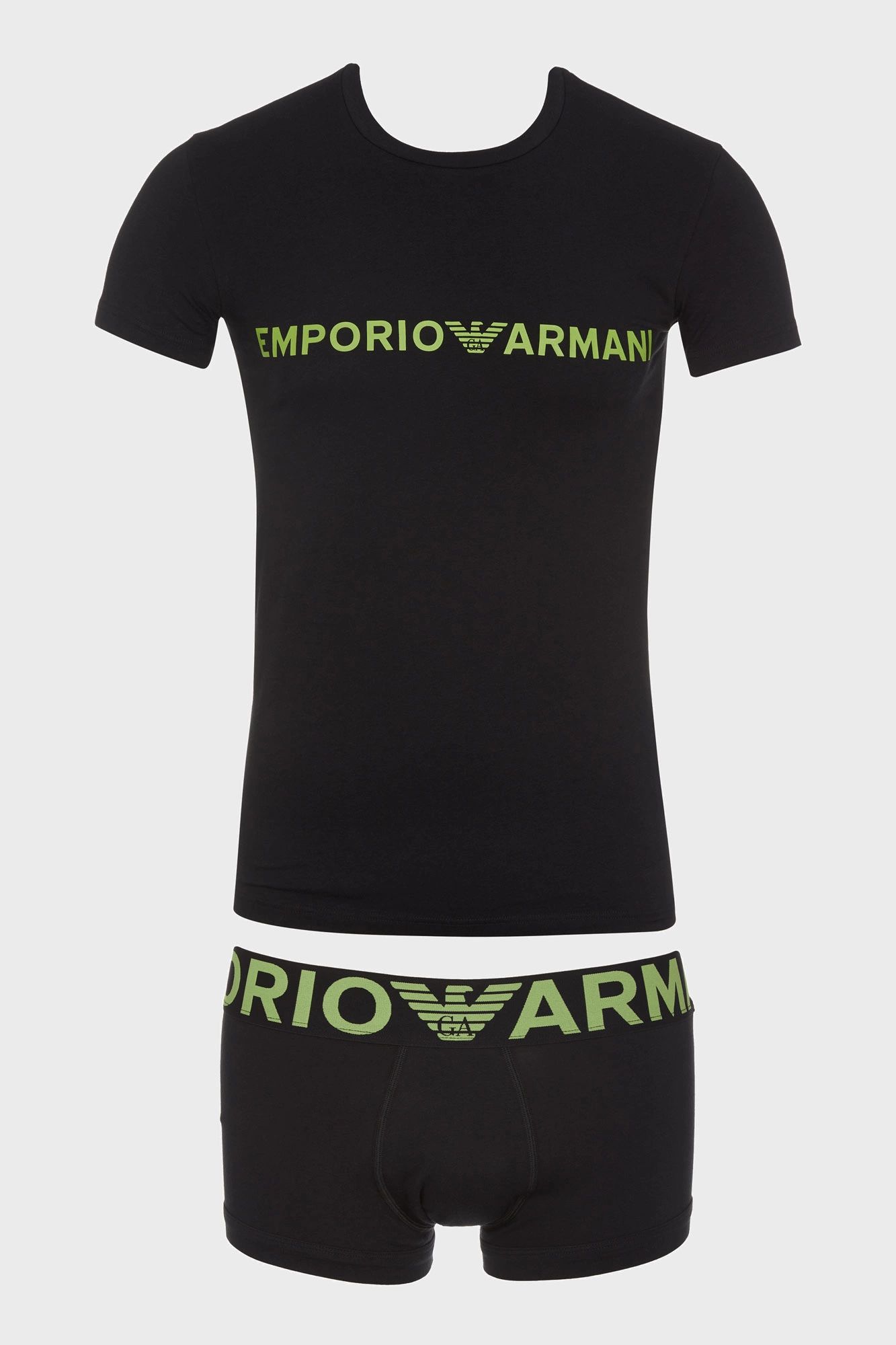 Komplet bielizny marki Emporio Armani w kolorze czarnym. Bokserki wykończone ściągaczem z neonowozielonym logowaniem. Na koszulce nadruk z logo marki. Wykonane z materiałów pochodzących z recyklingu i organicznych.