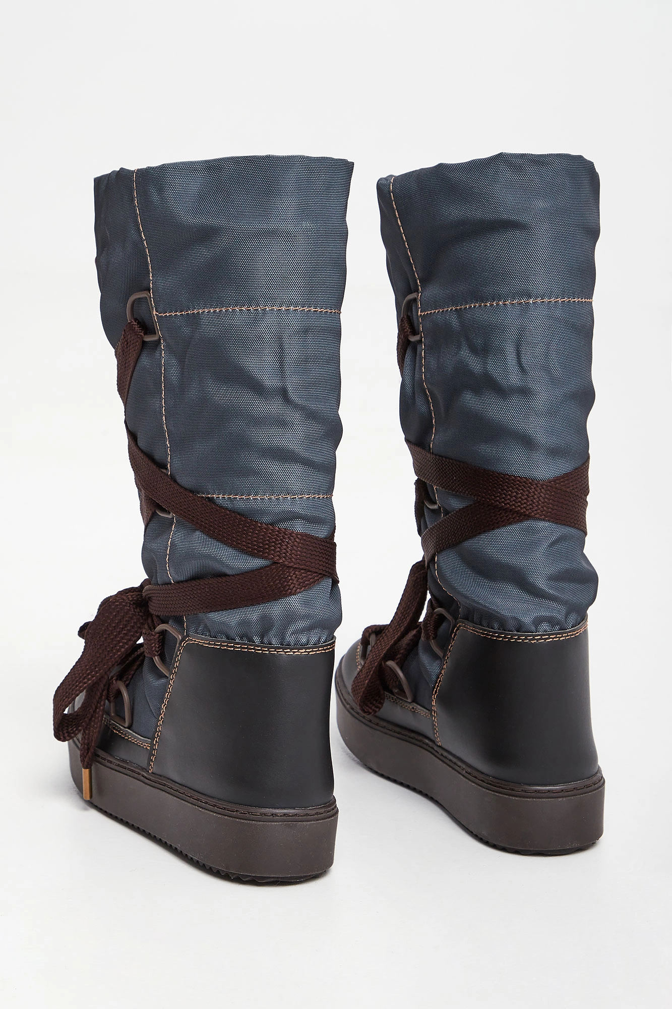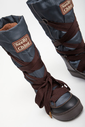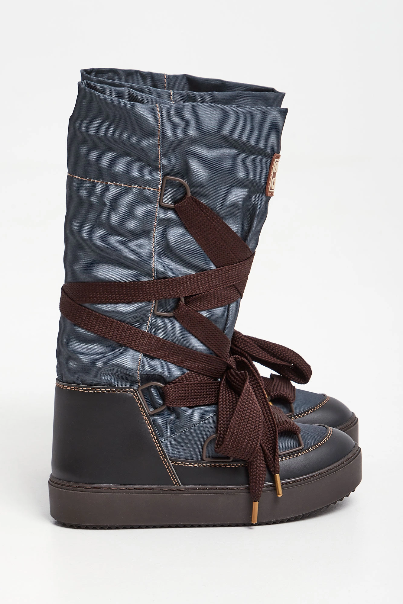 Śniegowce marki See by Chloé w niebieskim kolorze. Wiązane za pomocą szerokich, plecionych sznurówek. Na noskach i piętach granatowe, skórzane wstawki. Na froncie gumowana, logowana naszywka. W środku ocieplane futrem. Na całości ozdobne przeszycia. Wykonane ze skóry naturalnej.