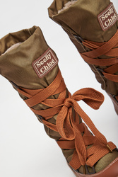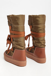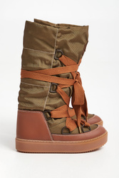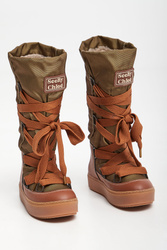Śniegowce marki See by Chloé w kolorze khaki. Wiązane za pomocą szerokich, plecionych sznurówek. Na noskach i piętach brązowe, skórzane wstawki. Na froncie gumowana, logowana naszywka. W środku ocieplane futrem. Na całości ozdobne przeszycia. Wykonane ze skóry naturalnej.