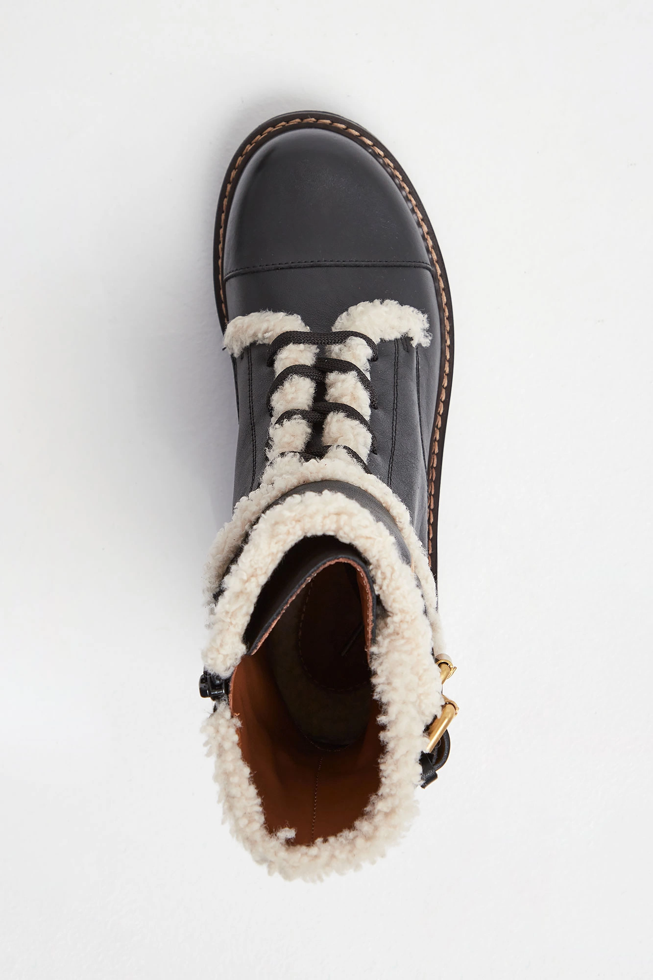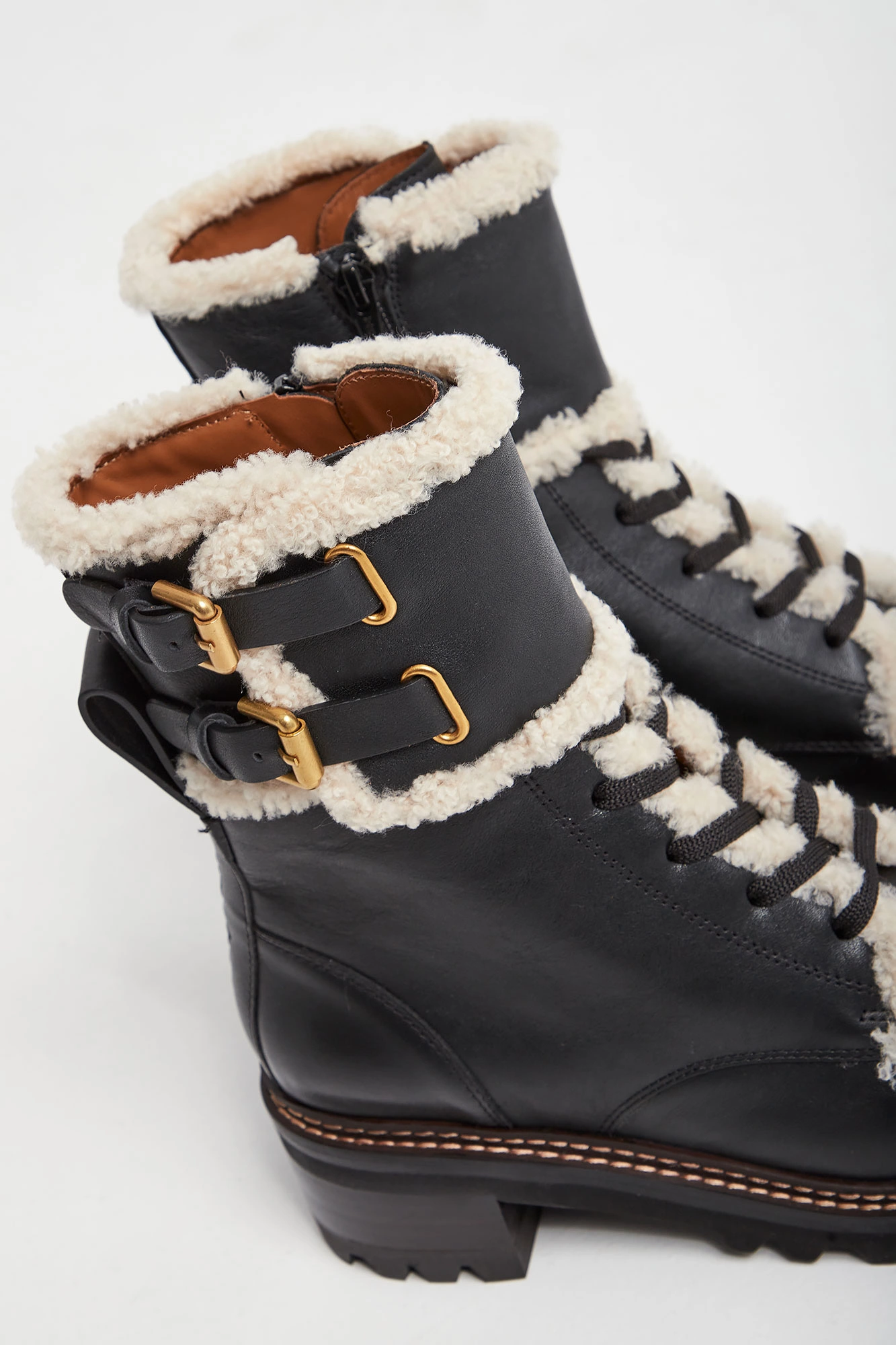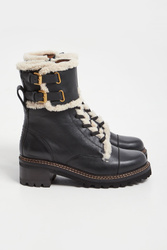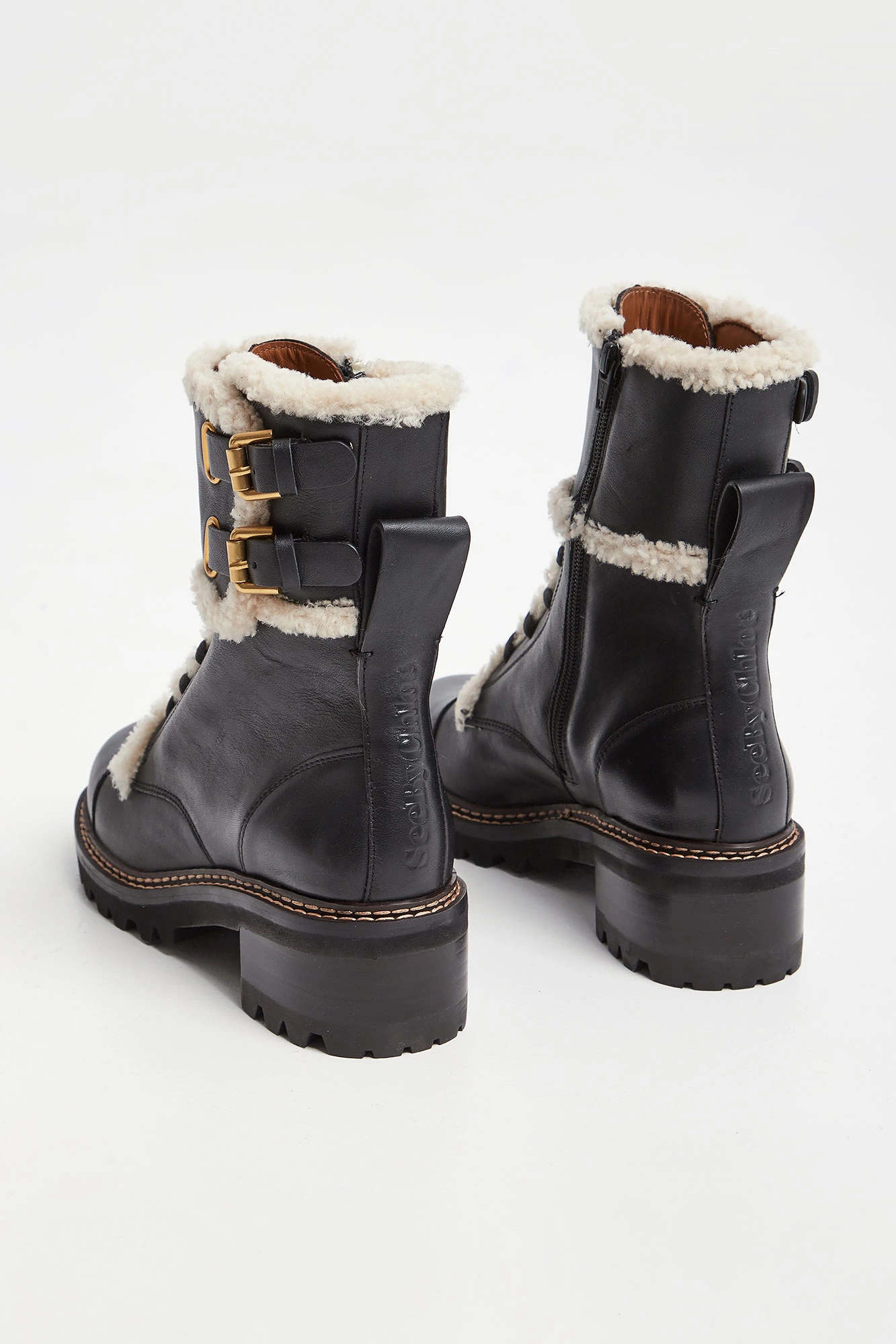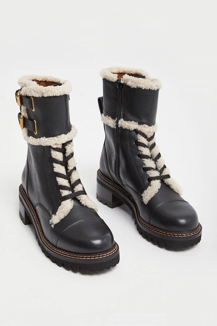 Skórzane trapery marki See by Chloé w czarnym kolorze. Wnętrze ozdobione kremowym futerkiem. W stylu wojskowych opinaczy. Zapinane za pomocą bocznego zamka i wiązane z przodu. U góry dodatkowy pas zapinany za pomocą dwóch złotych sprzączek. Zaokrąglone noski. Wewnątrz brązowe.