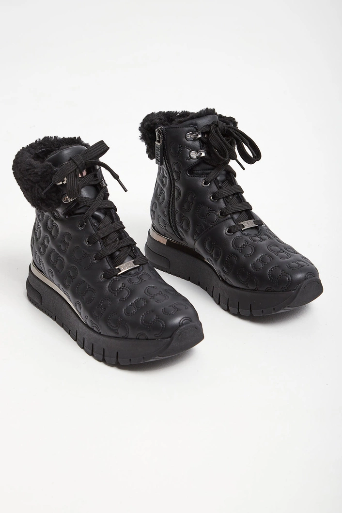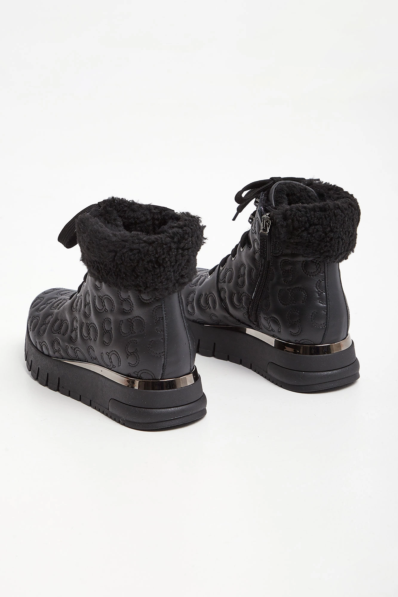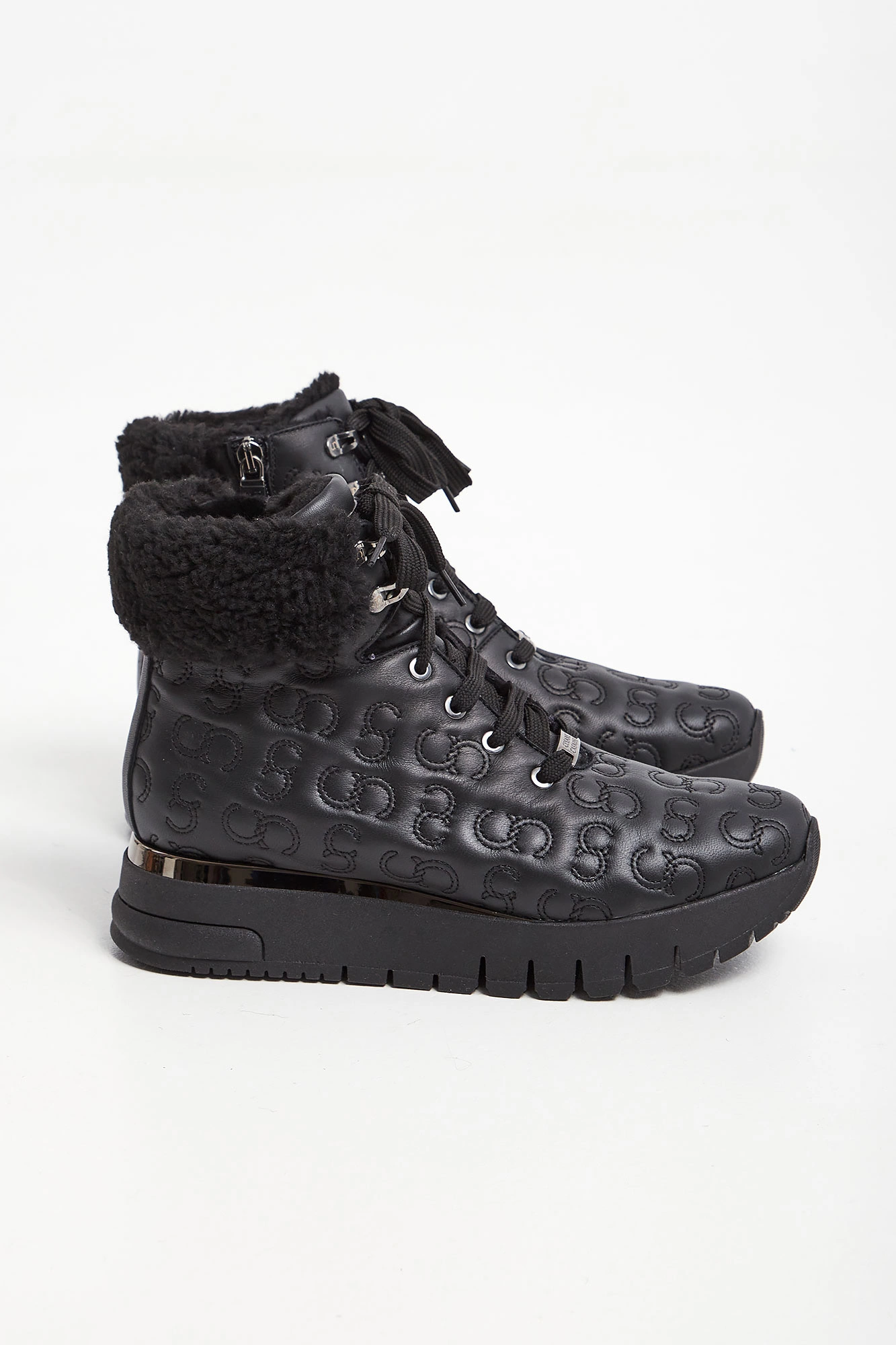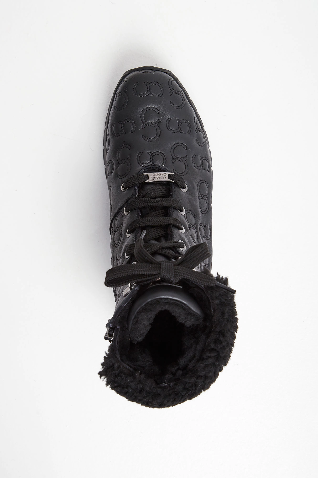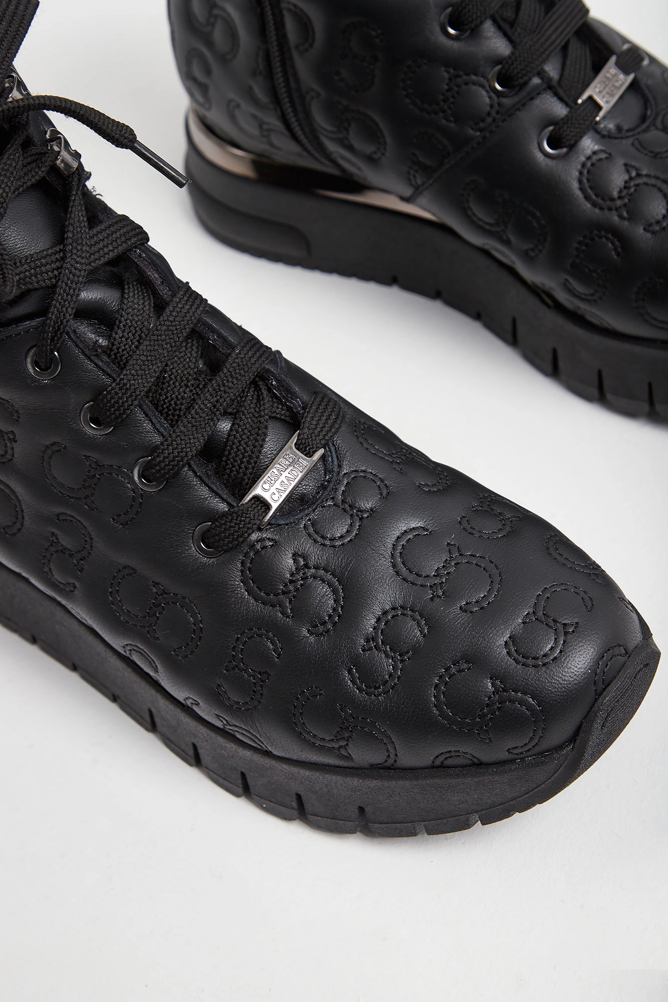Skórzane sneakersy marki Cesare Casadei w czarnym kolorze. Na całości haftowany wzór z logo marki. Wiązane z przodu i zapinane po bokach. Przy sznurówkach haczyki ułatwiające wiązanie oraz sygnowane blaszki. Cholewki wykończone czarnym futerkiem. Zaokrąglone noski. Przy czarnych podeszwach srebrne, połyskujące wstawki.